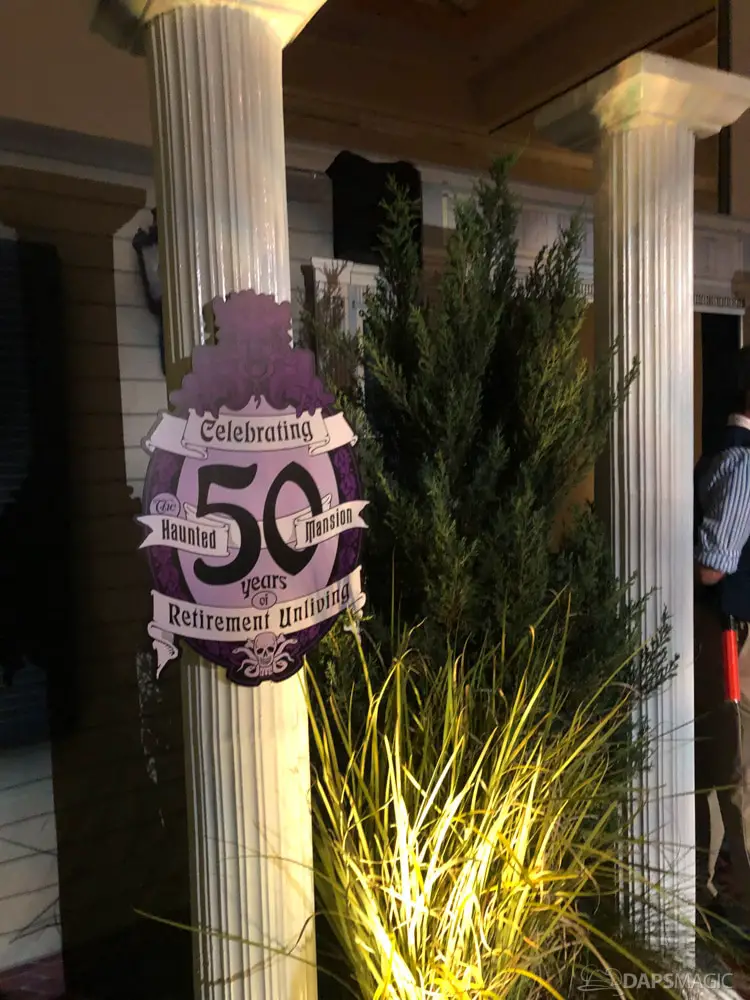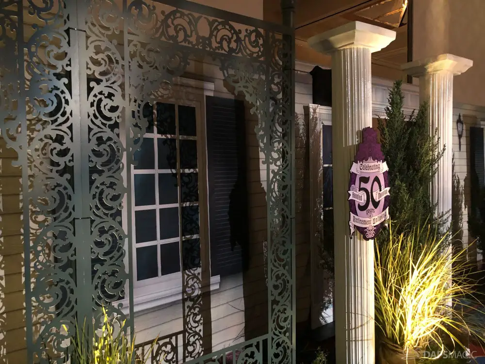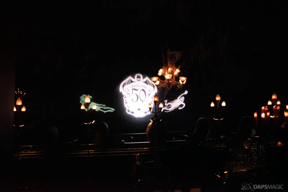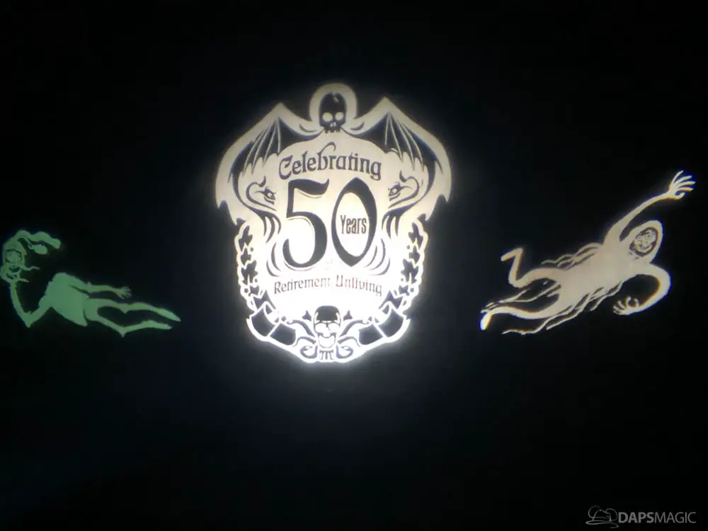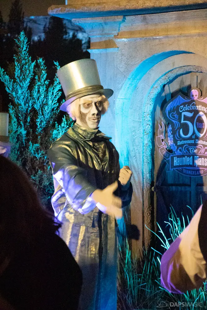 The ride was the highlight for me. At this event was a special edition of the already great attraction. There were surprises inserted into the ride. A projection at the Doombuggy loading area highlighted the 50th anniversary logo. In the seance scene was the same logo in the back of Madame Leota. Three live performers were in various scenes. The first was a knight at the entry of the never-ending hallway. In the ballroom scene was an extra ghost at the birthday table that would be blown out with the rest but reappearing to converse with the other materialized guests. For the hitchhiking ghosts, the Gus animatronic was replaced with a live Gus to try to scare unsuspecting guests.