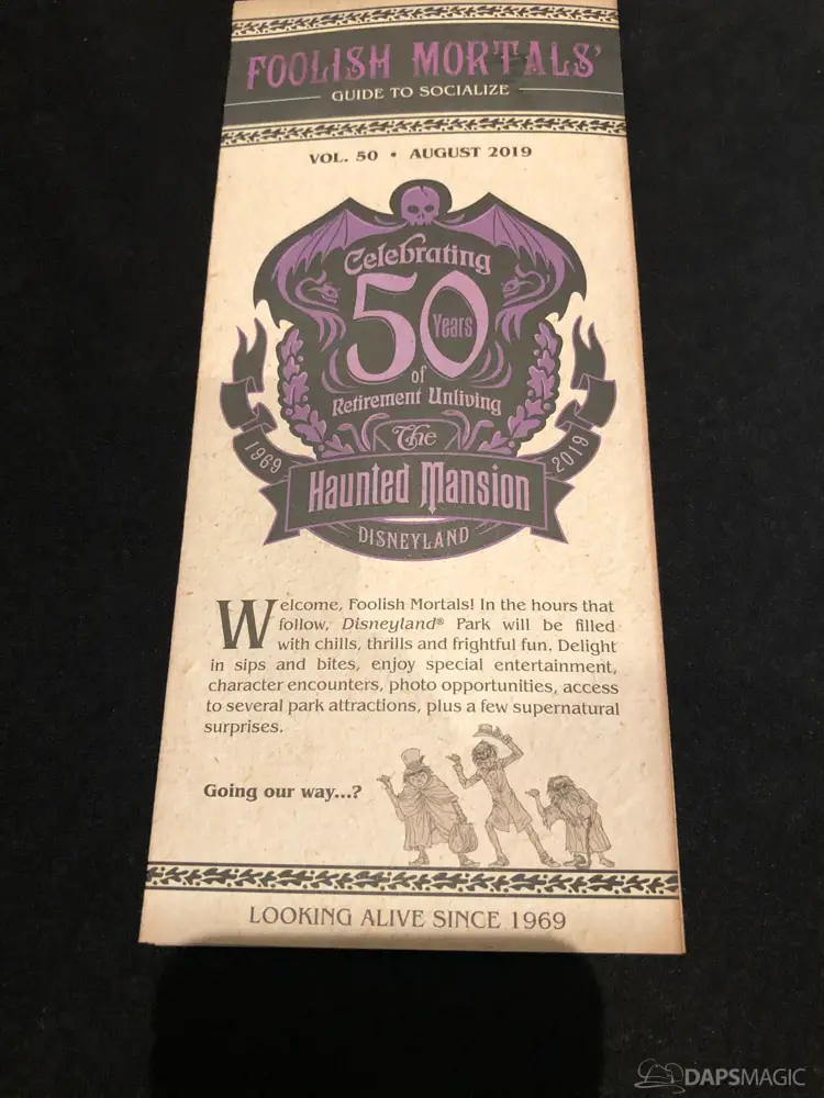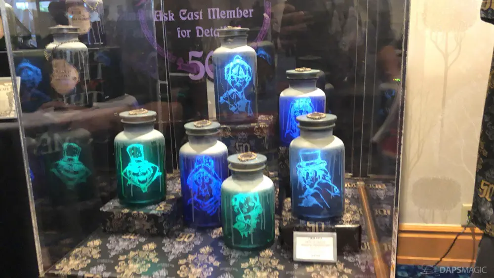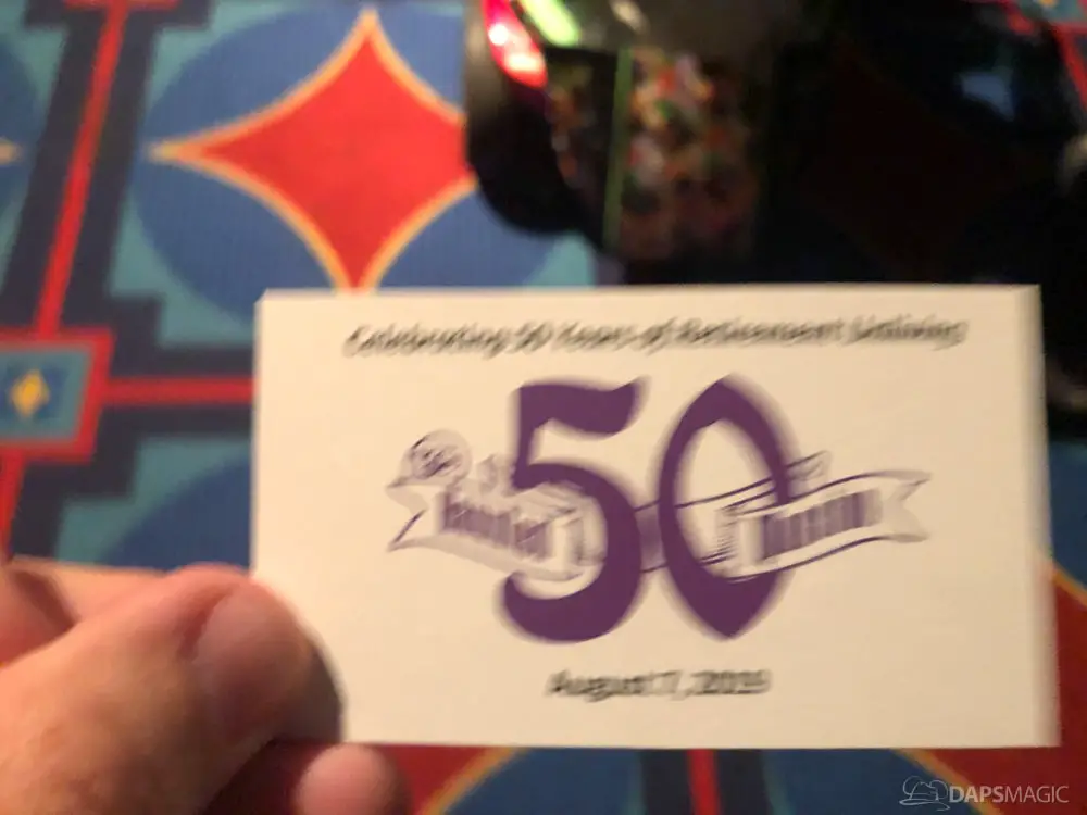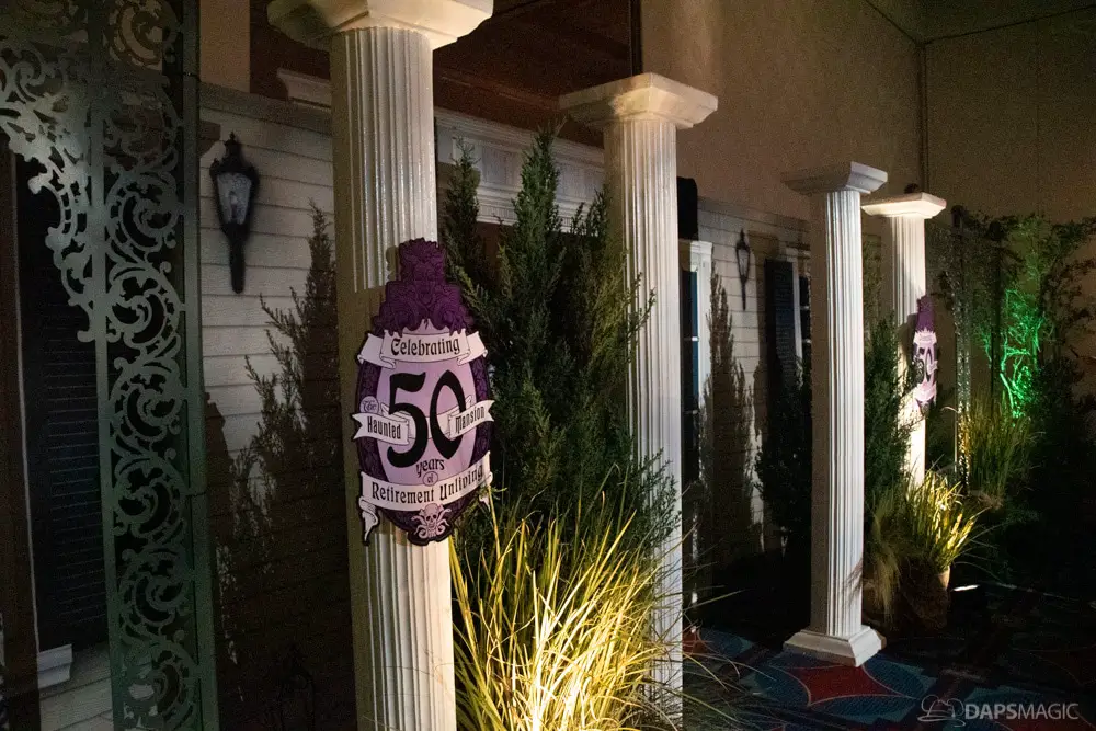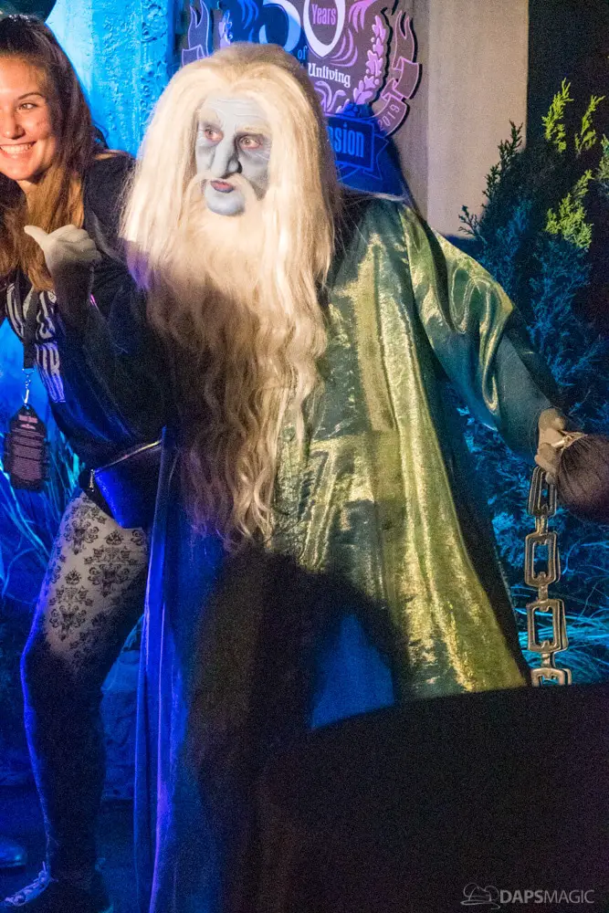 The ride was the highlight for me. At this event was a special edition of the already great attraction. There were surprises inserted into the ride. A projection at the Doombuggy loading area highlighted the 50th anniversary logo. In the seance scene was the same logo in the back of Madame Leota. Three live performers were in various scenes. The first was a knight at the entry of the never-ending hallway. In the ballroom scene was an extra ghost at the birthday table that would be blown out with the rest but reappearing to converse with the other materialized guests. For the hitchhiking ghosts, the Gus animatronic was replaced with a live Gus to try to scare unsuspecting guests.