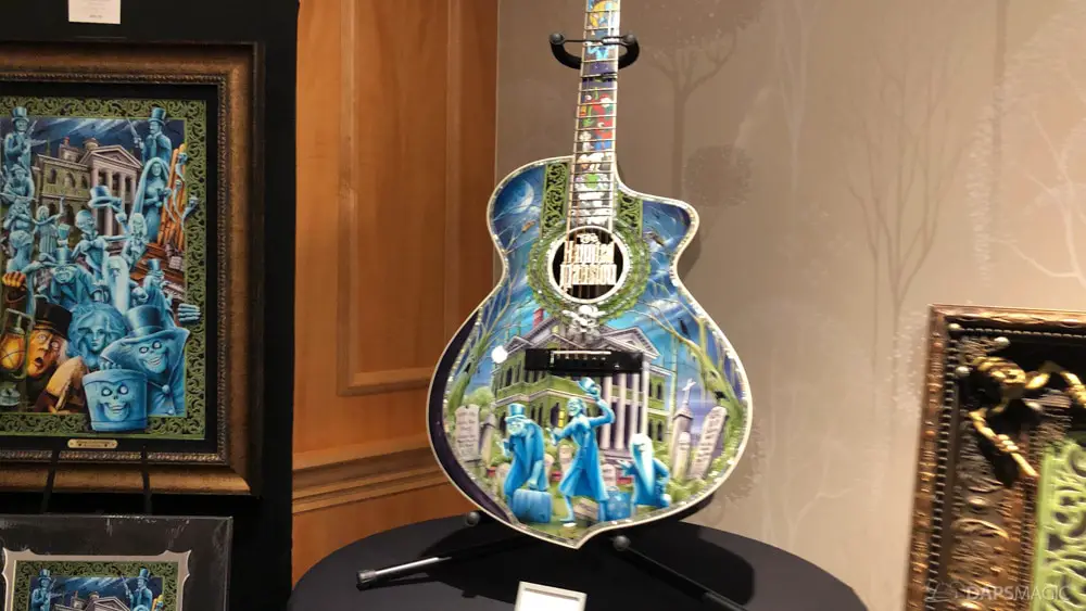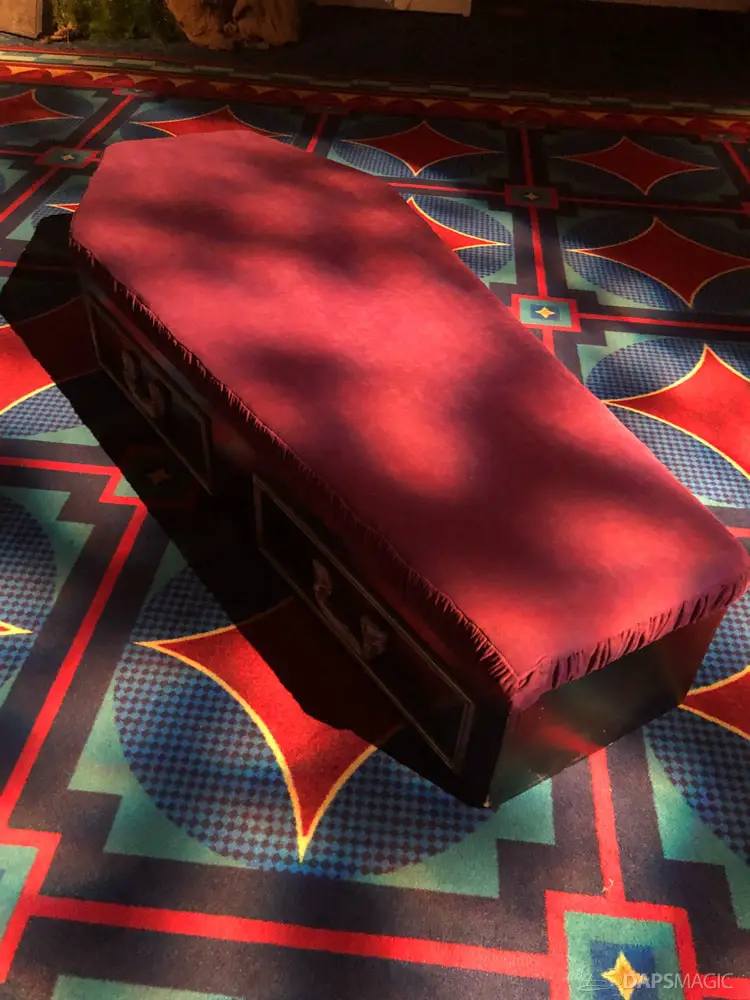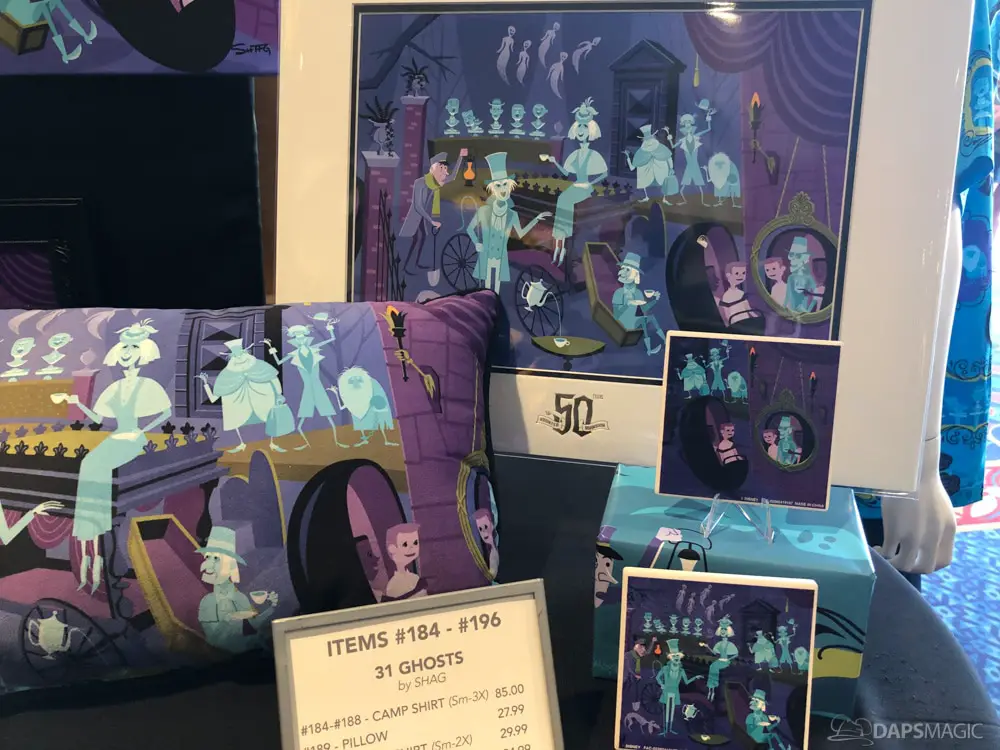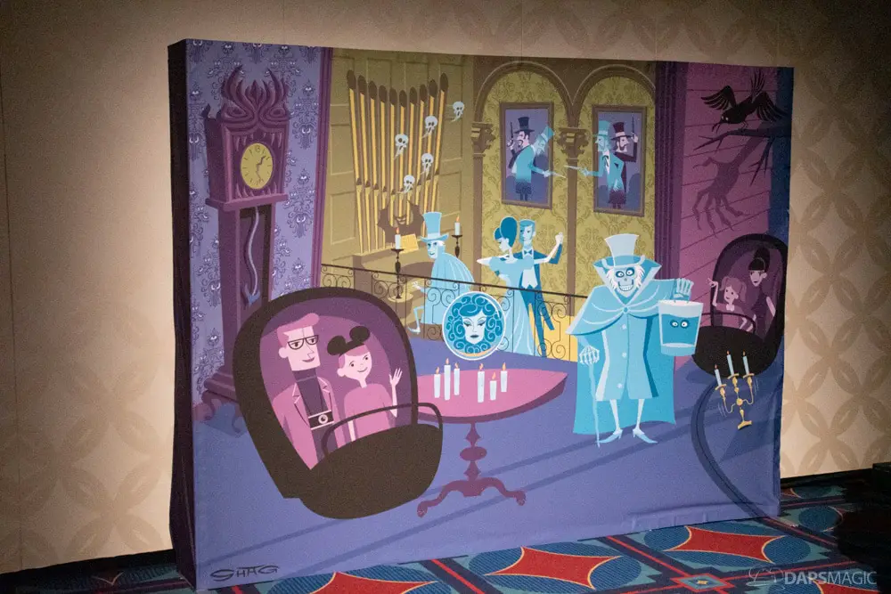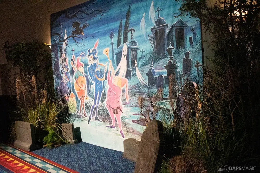 The next room had several photo opportunities. The first was an attraction poster recreation where guests could be inserted in. The next was an animatronic of the infamous coffin where a ghoul is just dying to meet you. A D23 backdrop followed the animatronic. Then a backdrop of artwork on an LP soundtrack from opening and two SHAG artwork backgrounds rounded out the possible photo stops. PhotoPass was at each and some special borders were enabled by them when photos were downloaded.