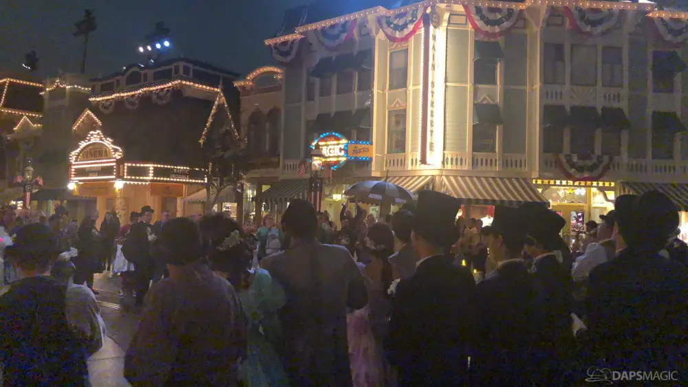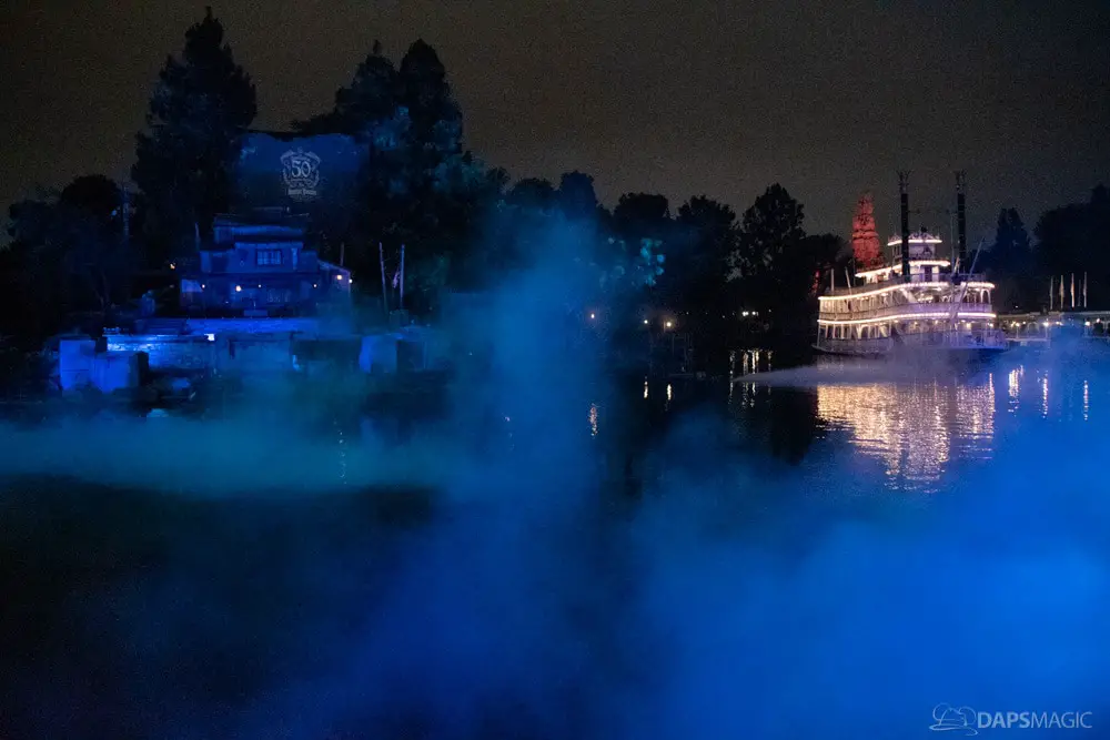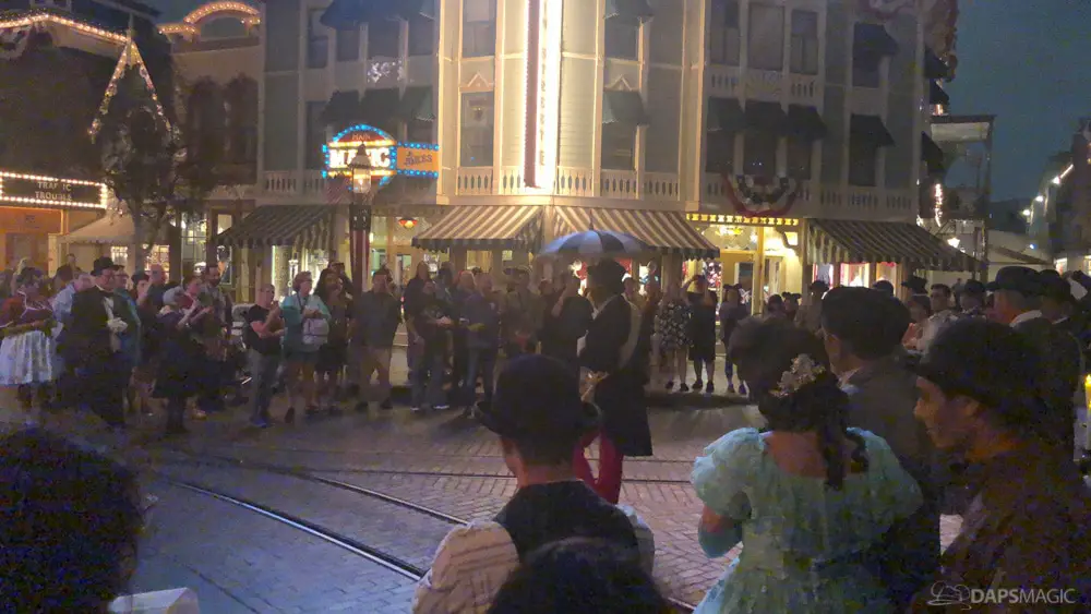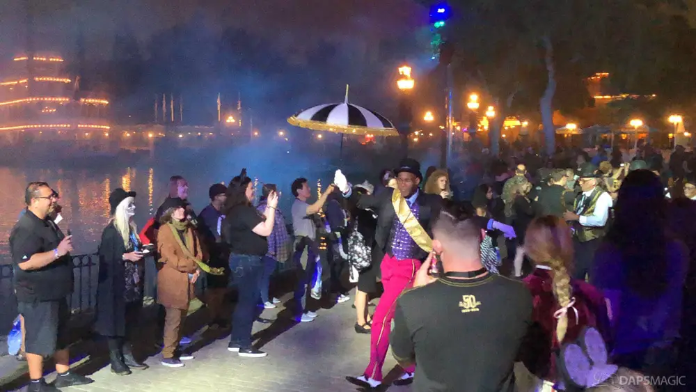 Where all the merchandise and check-in events took place during the daytime, the big party was at night starting at the “13th hour.” Lining up started at 11:30 pm at the gates of Disneyland. Guests were let in a little before 12:30 am to be escorted down Main Street to enter into Frontierland for the party. As we were held before the 1 am start time by the Mark Twain dock, Scarolers sang a few tunes to entertain.