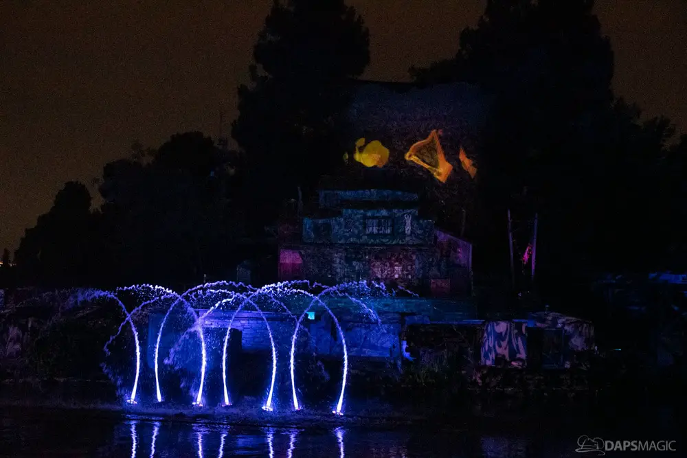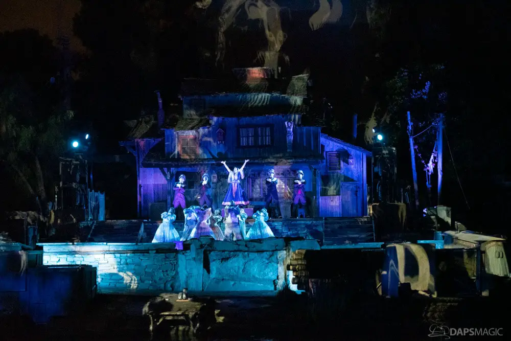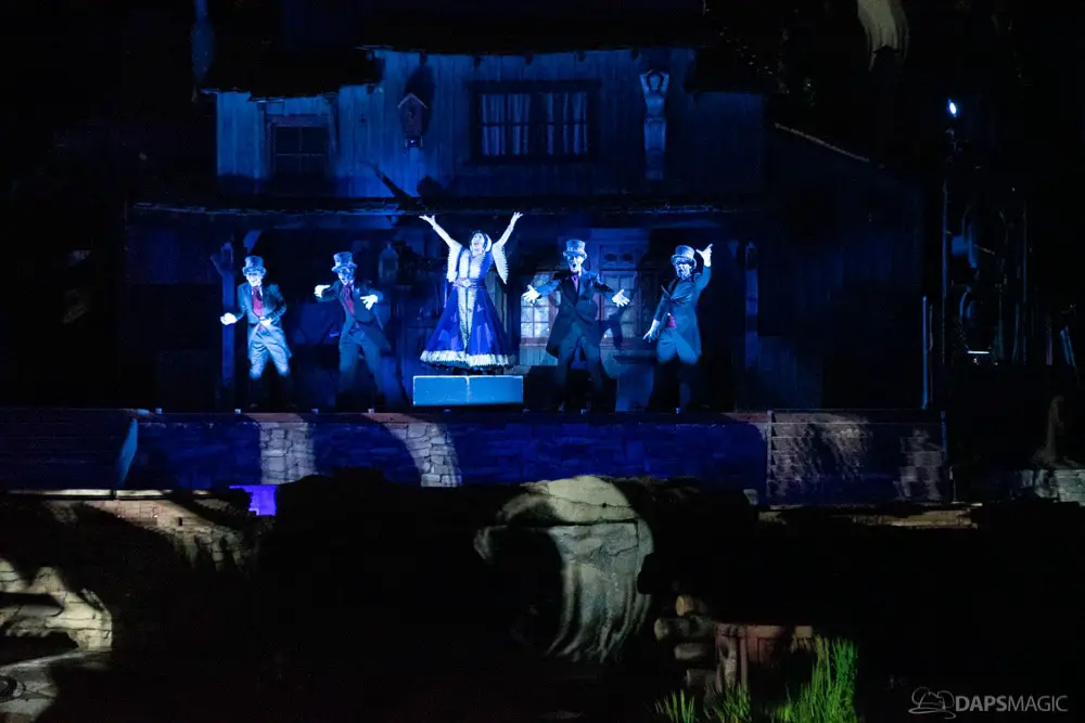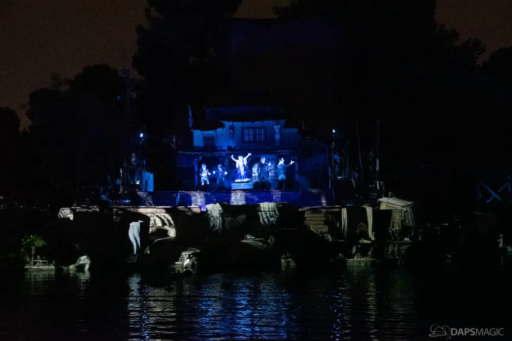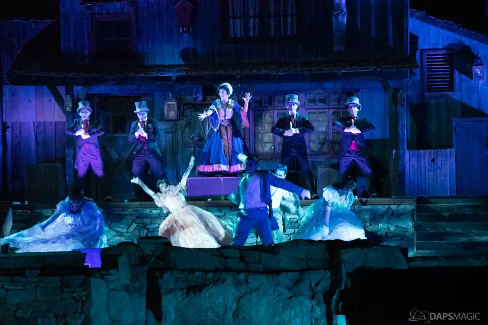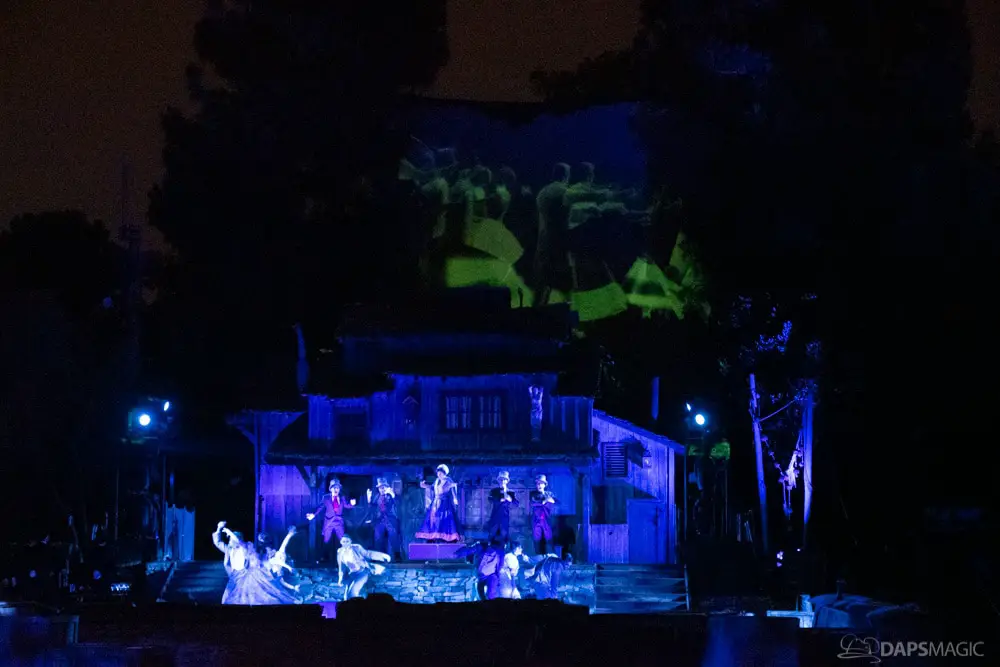 The Ghost Host made announcements throughout the night and started by describing what was going to happen at the start. A little before 1 am, guests were escorted to the Rivers of America viewing area. The 13th Hour show kicked the night off with a very festive showcase of projection, pyro, fountains, and characters from the Mansion dancing and singing.