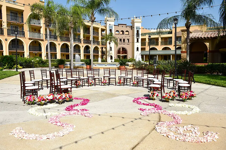 Another private location at Disney’s Coronado Springs Resort, this location is ideal for receptions. It is flanked by palm trees and other greenery. With beautiful lights hanging above, it is a wonderful space to dance the night away!