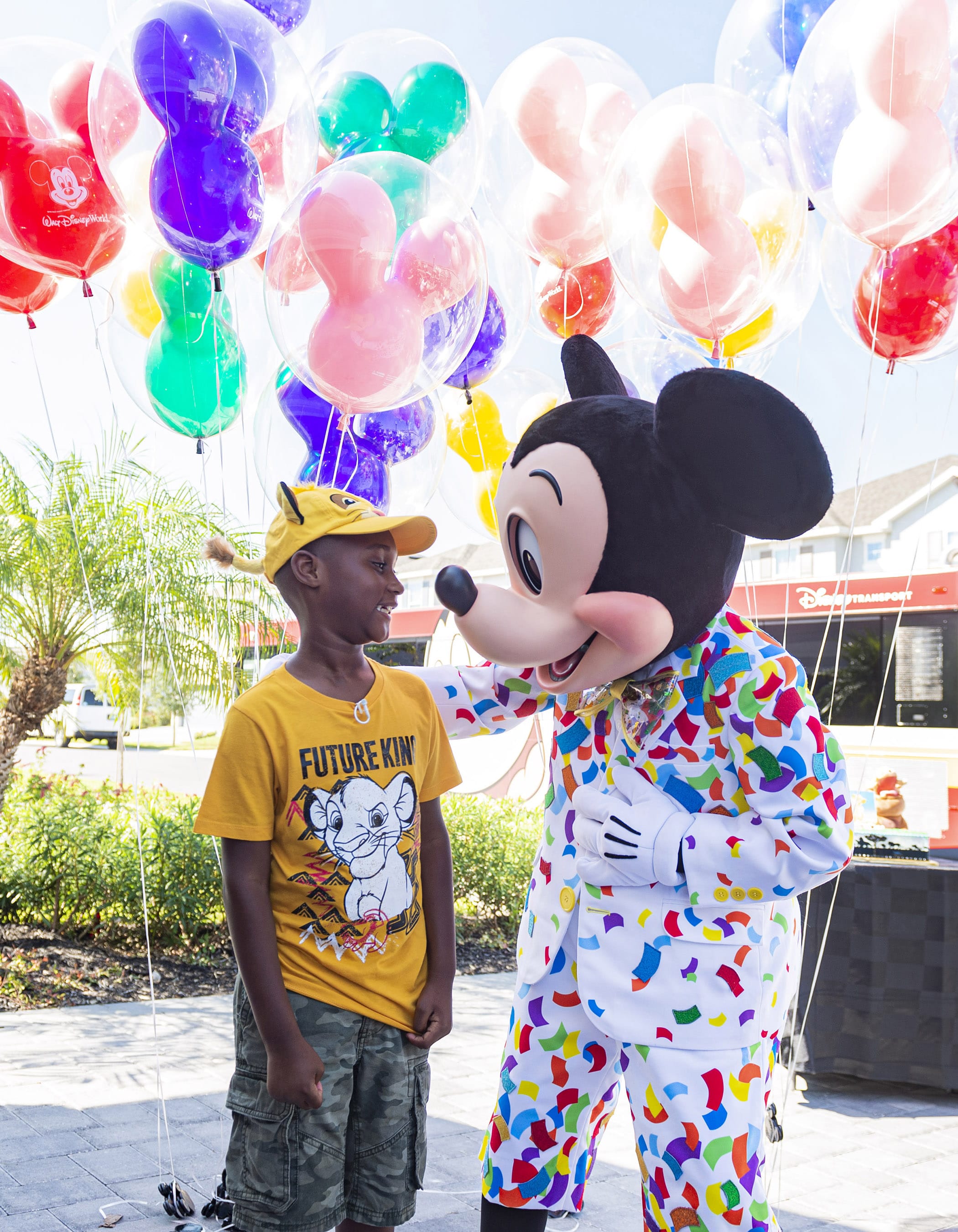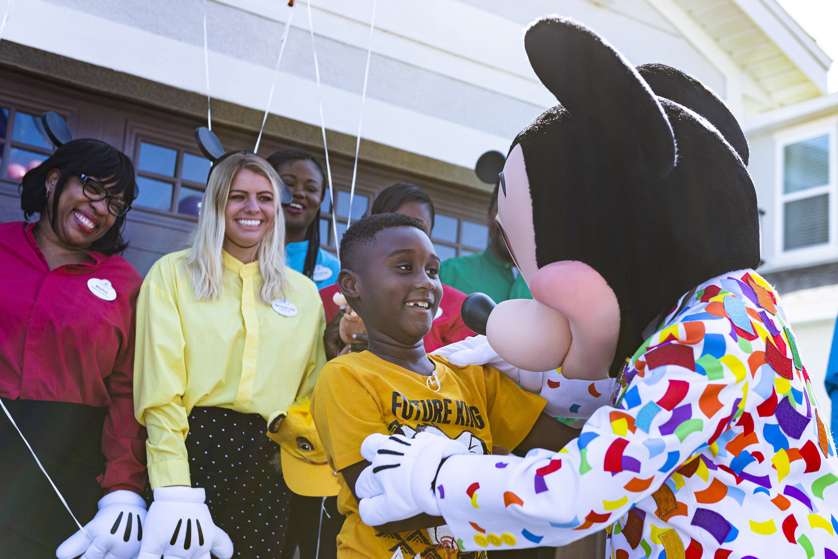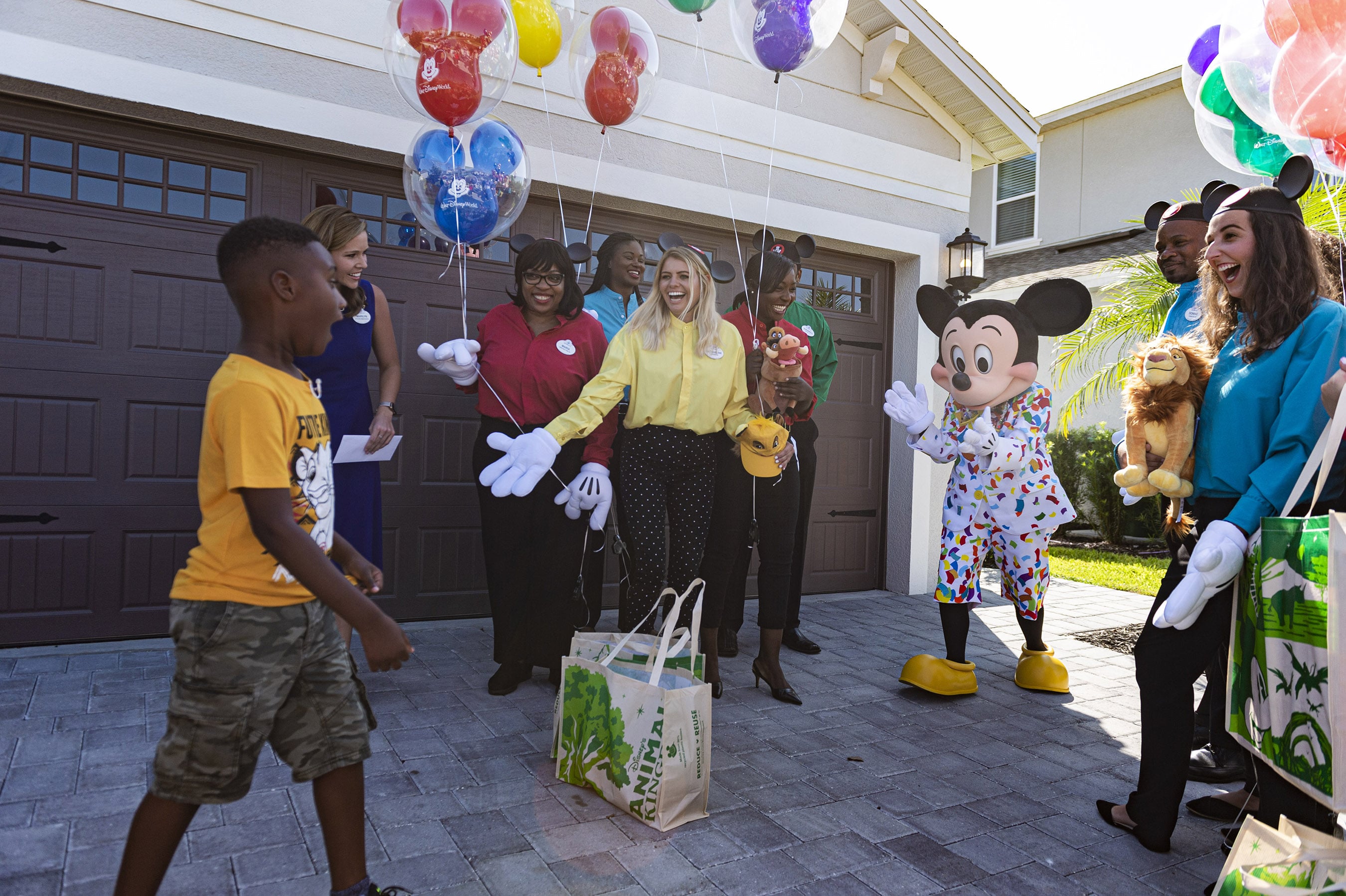 Mickey Mouse makes a surprise appearance at seven-year-old Jermaine Bell’s birthday party Sept. 8, 2019, in Kissimmee, Fla. Mickey and Walt Disney World cast members were there to honor Jermaine who used money he’d saved for a Walt Disney World vacation to feed people fleeing Hurricane Dorian. Adding to a day filled with surprises, Jermaine learned that he and his family will be guests of Disney for a VIP getaway to the vacation kingdom later this month. (Disney)