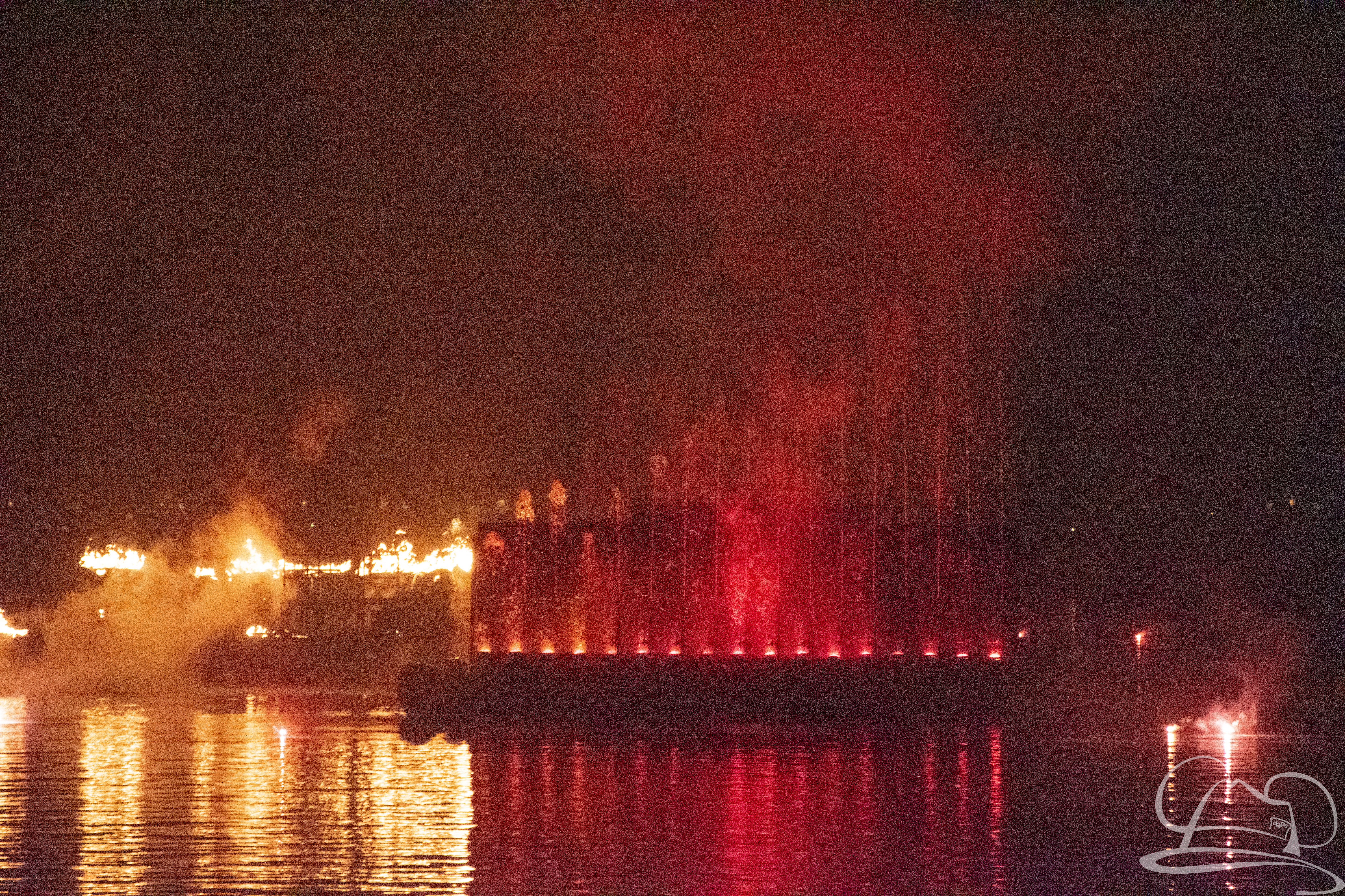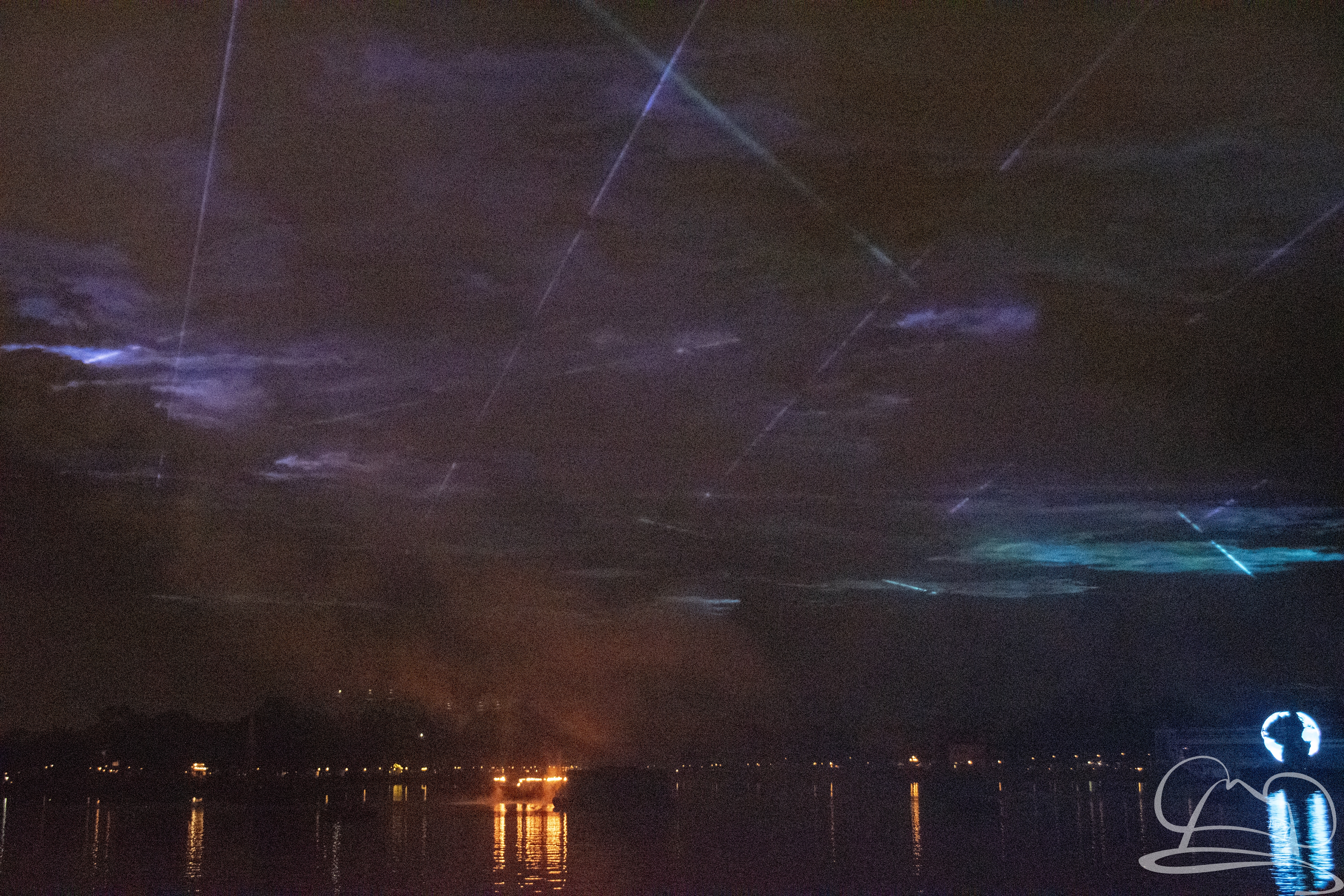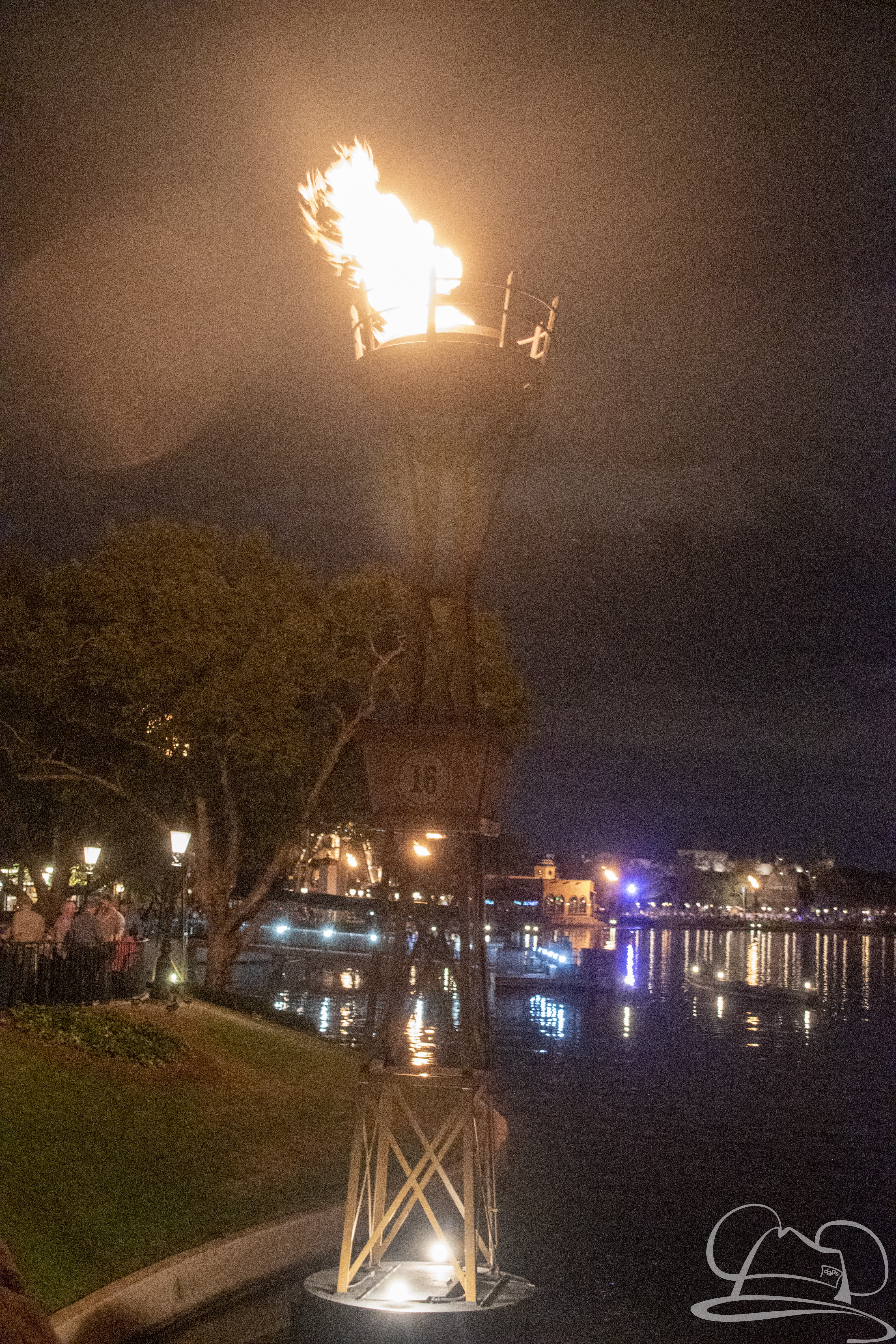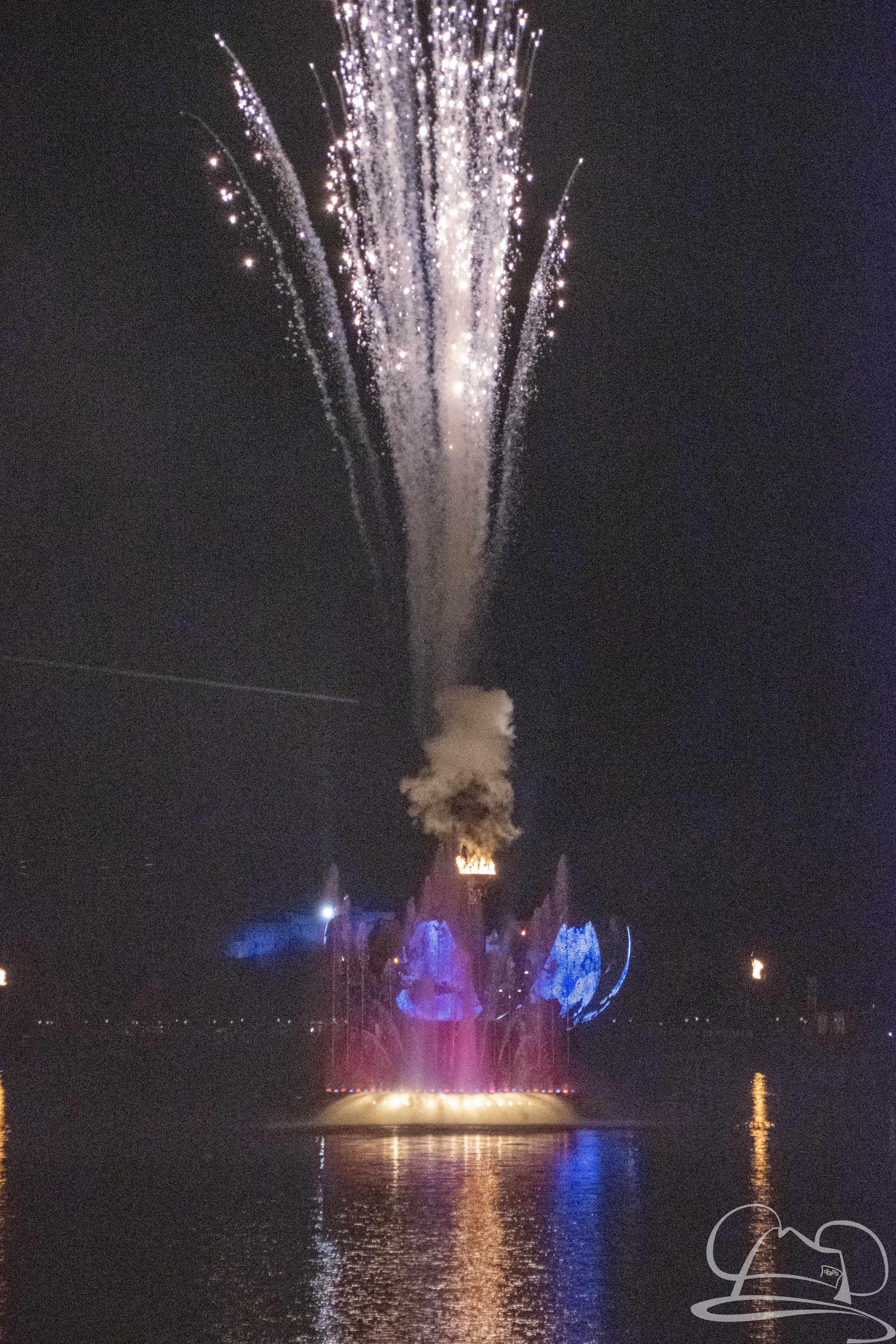 The conclusion starting with We Go On has the globe show a line of people carrying candles, and representing much of the nations around the world. The spectacular end of the show has the floating sphere open up to have a giant torch. Pyro shoots from around the lagoon right in front of the audience, then suddenly, fireworks shoot from the center of the globe and from various barges around it.