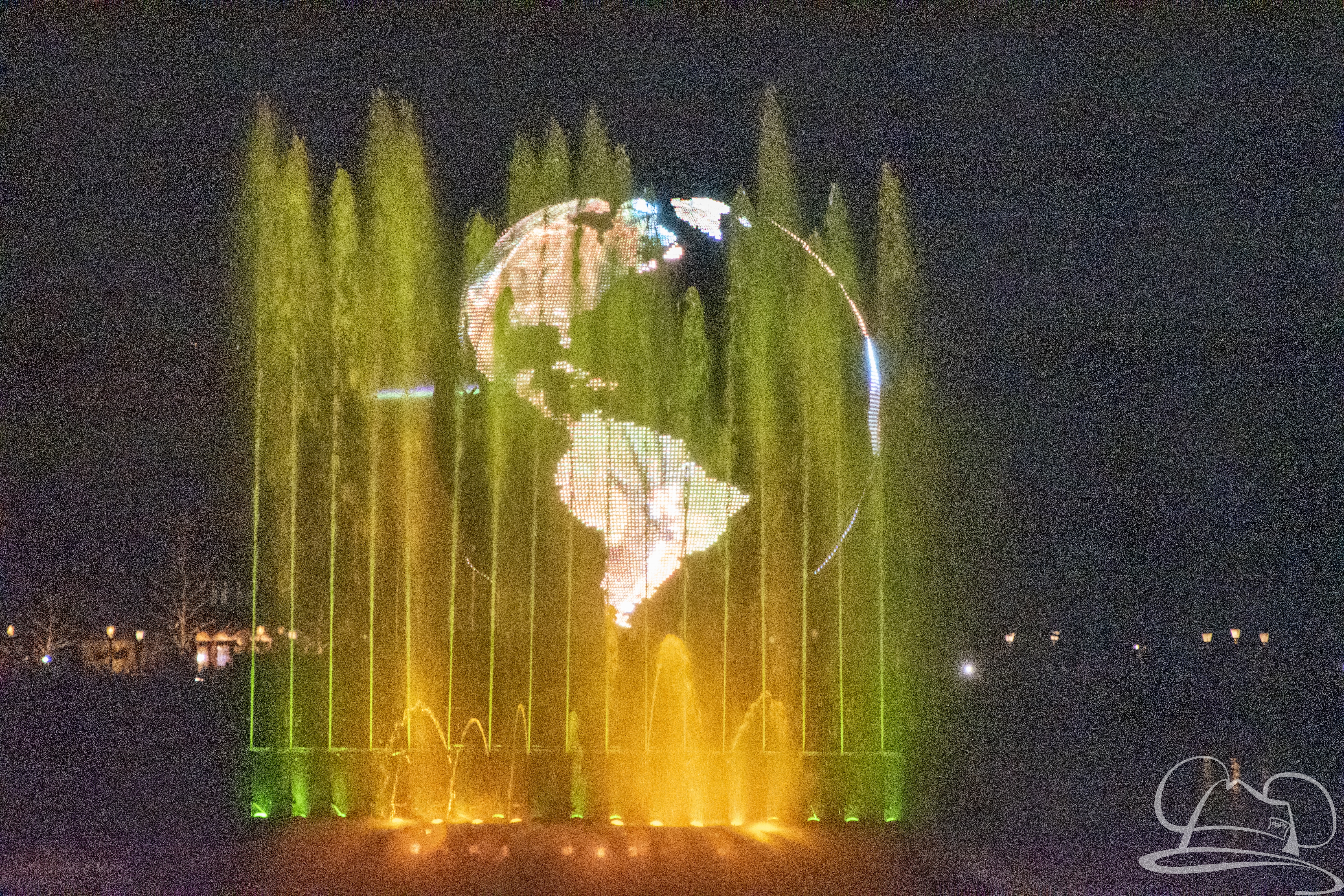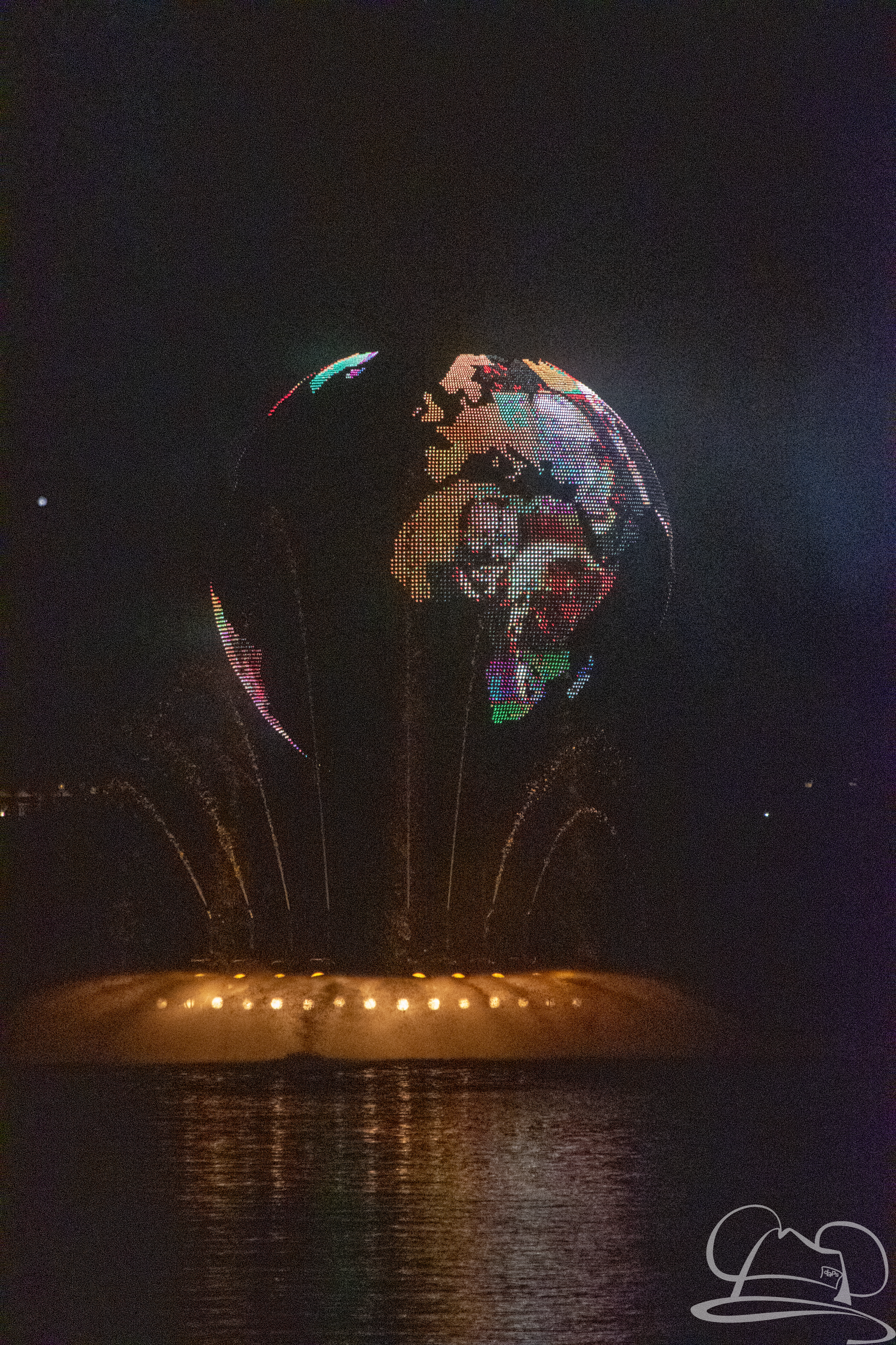 The show has a bit of an abstract plot. It starts at the beginning of the world with the infamous fire barge representing the formation of the Earth. From there, pyrotechnics and fountains show off more formation of the world. Eventually, a fiber optic LED globe floats out onto the water with images of animals. The images start changing to formations of cultures and nations and people. As the show goes on, the buildings from various World Showcase pavilions begin to illuminate to surround the audience with the light show on the water. Images on the globe start to showcase famous representations of the human race.
