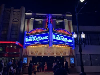After enjoying some time on Pixar Pier, we headed to Hollywood Land to check out the Mickey’s PhilharMagic marquee at night. There is some animation on the sign, and you can see some musical instruments and Donald Duck scroll across the attraction name roughly every three to four minutes. It’s a nice new sign, and a nice addition to this attraction.