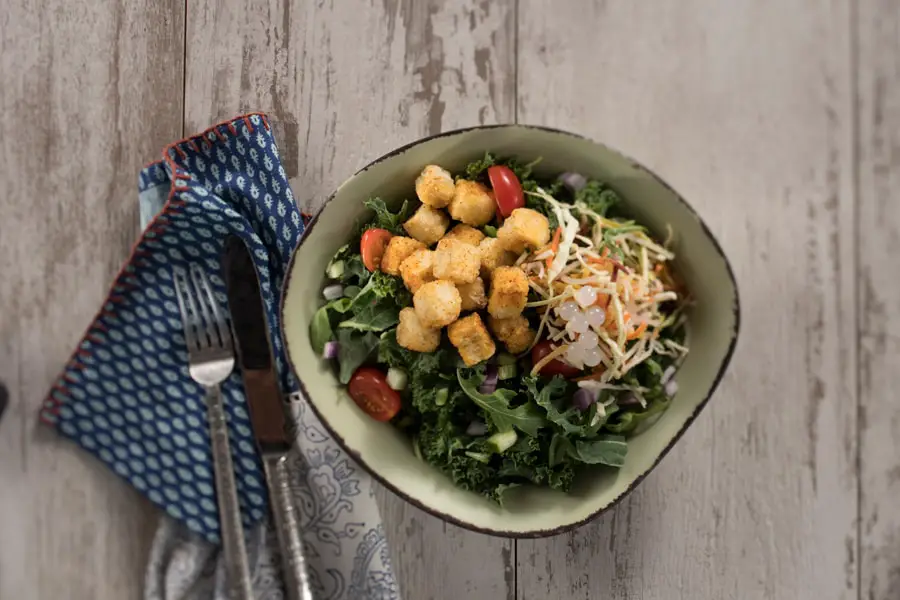 - Chili-Spiced Crispy Fried Tofu Bowl from Satu’li Canteen at Disney’s Animal Kingdom – crispy tofu, seasoned with chili-spice and topped with crunchy vegetable slaw, boba balls and your choice of base and sauce.