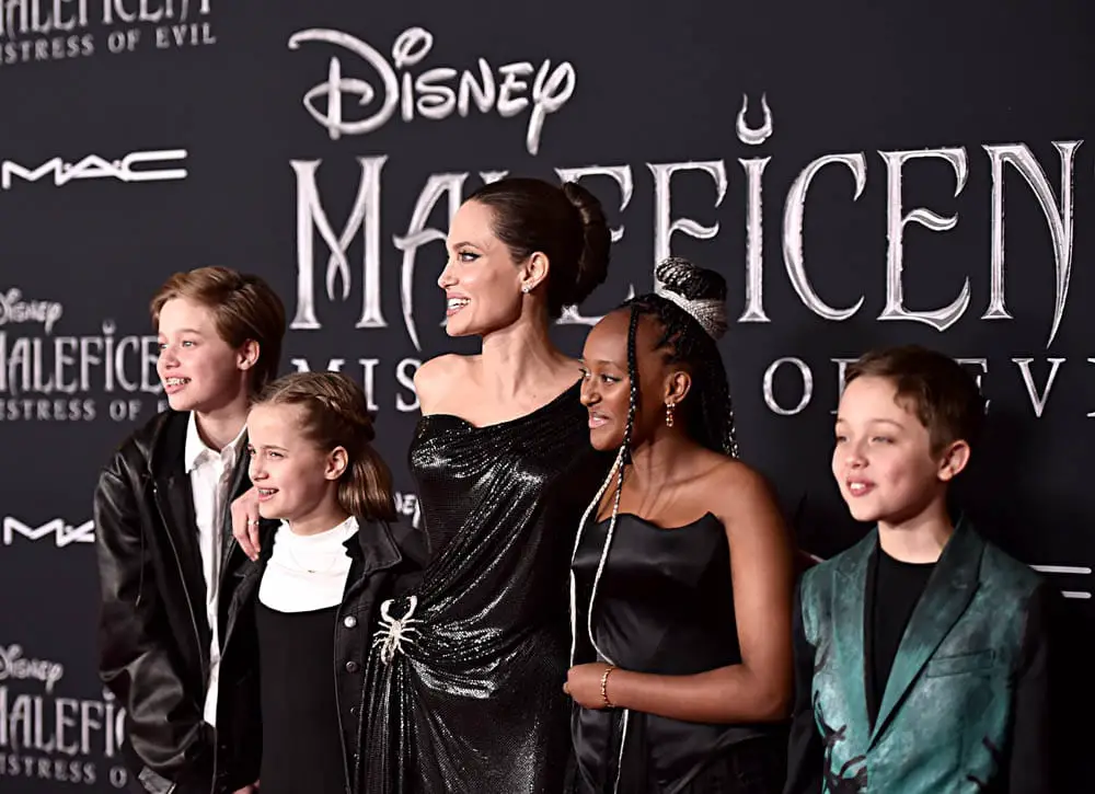 HOLLYWOOD, CALIFORNIA – SEPTEMBER 30: (L-R) Pax Thien Jolie-Pitt, Shiloh Nouvel Jolie-Pitt, Vivienne Marcheline Jolie-Pitt, Actor Angelina Jolie, Zahara Marley Jolie-Pitt, and Knox Léon Jolie-Pitt attend the World Premiere of Disney’s “Maleficent: Mistress of Evil” at the El Capitan Theatre on September 30, 2019 in Hollywood, California. (Photo by Alberto E. Rodriguez/Getty Images for Disney)