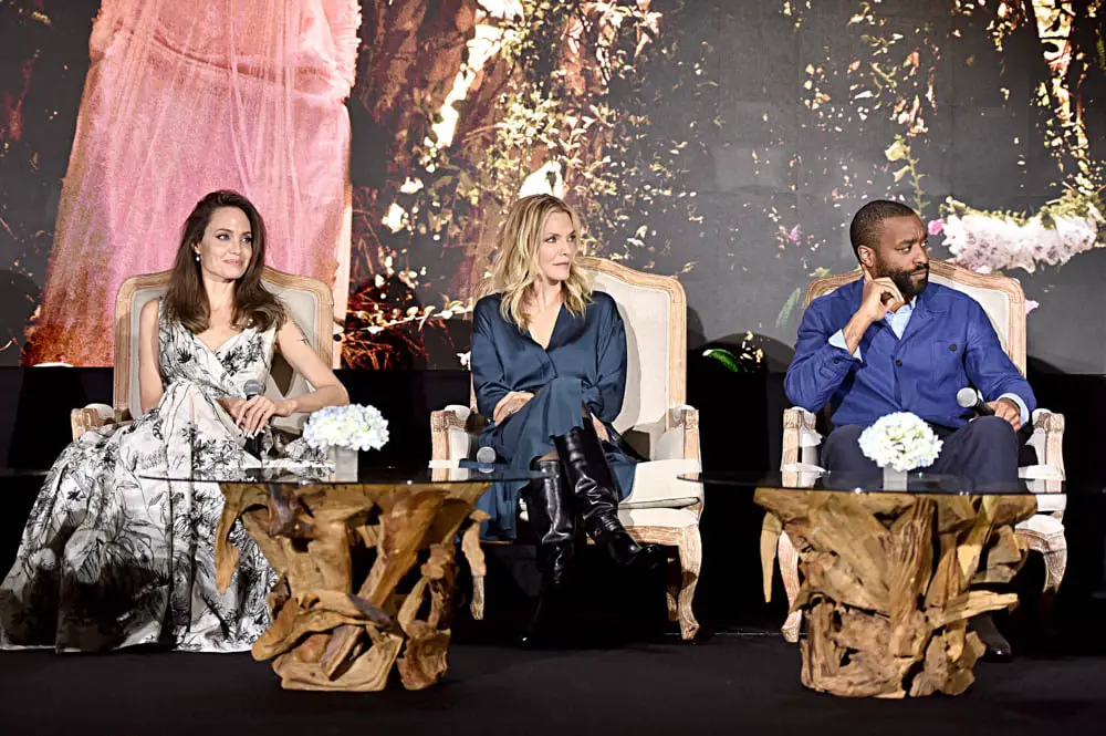 BEVERLY HILLS, CALIFORNIA – SEPTEMBER 30: (L-R) Actors Angelina Jolie, Michelle Pfeiffer and Chiwetel Ejiofor participate in the global press conference for “Disney’s Maleficent: Mistress of Evil” on September 30, 2019 in Beverly Hills, California. (Photo by Alberto E. Rodriguez/Getty Images for Disney)