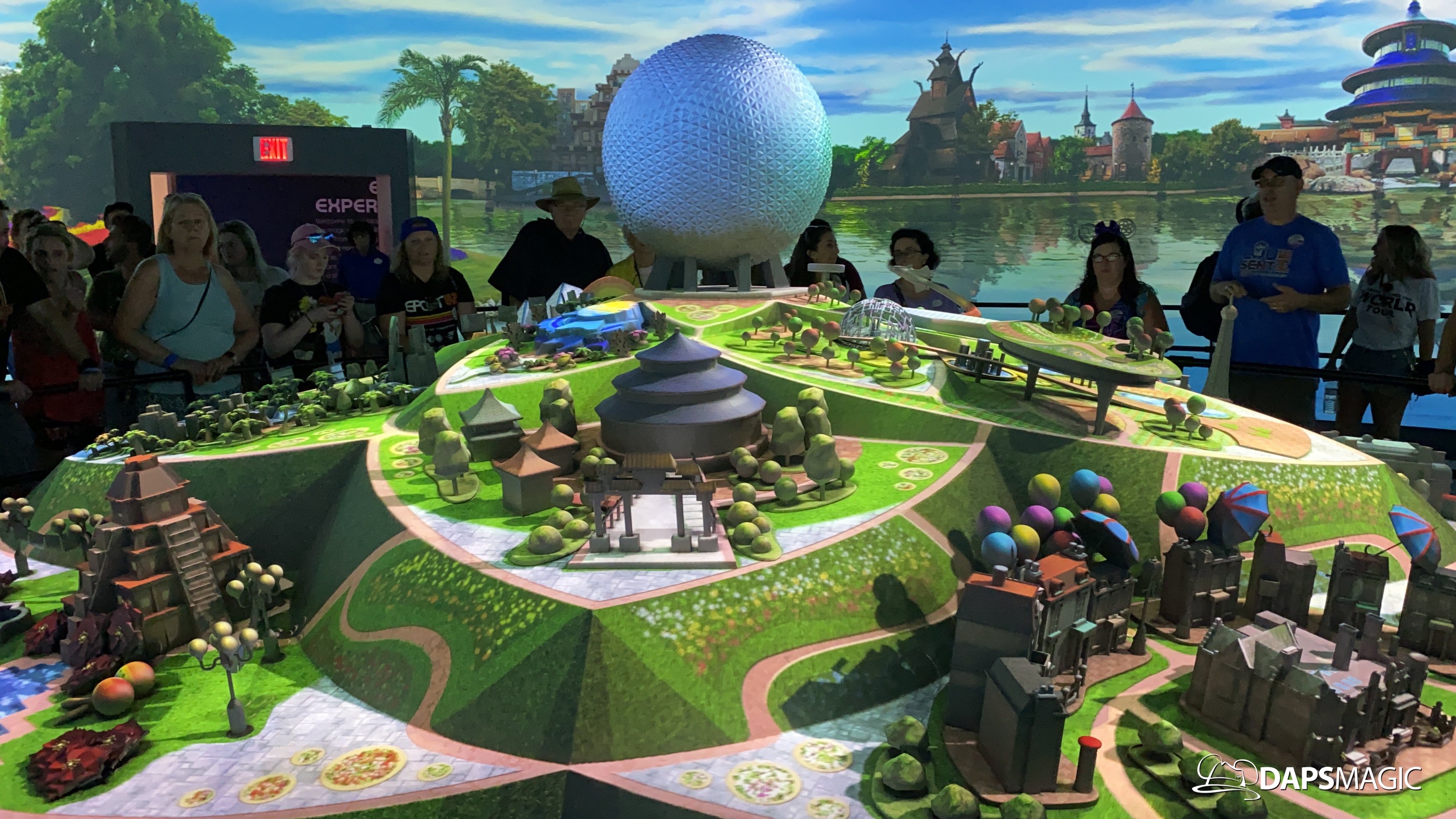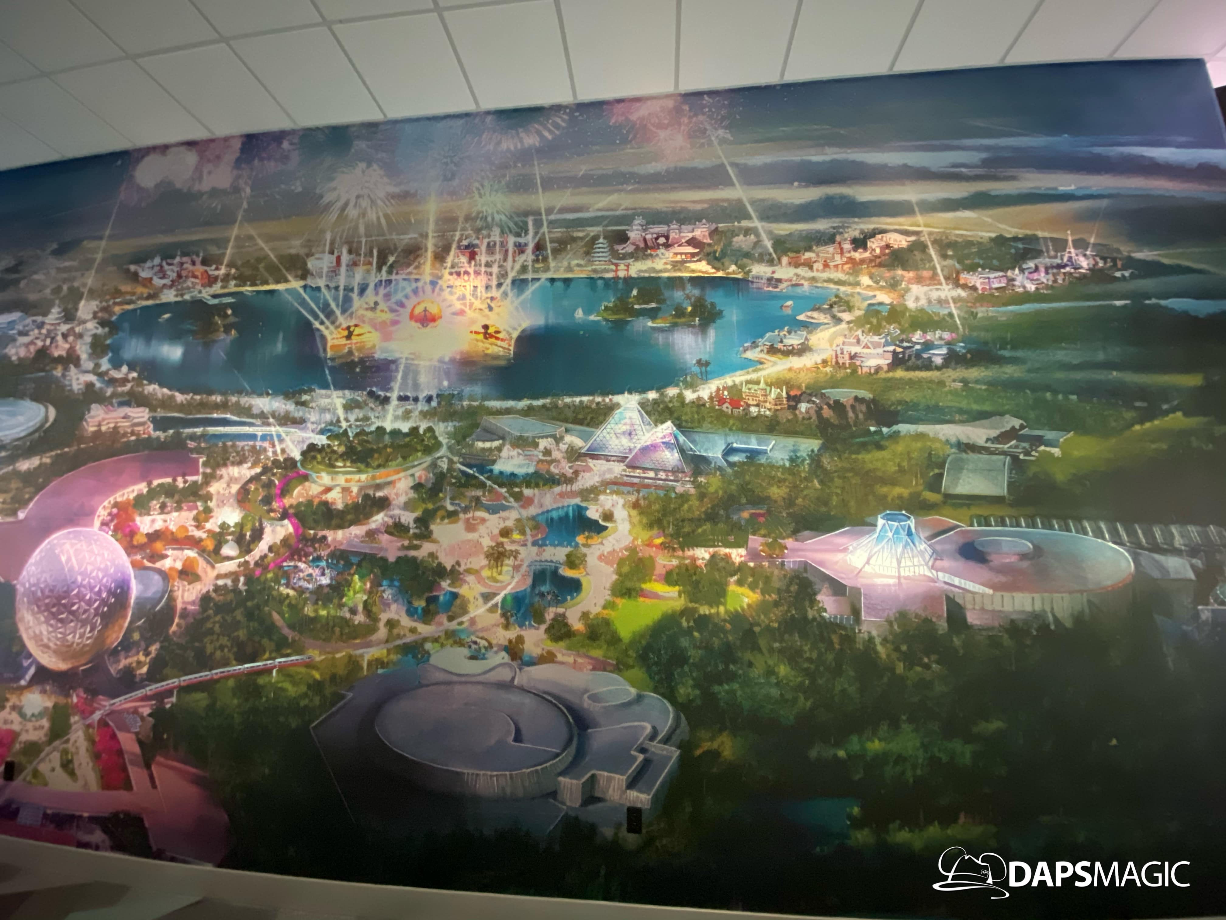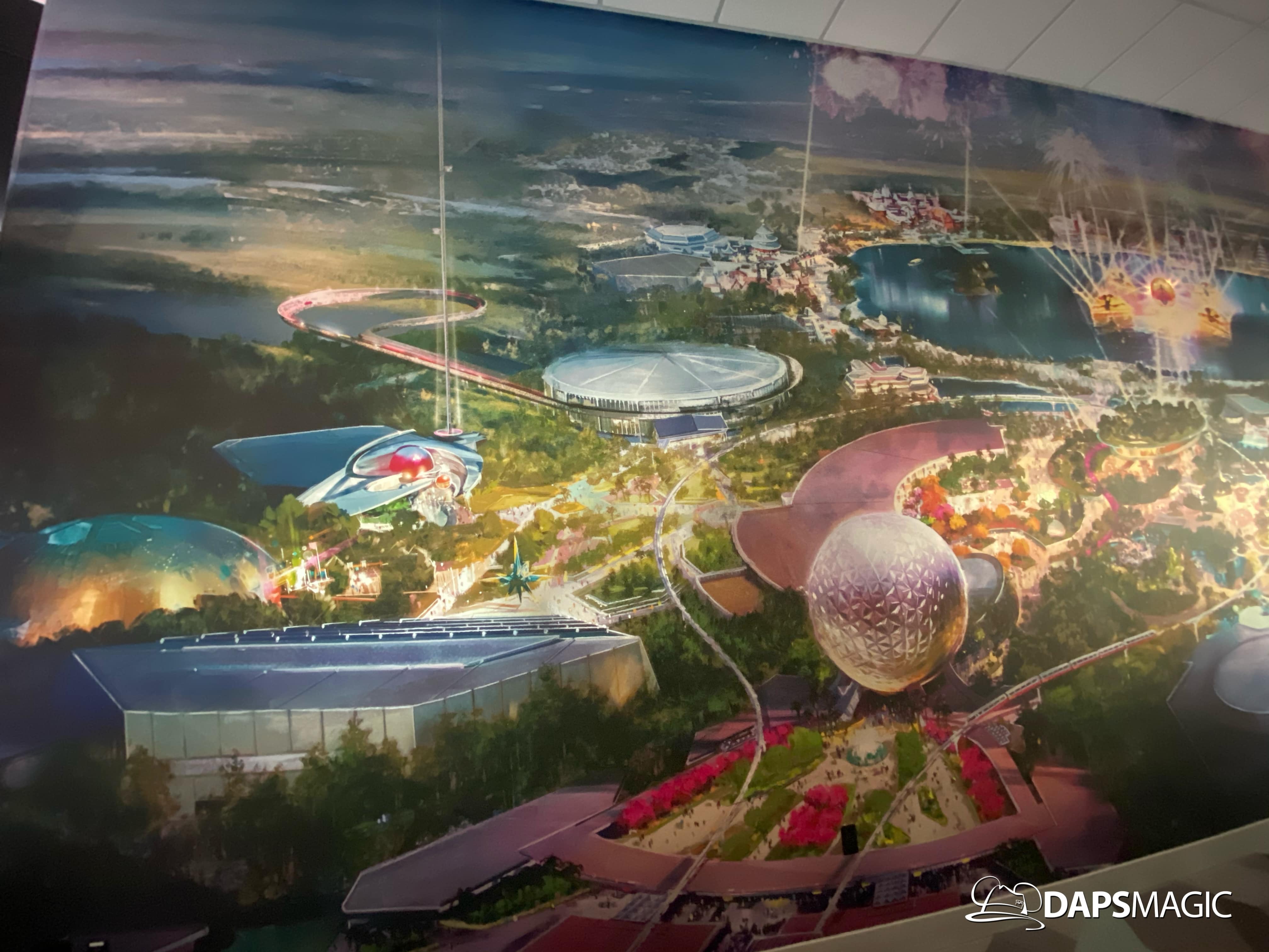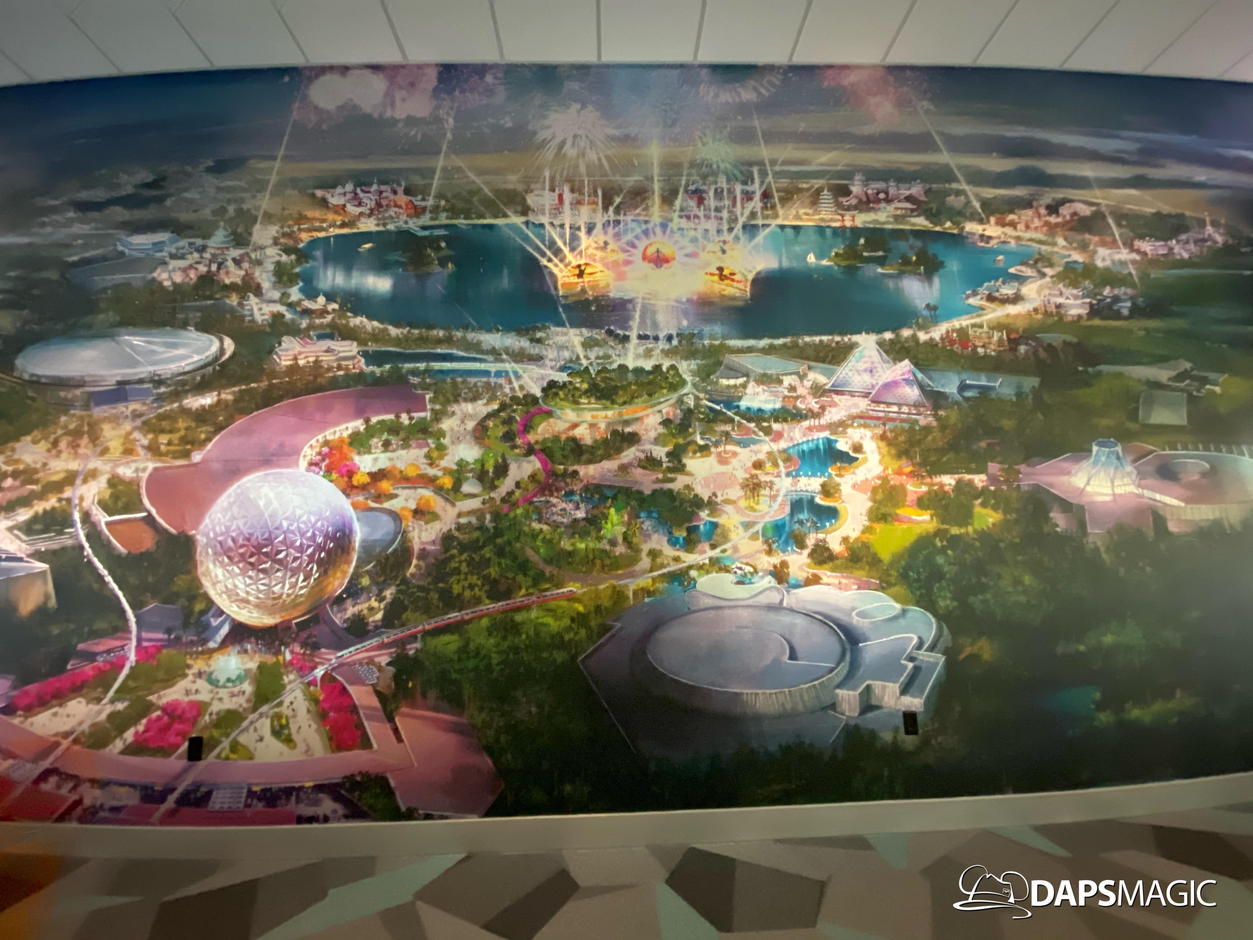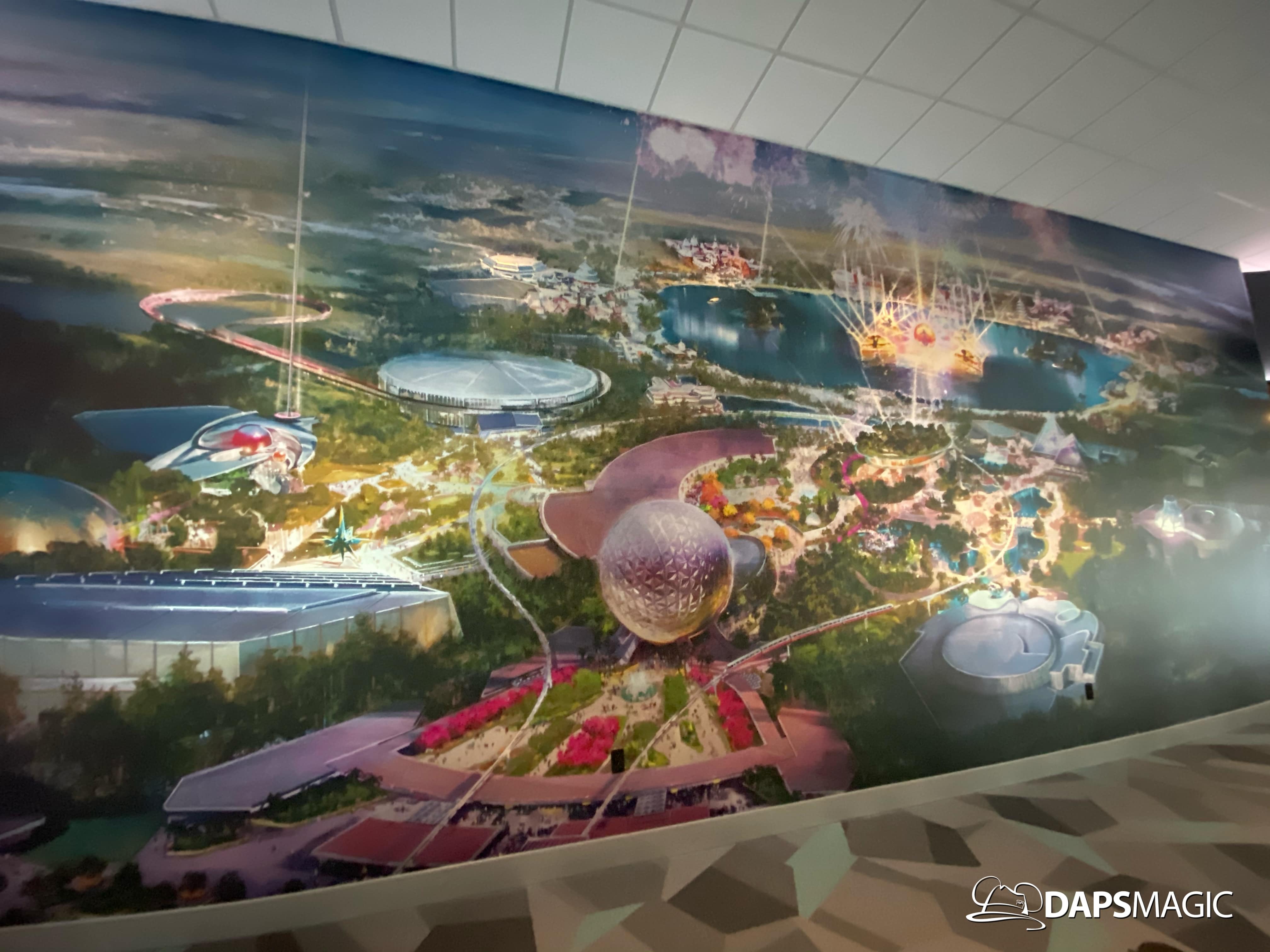 Outside of the preview room there are other exhibits and photo locations to be found. On the back wall of the building, a giant map of what Epcot’s future will generally look like can be found. Cast Members are on hand to answer questions as well. There are also props and models to be found in display cases for different things coming to Epcot.