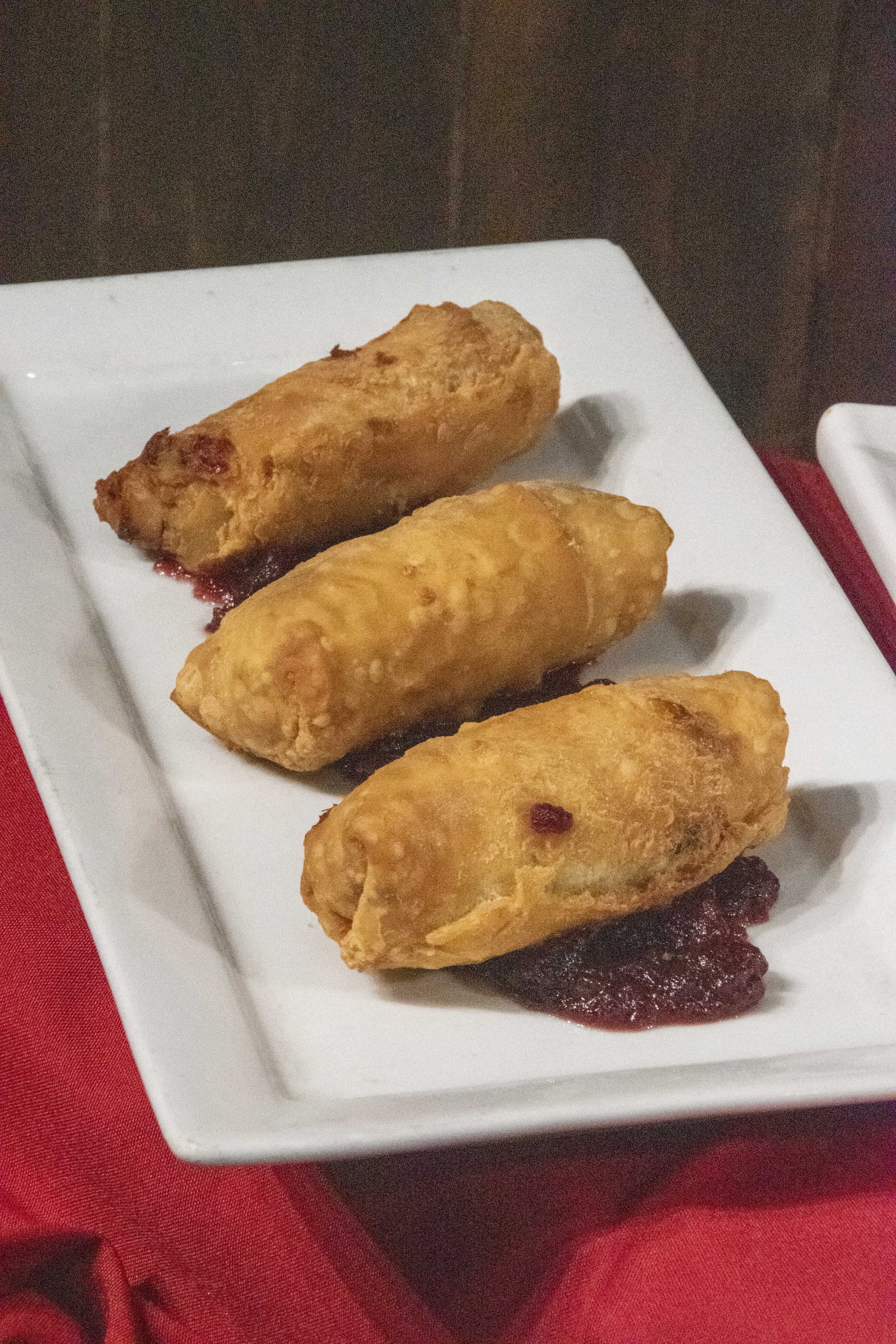 Though these are all Christmas holiday type offerings there were a few Thanksgiving types that made it onto the menu. Holiday Poutine, Turkey Fried Balls, Fried Green Beans, and Turkey Egg Rolls were items that I never imagined could be concocted except in a Willy Wonka factory. The egg rolls had a good blend of the usual roll wrap and a whole turkey dinner inside. Just so you are aware, the size was not average for the roll. This is a whole meal with one roll! The poutine was the most interesting to me since it featured sweet potato fries. But, this made sense since it was a combination of Thanksgiving favorites in one platter. The fried balls were even more interesting since it combined several of the usual dinner items in one bite. What was surprising is that it worked and no flavor overpowered the other!