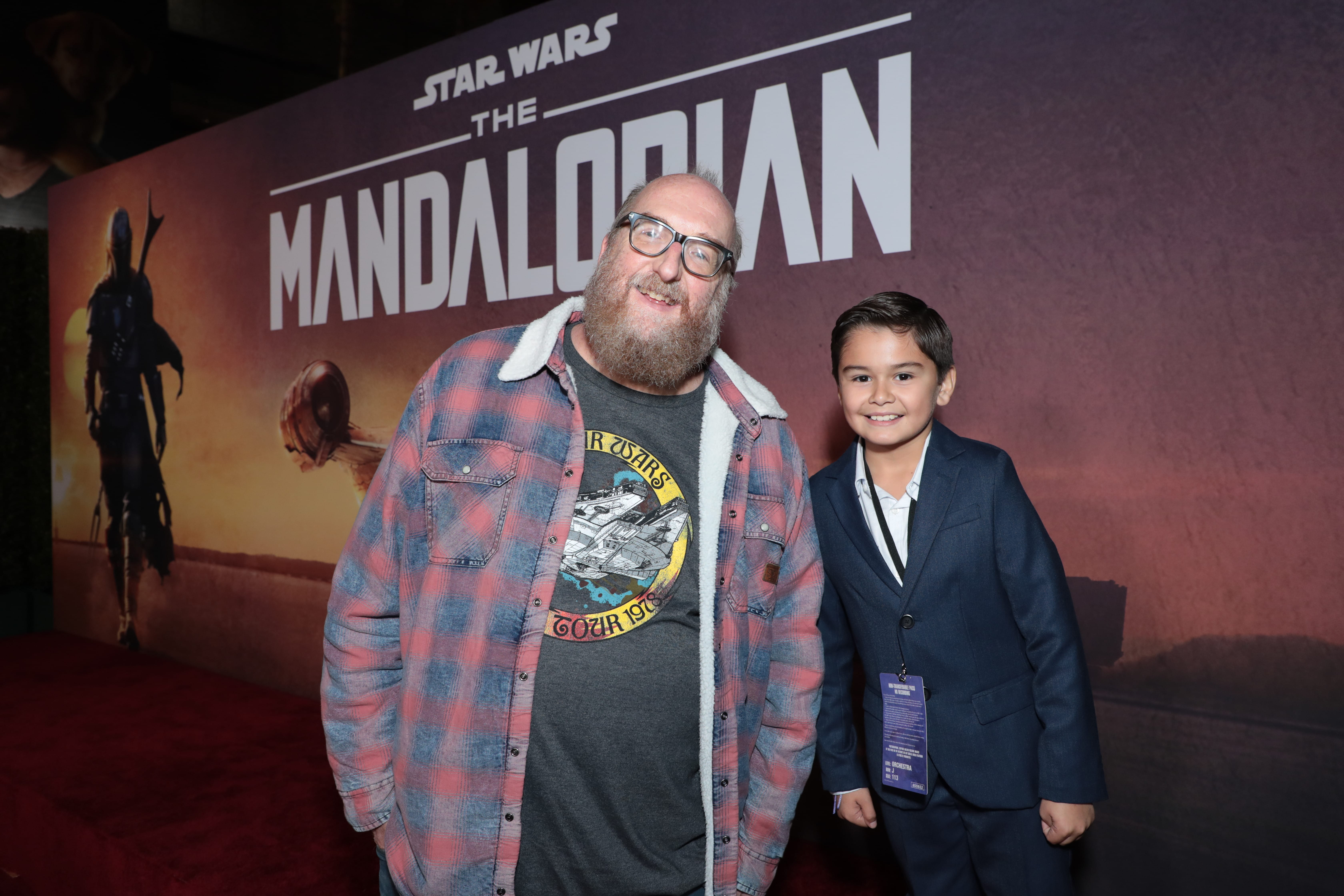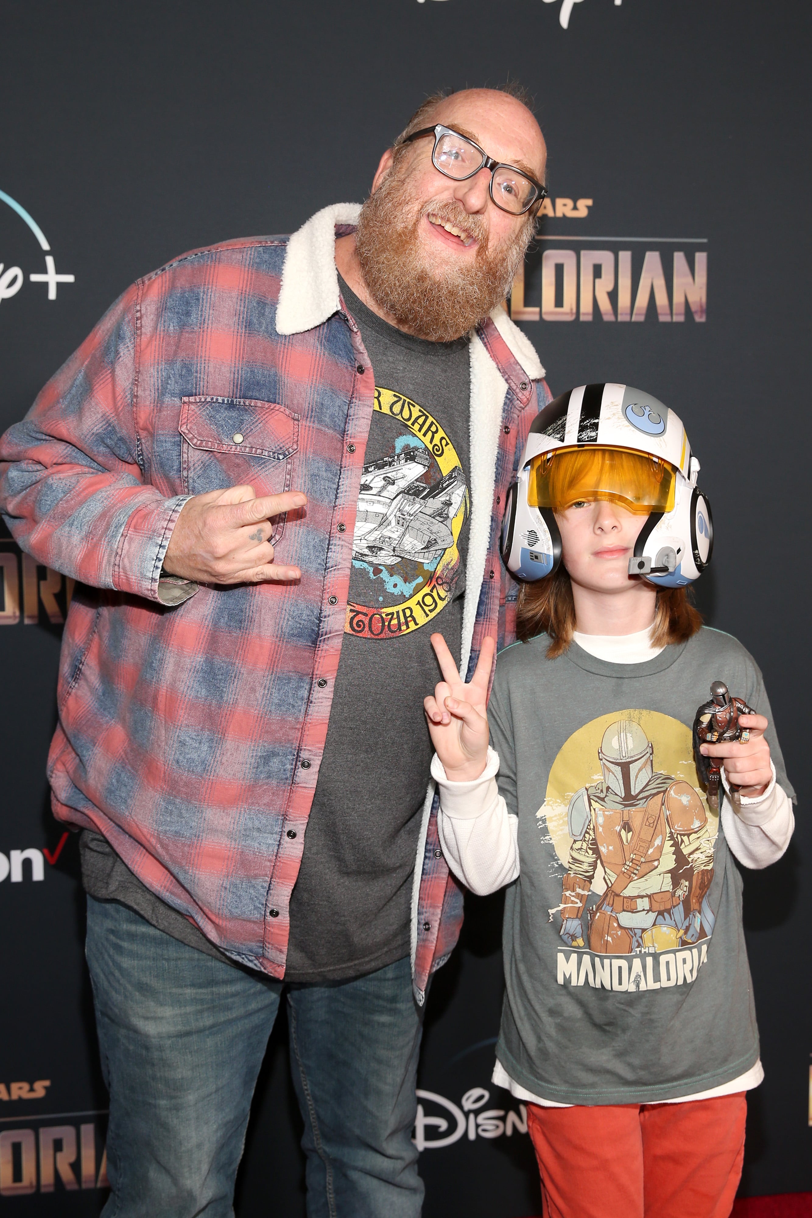 HOLLYWOOD, CALIFORNIA – NOVEMBER 13: (L-R) Brian Posehn and son arrive at the premiere of Lucasfilm’s first-ever, live-action series, “The Mandalorian,” at the El Capitan Theatre in Hollywood, Calif. on November 13, 2019. “The Mandalorian” streams exclusively on Disney+. (Photo by Jesse Grant/Getty Images for Disney)