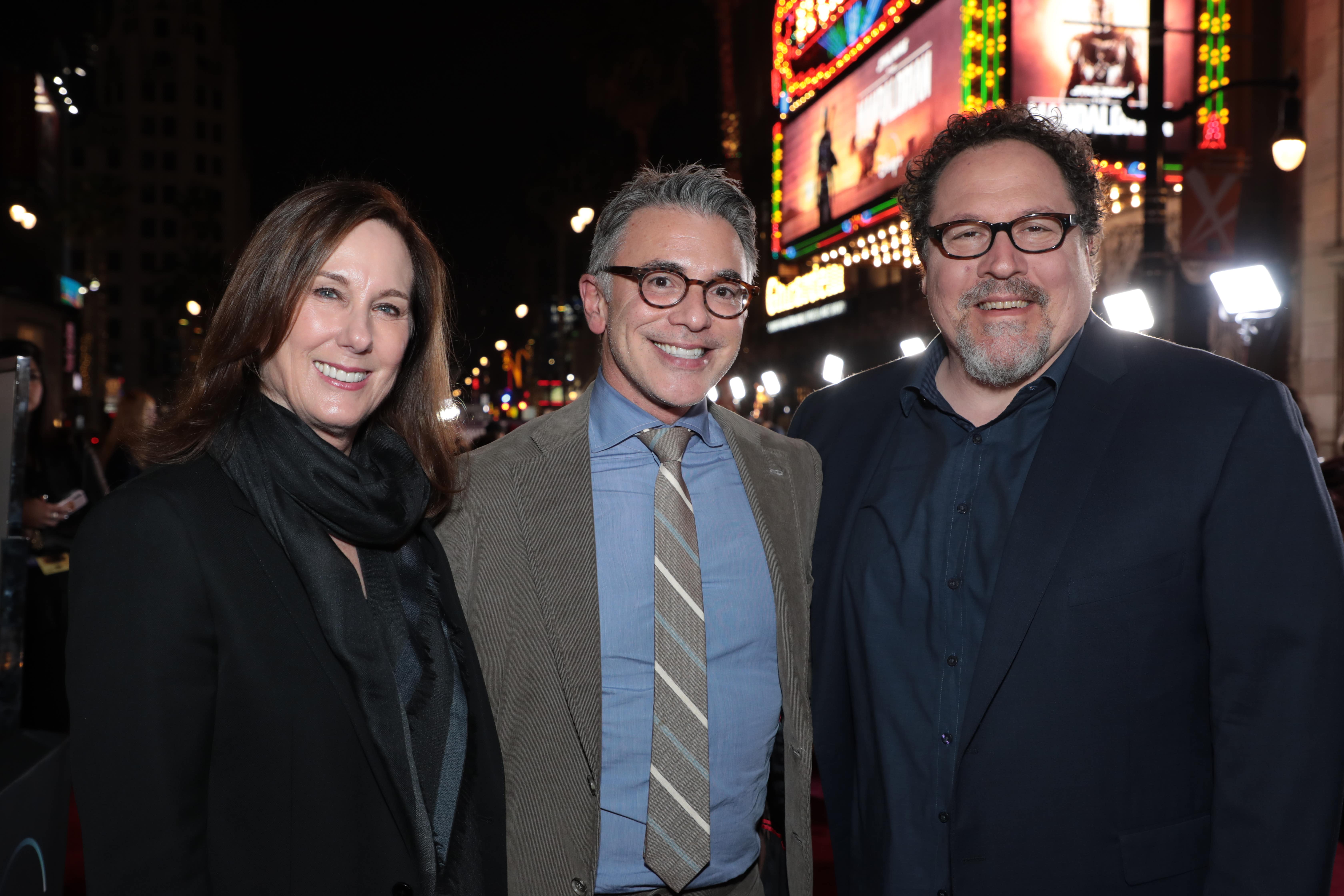 HOLLYWOOD, CALIFORNIA – NOVEMBER 13: (L-R) Executive Producer Kathleen Kennedy, President, Content and Marketing for Disney+ Ricky Strauss and Executive Producer Jon Favreau arrive at the premiere of Lucasfilm’s first-ever, live-action series, “The Mandalorian,” at the El Capitan Theatre in Hollywood, Calif. on November 13, 2019. “The Mandalorian” streams exclusively on Disney+. (Photo by Alberto E. Rodriguez/Getty Images for Disney)