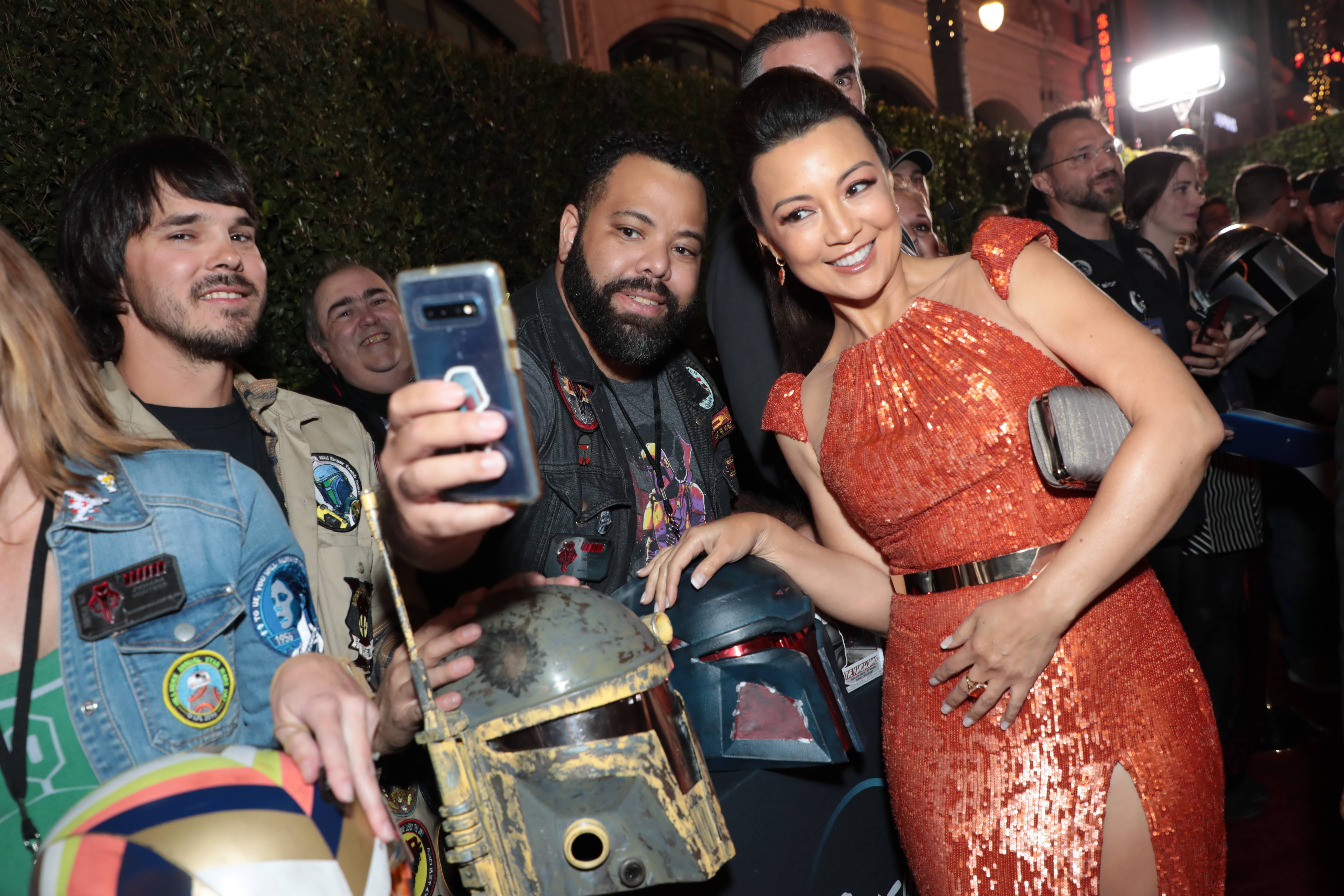 Ming-Na Wen poses for a selfie with a fan at the premiere of Lucasfilm’s first-ever, live-action series, “The Mandalorian”, at the El Capitan Theatre in Hollywood, CA on November 13, 2019. “The Mandalorian” streams exclusively on Disney+.(photo: Alex J. Berliner/ABImages)
