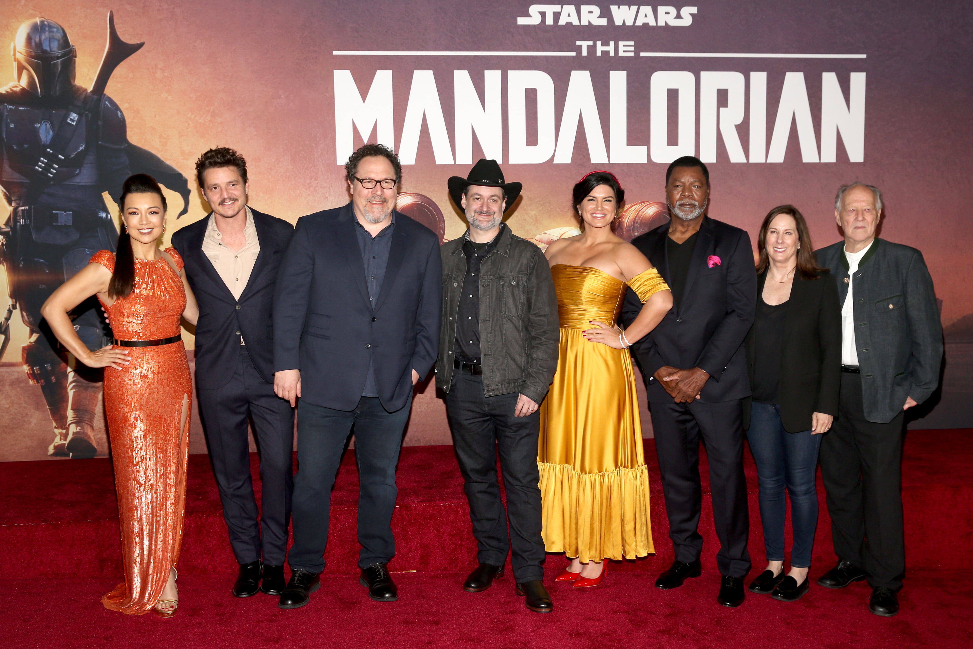 HOLLYWOOD, CALIFORNIA – NOVEMBER 13: (L-R) Ming-Na Wen, Pedro Pascal, Executive Producer Jon Favreau, Executive Producer/Director Dave Filoni, Gina Carano, Carl Weathers, Executive Producer Kathleen Kennedy and Werner Herzog arrive at the premiere of Lucasfilm’s first-ever, live-action series, “The Mandalorian,” at the El Capitan Theatre in Hollywood, Calif. on November 13, 2019. “The Mandalorian” streams exclusively on Disney+. (Photo by Alberto E. Rodriguez/Getty Images for Disney)