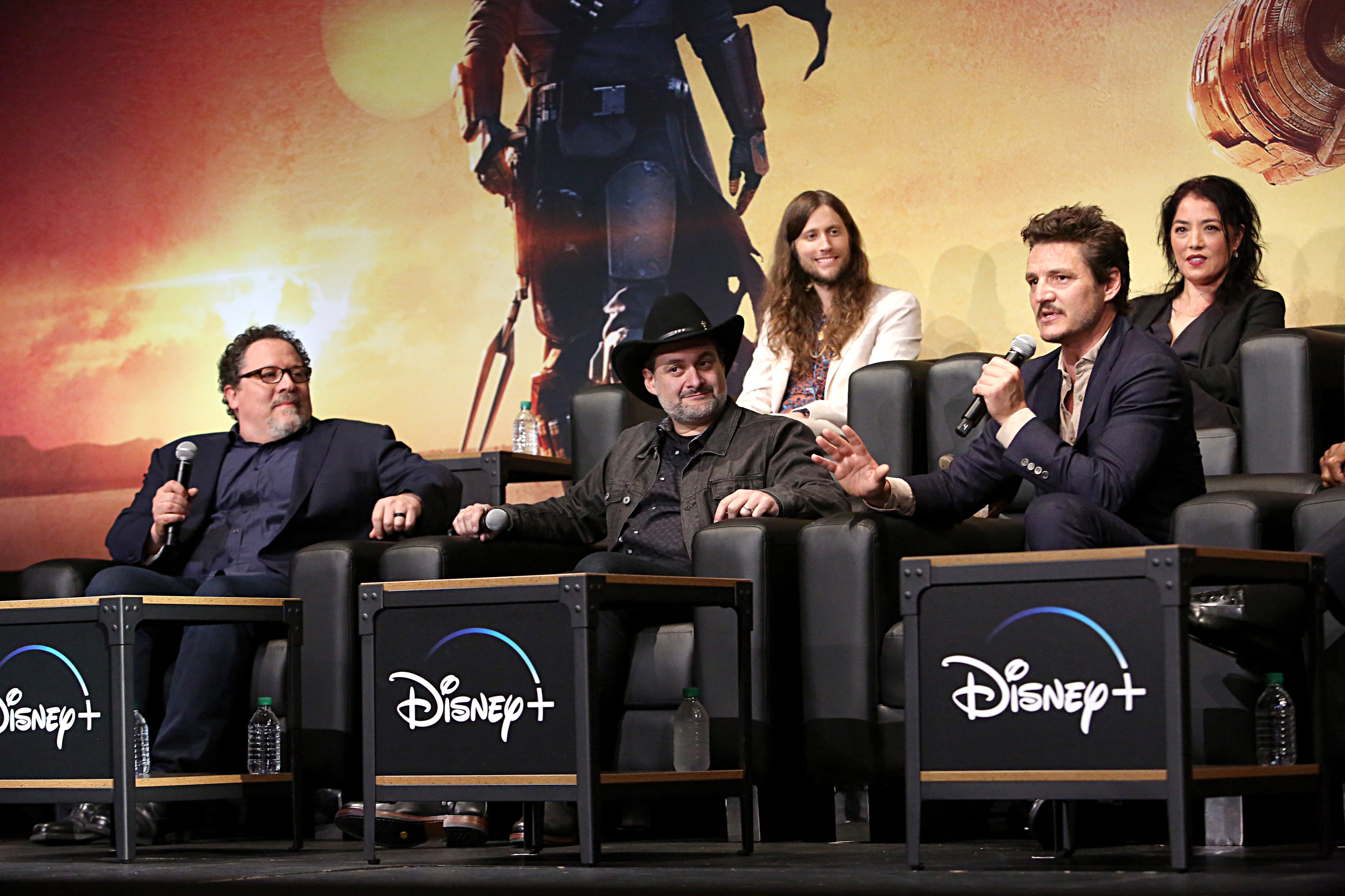 HOLLYWOOD, CALIFORNIA – NOVEMBER 13: (L-R) Executive Producer Jon Favreau, Executive Producer/Director Dave Filoni, Composer Ludwig Göransson, Pedro Pascal and Director Deborah Chow speak onstage at the premiere of Lucasfilm’s first-ever, live-action series, “The Mandalorian,” at the El Capitan Theatre in Hollywood, Calif. on November 13, 2019. “The Mandalorian” streams exclusively on Disney+. (Photo by Jesse Grant/Getty Images for Disney)