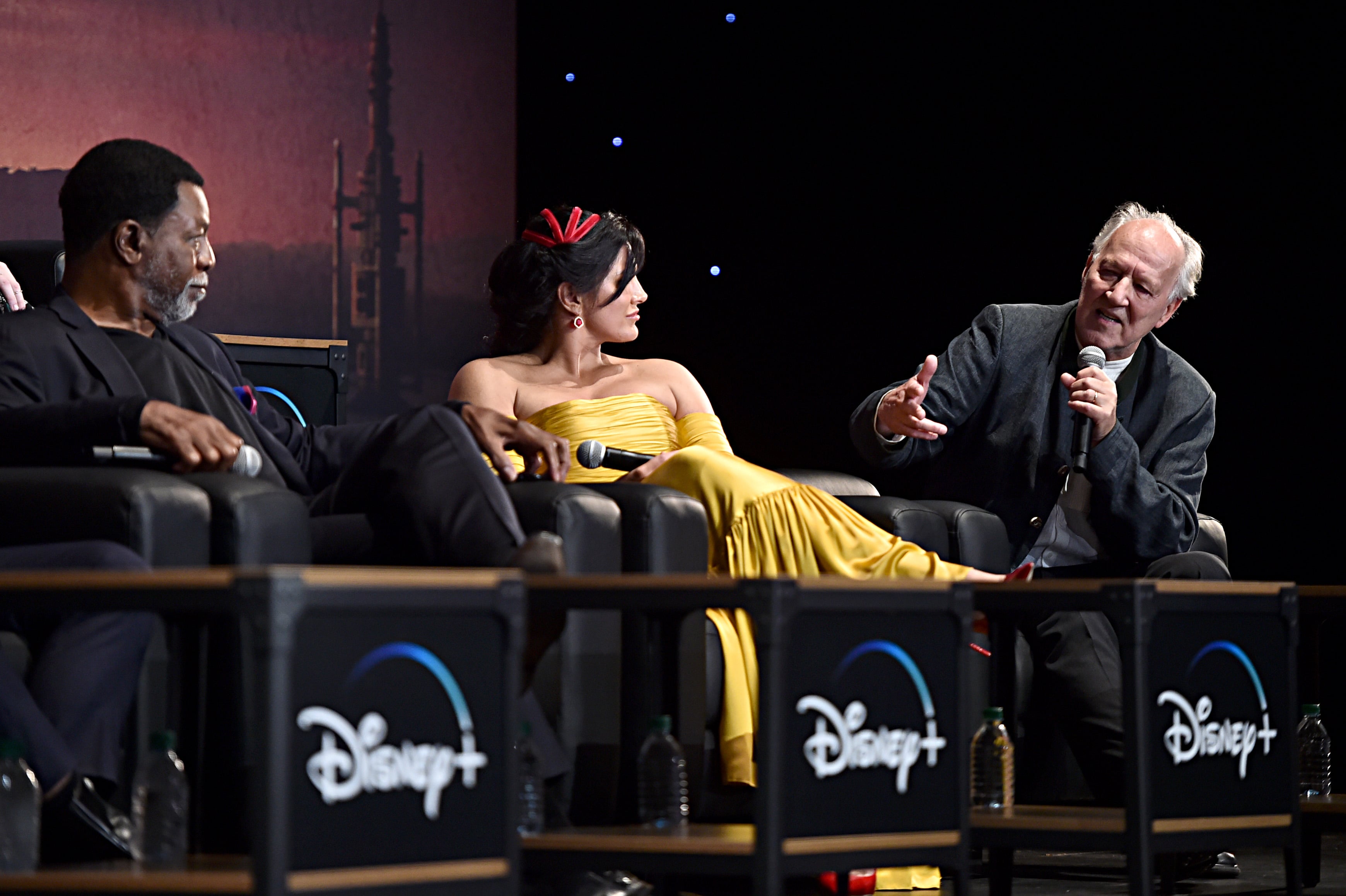 HOLLYWOOD, CALIFORNIA – NOVEMBER 13: (L-R) Carl Weathers, Gina Carano and Werner Herzog speak onstage at the premiere of Lucasfilm’s first-ever, live-action series, “The Mandalorian,” at the El Capitan Theatre in Hollywood, Calif. on November 13, 2019. “The Mandalorian” streams exclusively on Disney+. (Photo by Alberto E. Rodriguez/Getty Images for Disney)