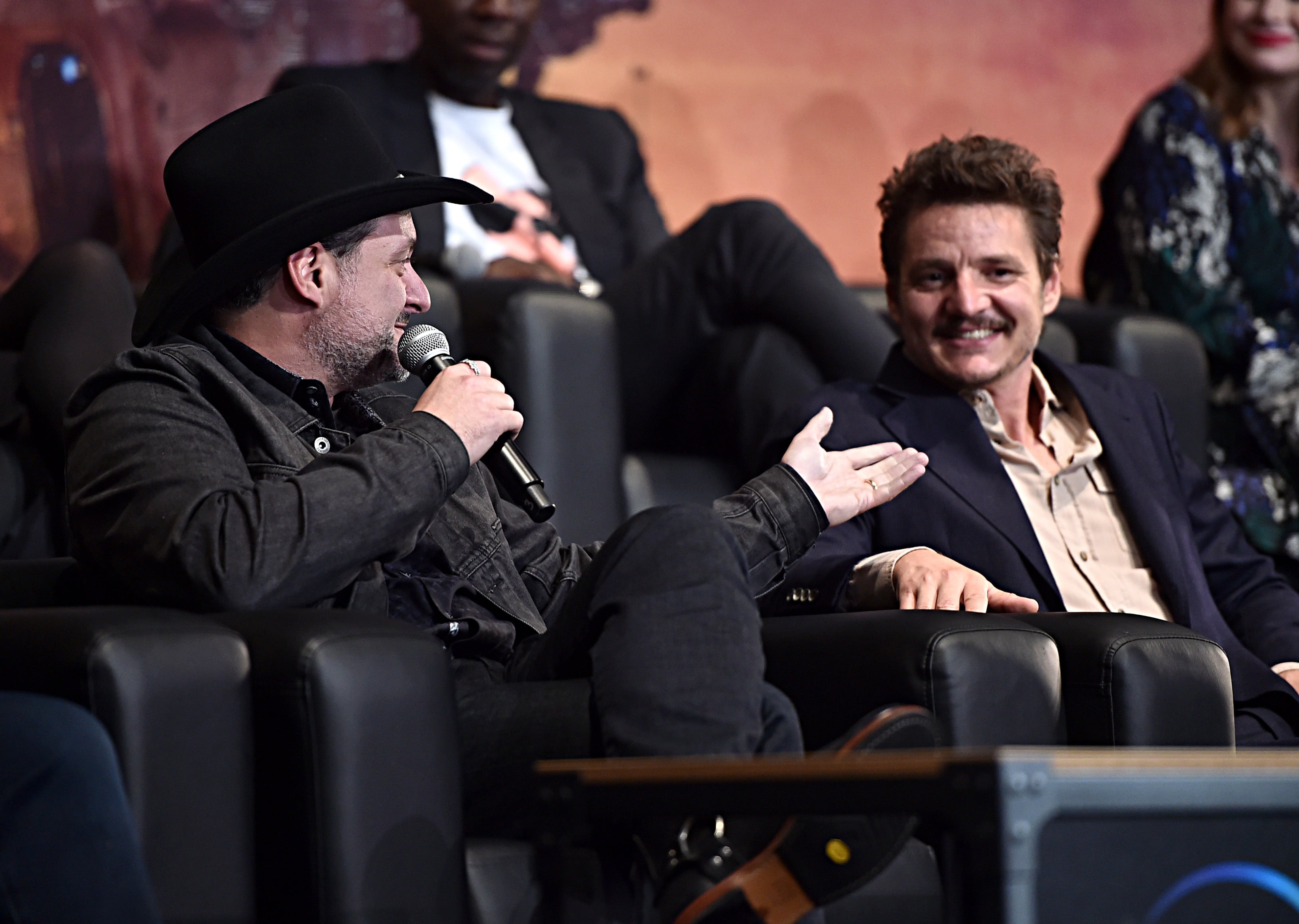 HOLLYWOOD, CALIFORNIA – NOVEMBER 13: (L-R) Executive Producer/Director Dave Filoni and Pedro Pascal speak onstage at the premiere of Lucasfilm’s first-ever, live-action series, “The Mandalorian,” at the El Capitan Theatre in Hollywood, Calif. on November 13, 2019. “The Mandalorian” streams exclusively on Disney+. (Photo by Alberto E. Rodriguez/Getty Images for Disney)
