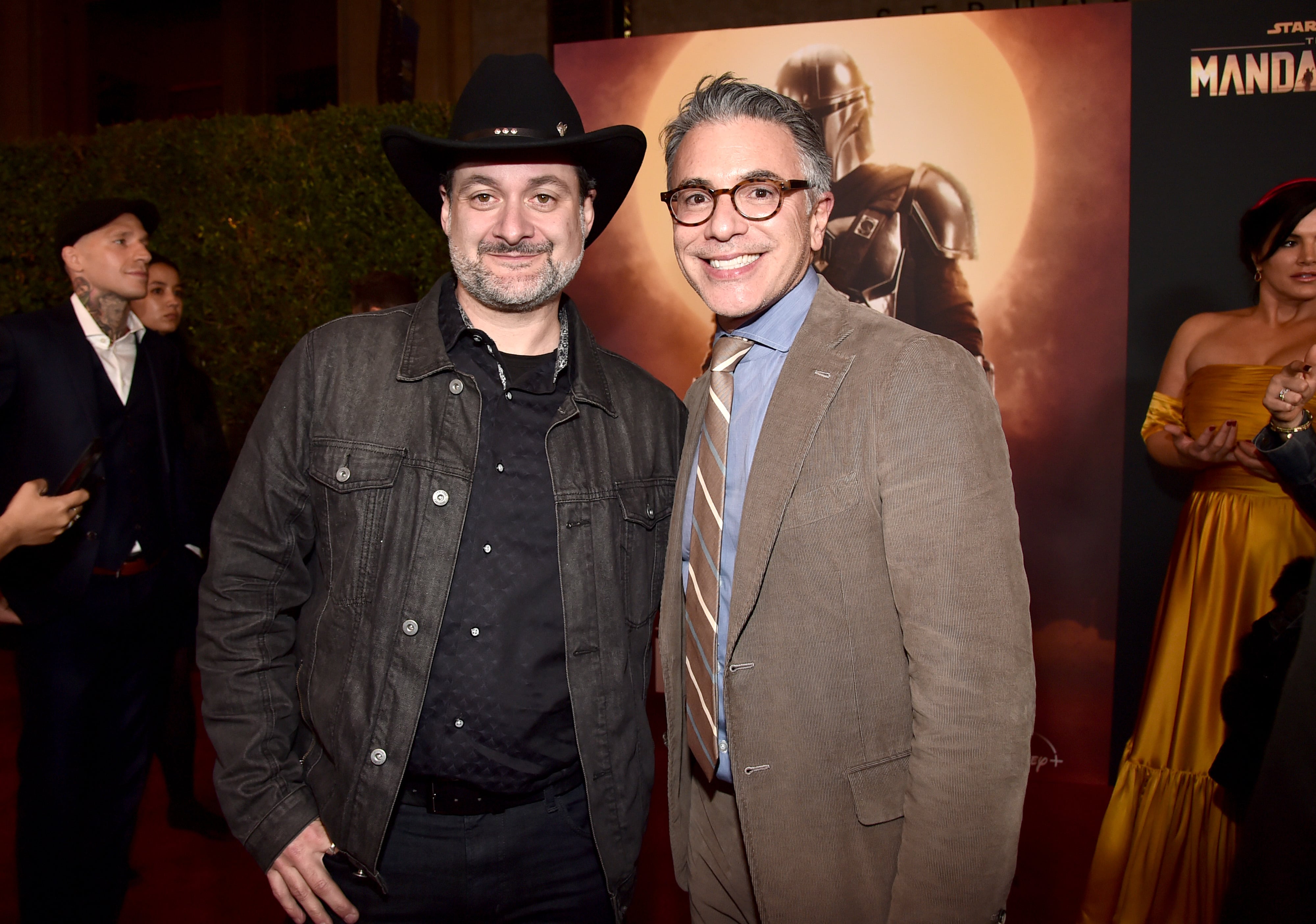 HOLLYWOOD, CALIFORNIA – NOVEMBER 13: Executive producer/director Dave Filoni (R) arrives at the premiere of Lucasfilm’s first-ever, live-action series, “The Mandalorian,” at the El Capitan Theatre in Hollywood, Calif. on November 13, 2019. “The Mandalorian” streams exclusively on Disney+. (Photo by Alberto E. Rodriguez/Getty Images for Disney)