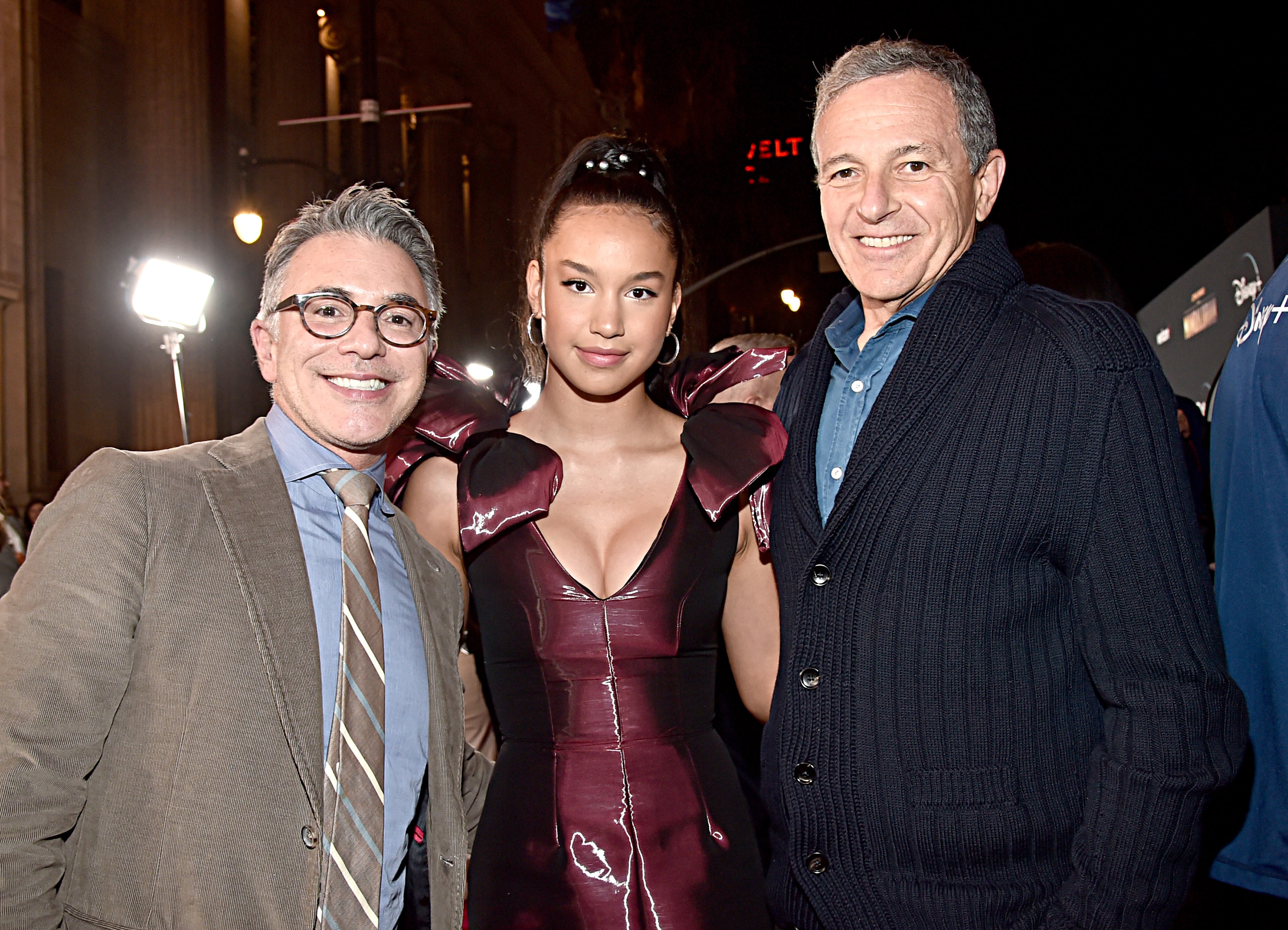 HOLLYWOOD, CALIFORNIA – NOVEMBER 13: (L-R) President, Content and Marketing for Disney+ Ricky Strauss, Sofia Wylie and The Walt Disney Company Chairman and CEO Bob Iger arrive at the premiere of Lucasfilm’s first-ever, live-action series, “The Mandalorian,” at the El Capitan Theatre in Hollywood, Calif. on November 13, 2019. “The Mandalorian” streams exclusively on Disney+. (Photo by Alberto E. Rodriguez/Getty Images for Disney)