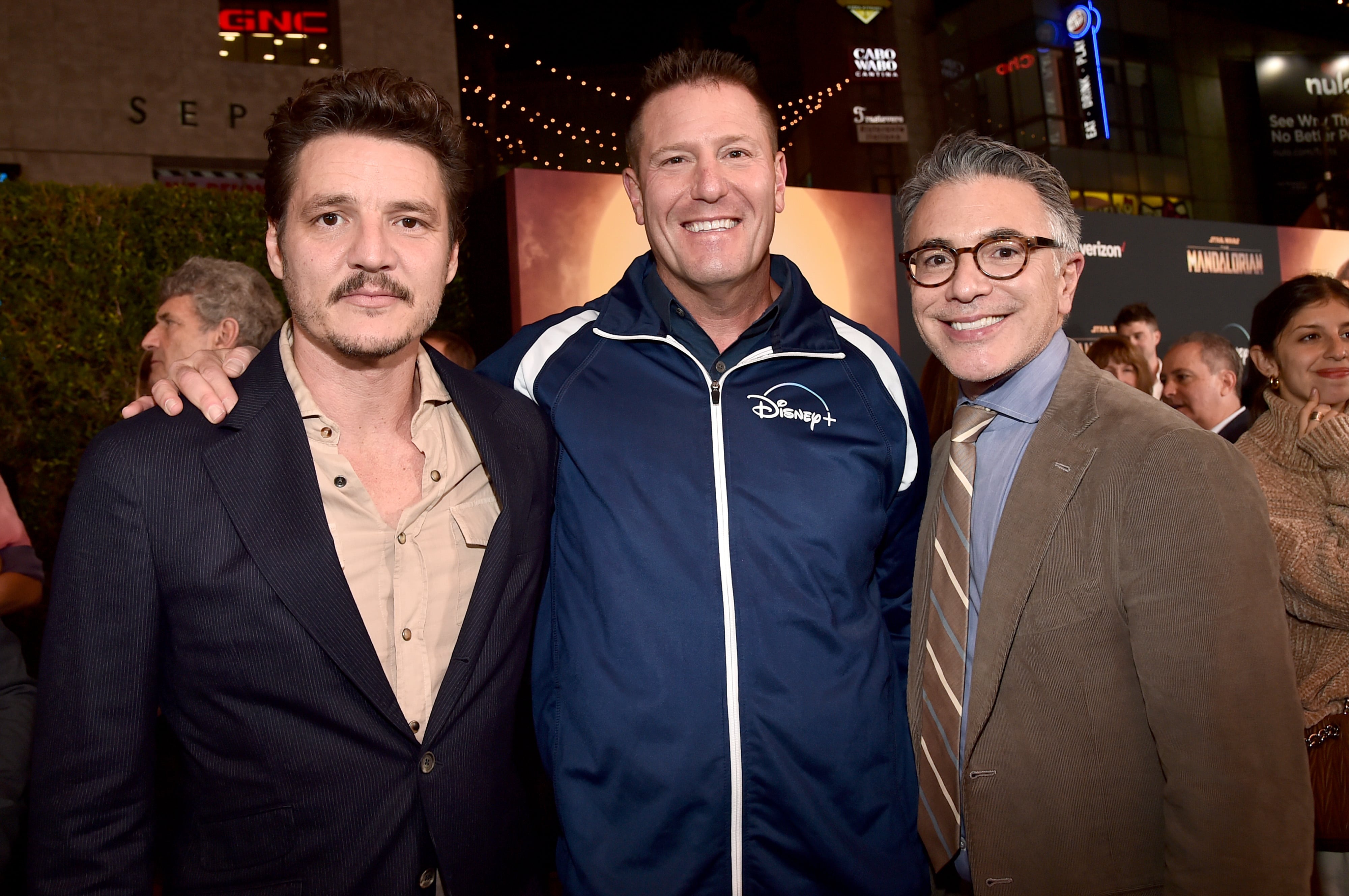 HOLLYWOOD, CALIFORNIA – NOVEMBER 13: (L-R) Pedro Pascal, Chairman of Direct-to-Consumer & International division of The Walt Disney Company Kevin Mayer and President, Content and Marketing for Disney+ Ricky Strauss arrive at the premiere of Lucasfilm’s first-ever, live-action series, “The Mandalorian,” at the El Capitan Theatre in Hollywood, Calif. on November 13, 2019. “The Mandalorian” streams exclusively on Disney+. (Photo by Alberto E. Rodriguez/Getty Images for Disney)