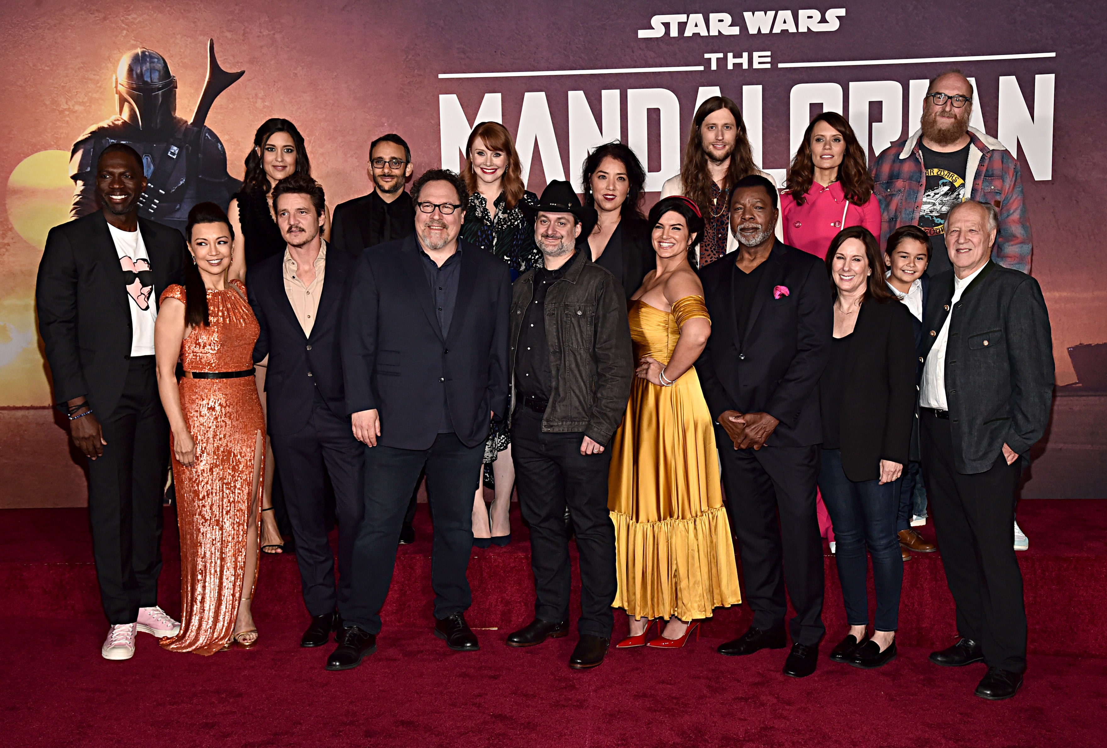 HOLLYWOOD, CALIFORNIA – NOVEMBER 13: (Back L-R) Rick Famuyiwa, Julia Jones, Omid Abtahi, Director Bryce Dallas Howard, Director Deborah Chow, Composer Ludwig Göransson, Emily Swallow, Brian Posehn, (Front L-R) Ming-Na Wen, Pedro Pascal, Executive Producer Jon Favreau, Executive Producer/Director Dave Filoni, Gina Carano, Carl Weathers, Executive Producer Kathleen Kennedy, Aidan Bertolav and Werner Herzog arrive at the premiere of Lucasfilm’s first-ever, live-action series, “The Mandalorian,” at the El Capitan Theatre in Hollywood, Calif. on November 13, 2019. “The Mandalorian” streams exclusively on Disney+. (Photo by Alberto E. Rodriguez/Getty Images for Disney)