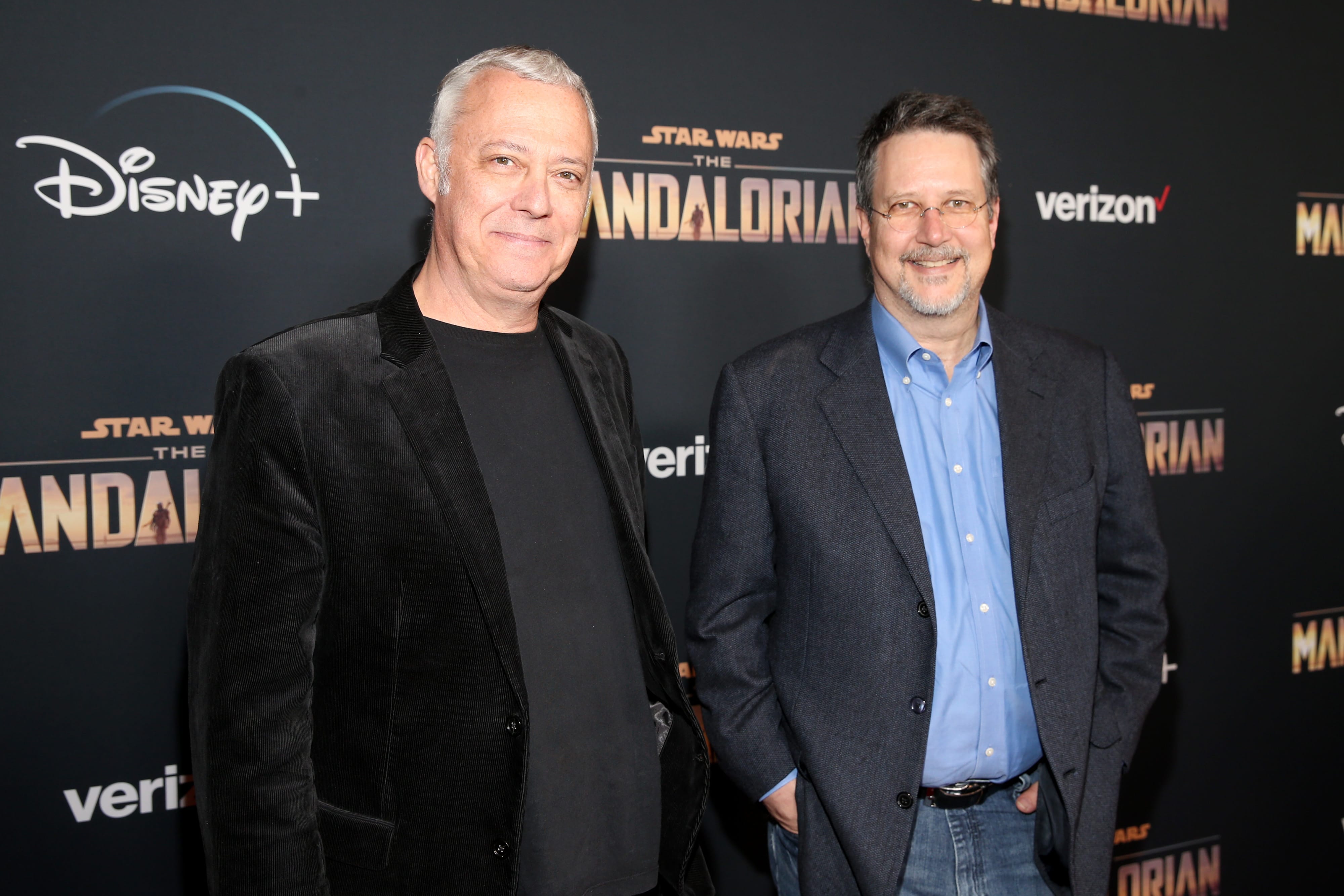 HOLLYWOOD, CALIFORNIA – NOVEMBER 13: Animation supervisor Hal Hickel and ILM VFX supervisor John Knoll arrive at the premiere of Lucasfilm’s first-ever, live-action series, “The Mandalorian,” at the El Capitan Theatre in Hollywood, Calif. on November 13, 2019. “The Mandalorian” streams exclusively on Disney+. (Photo by Jesse Grant/Getty Images for Disney)