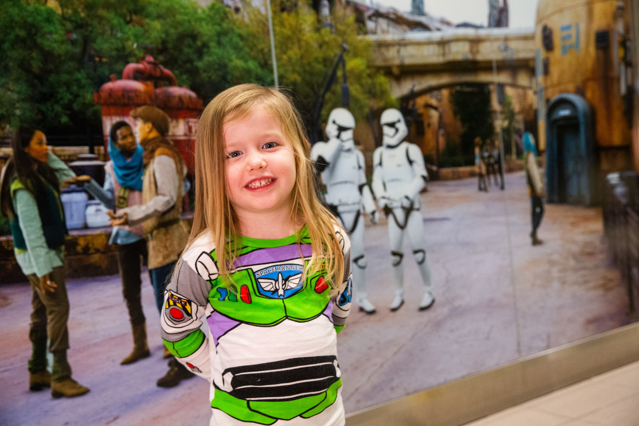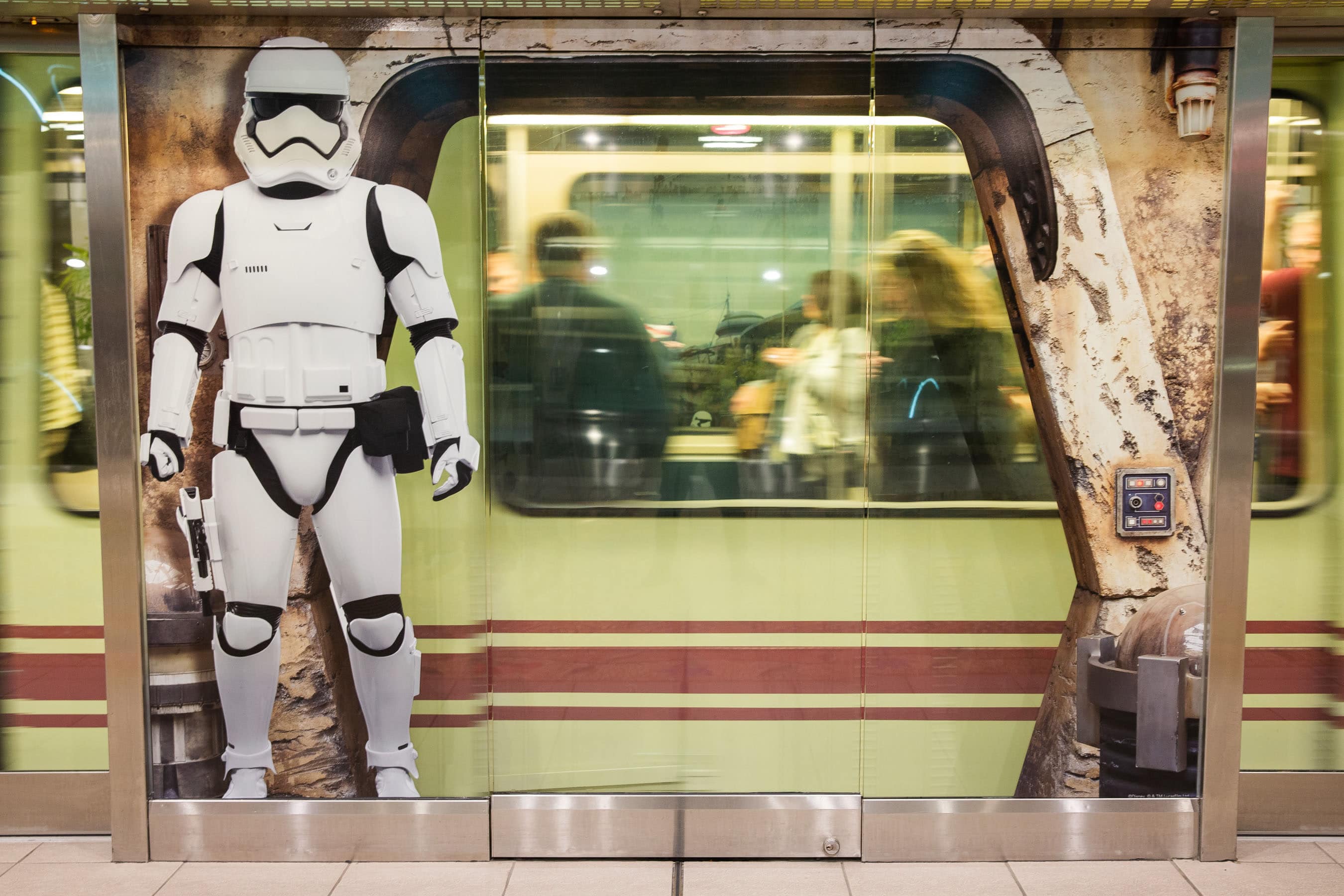 One scene creates a dimensional landscape that feels as if visitors are standing inside Star Wars: Galaxy’s Edge, where travelers can see the iconic Millennium Falcon and other landmarks from the new land. In another scene, it appears as if First Order Stormtroopers are waiting to step off the shuttle as the train arrives in the station.