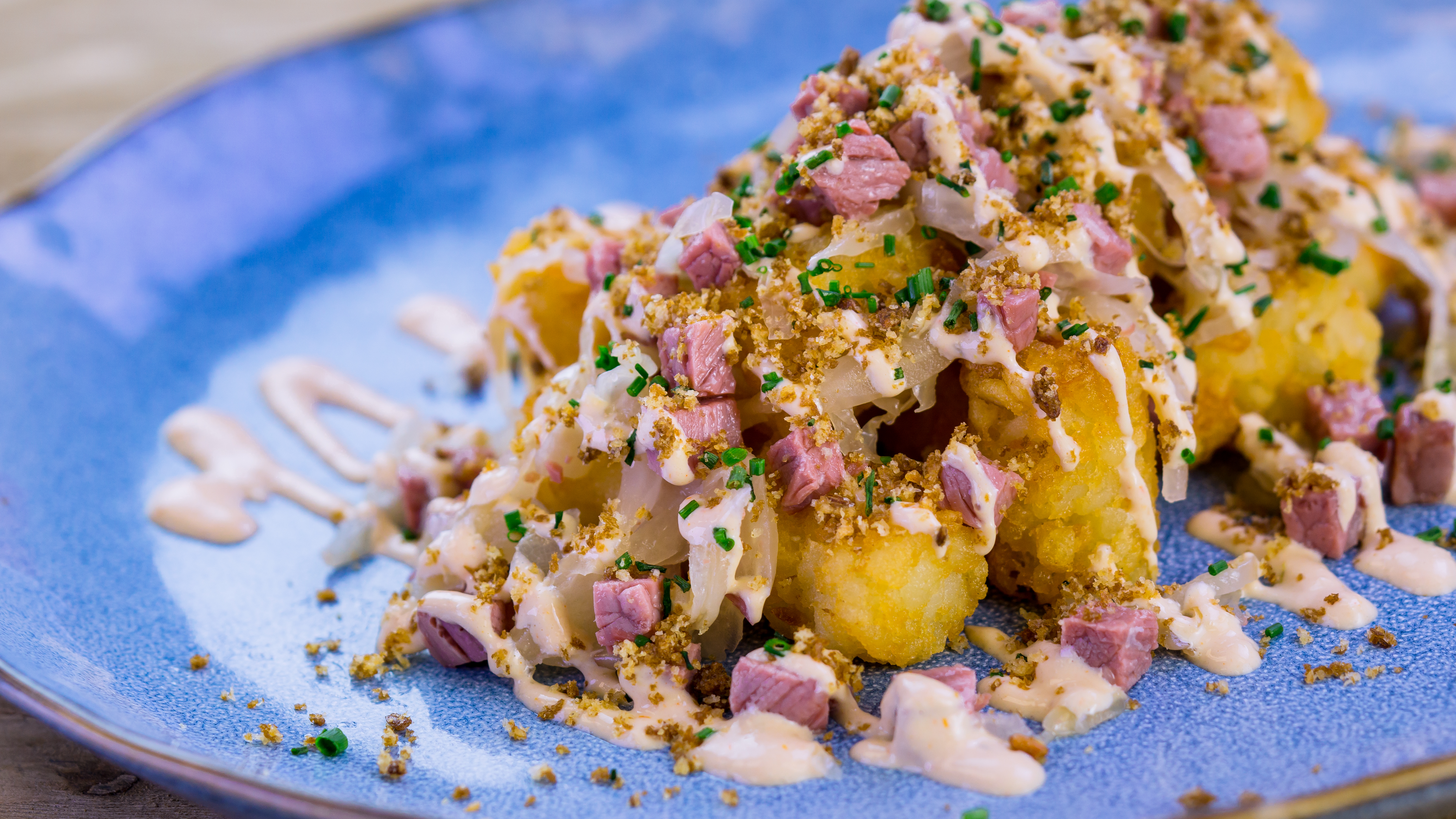 Reuben Potato Tots with Russian Dressing and Rye Toast