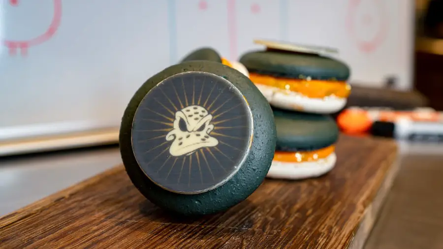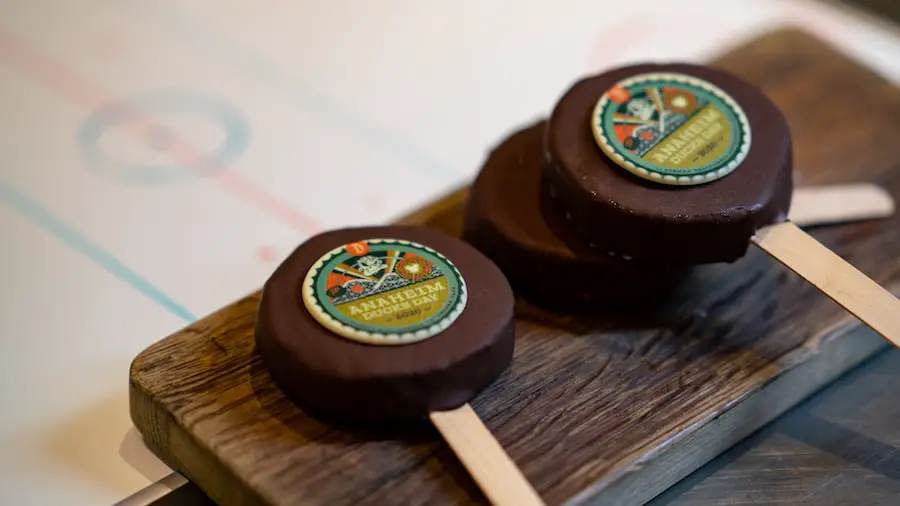 - Don’t miss out on a limited selection of sweet and savory treats inspired by the Anaheim Ducks. Find a vanilla ice cream puck dipped in dark chocolate at Clarabelle’s Hand-Scooped Ice Cream, an orange crème at Trolley Treats, a hockey puck themed brownie at Studio Catering Co., orange shake at Schmoozies and a macaron at Award Wieners along with Boardwalk Pizza & Pasta. Hungry for more? Be sure to visit our Hollywood Land outdoor vending cart near Off the Page, to find orange-flavored cotton candy, special beverages, hot wings and more!