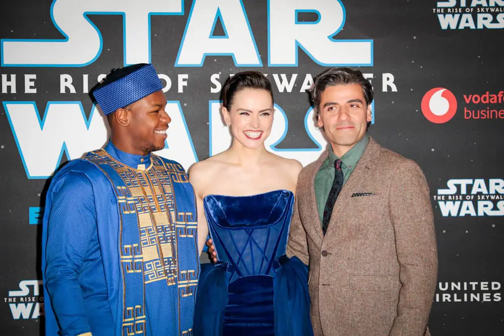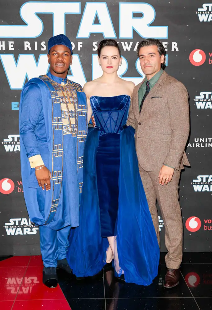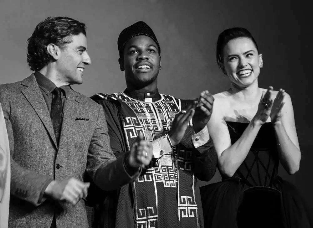 LONDON, ENGLAND – DECEMBER 18: (EDITORS NOTE: Image has been converted to black and white) (L-R) Oscar Isaac, John Boyega and Daisy Ridley attend the European premiere of “Star Wars: The Rise of Skywalker” at Cineworld Leicester Square on December 18, 2019 in London, England. (Photo by Gareth Cattermole/Getty Images for Disney)