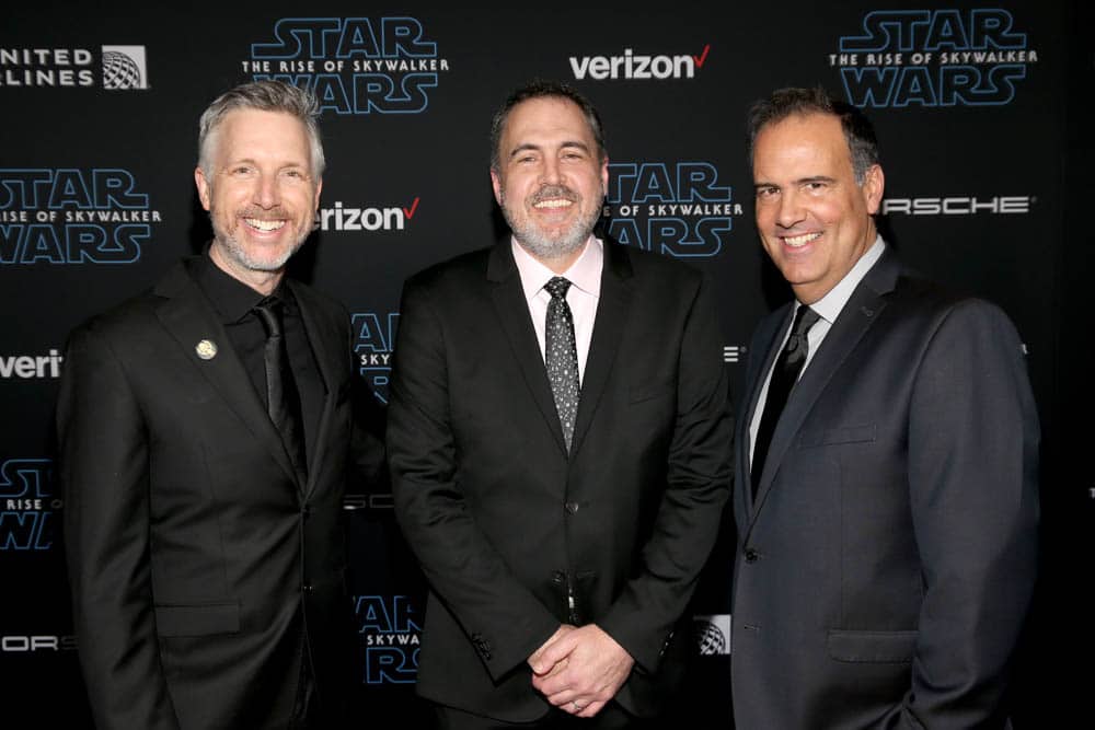 HOLLYWOOD, CALIFORNIA – DECEMBER 16: L-R) Supervising Sound Editor Matthew Wood, Supervising Sound Editor & Sound Designer David Acord and Re-Recording Mixer Christopher Scarabosio arrive for the World Premiere of “Star Wars: The Rise of Skywalker”, the highly anticipated conclusion of the Skywalker saga on December 16, 2019 in Hollywood, California. (Photo by Jesse Grant/Getty Images for Disney)