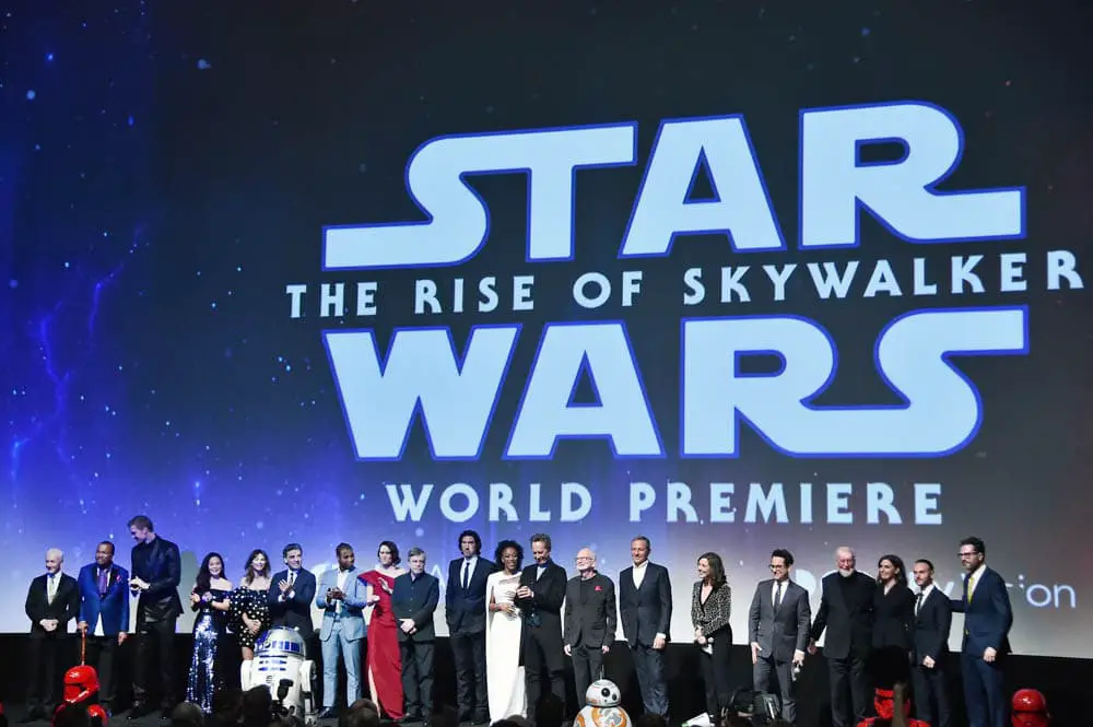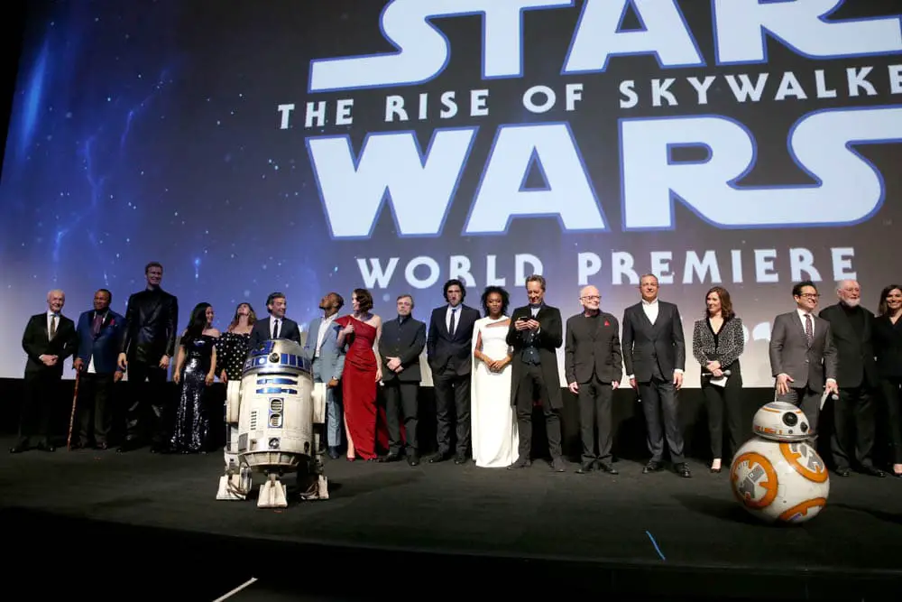 HOLLYWOOD, CALIFORNIA – DECEMBER 16: (L-R) Anthony Daniels, Billy Dee Williams, Joonas Suotamo, Kelly Marie Tran, Keri Russell, Oscar Isaac, John Boyega, Daisy Ridley, Mark Hamill, Adam Driver, Naomi Ackie, Richard E. Grant, Ian McDiarmid, The Walt Disney Company Chairman and CEO Bob Iger, Producer and President of Lucasfilm Kathleen Kennedy, Director, Writer and Producer J.J. Abrams, composer John Williams, producer Michelle Rejwan, Writer Chris Terrio and executive producer Callum Greene speak onstage during the World Premiere of “Star Wars: The Rise of Skywalker”, the highly anticipated conclusion of the Skywalker saga on December 16, 2019 in Hollywood, California. (Photo by Alberto E. Rodriguez/Getty Images for Disney)