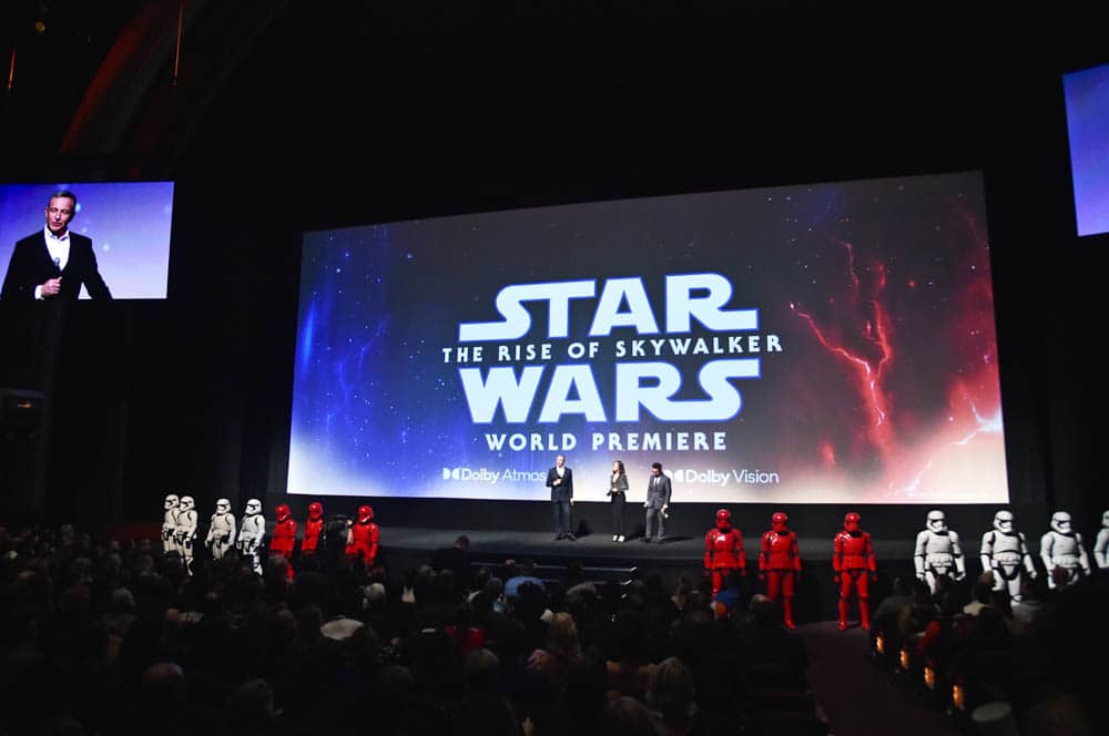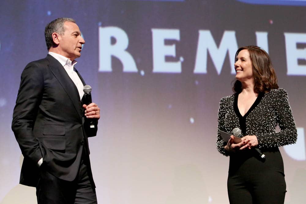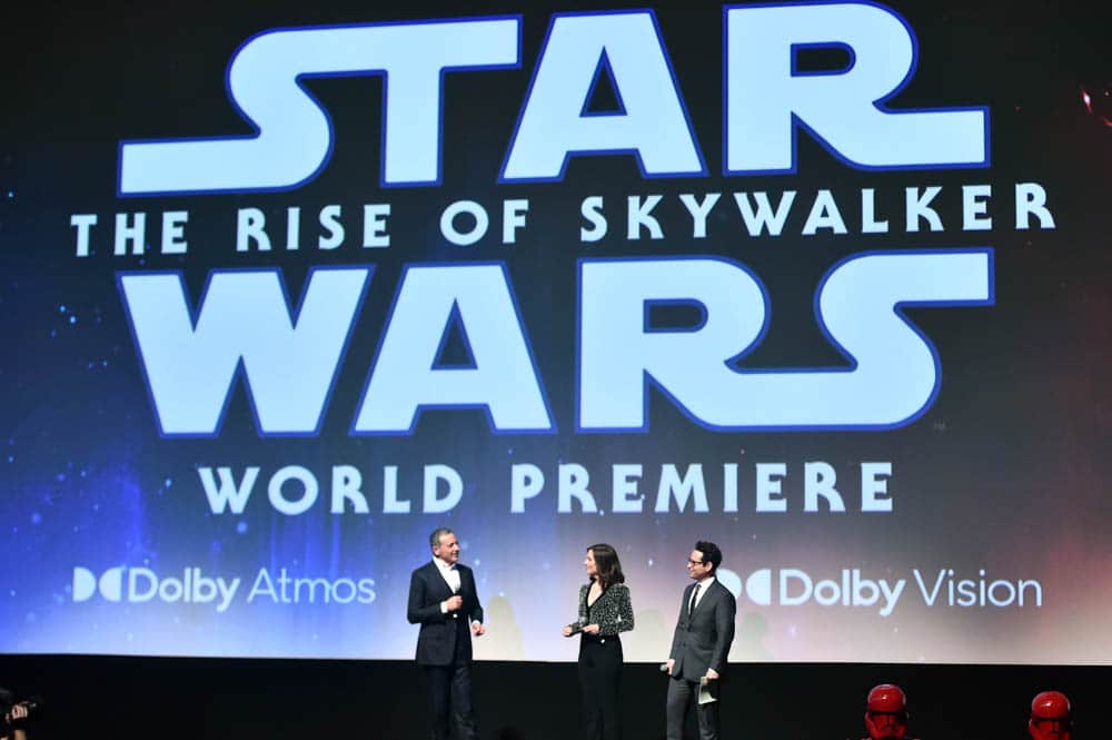 HOLLYWOOD, CALIFORNIA – DECEMBER 16: (L-R) The Walt Disney Company Chairman and CEO Bob Iger, Producer and President of Lucasfilm Kathleen Kennedy and Director, Writer and Producer J.J. Abrams speak onstage during the World Premiere of “Star Wars: The Rise of Skywalker”, the highly anticipated conclusion of the Skywalker saga on December 16, 2019 in Hollywood, California. (Photo by Alberto E. Rodriguez/Getty Images for Disney)