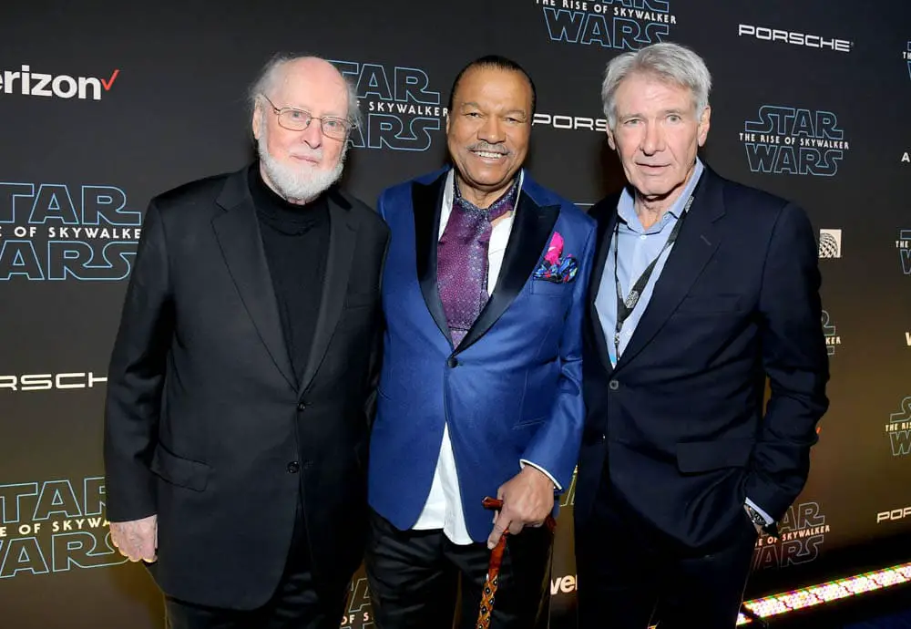 HOLLYWOOD, CALIFORNIA – DECEMBER 16: (L-R) Composer John Williams, Billy Dee Williams and Harrison Ford arrive for the World Premiere of “Star Wars: The Rise of Skywalker”, the highly anticipated conclusion of the Skywalker saga on December 16, 2019 in Hollywood, California. (Photo by Charley Gallay/Getty Images for Disney)