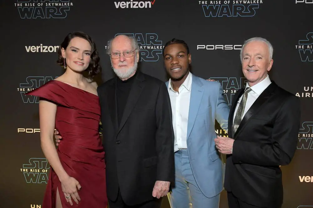 HOLLYWOOD, CALIFORNIA – DECEMBER 16: (L-R) Daisy Ridley, composer John Williams, John Boyega and Anthony Daniels arrive for the World Premiere of “Star Wars: The Rise of Skywalker”, the highly anticipated conclusion of the Skywalker saga on December 16, 2019 in Hollywood, California. (Photo by Charley Gallay/Getty Images for Disney)