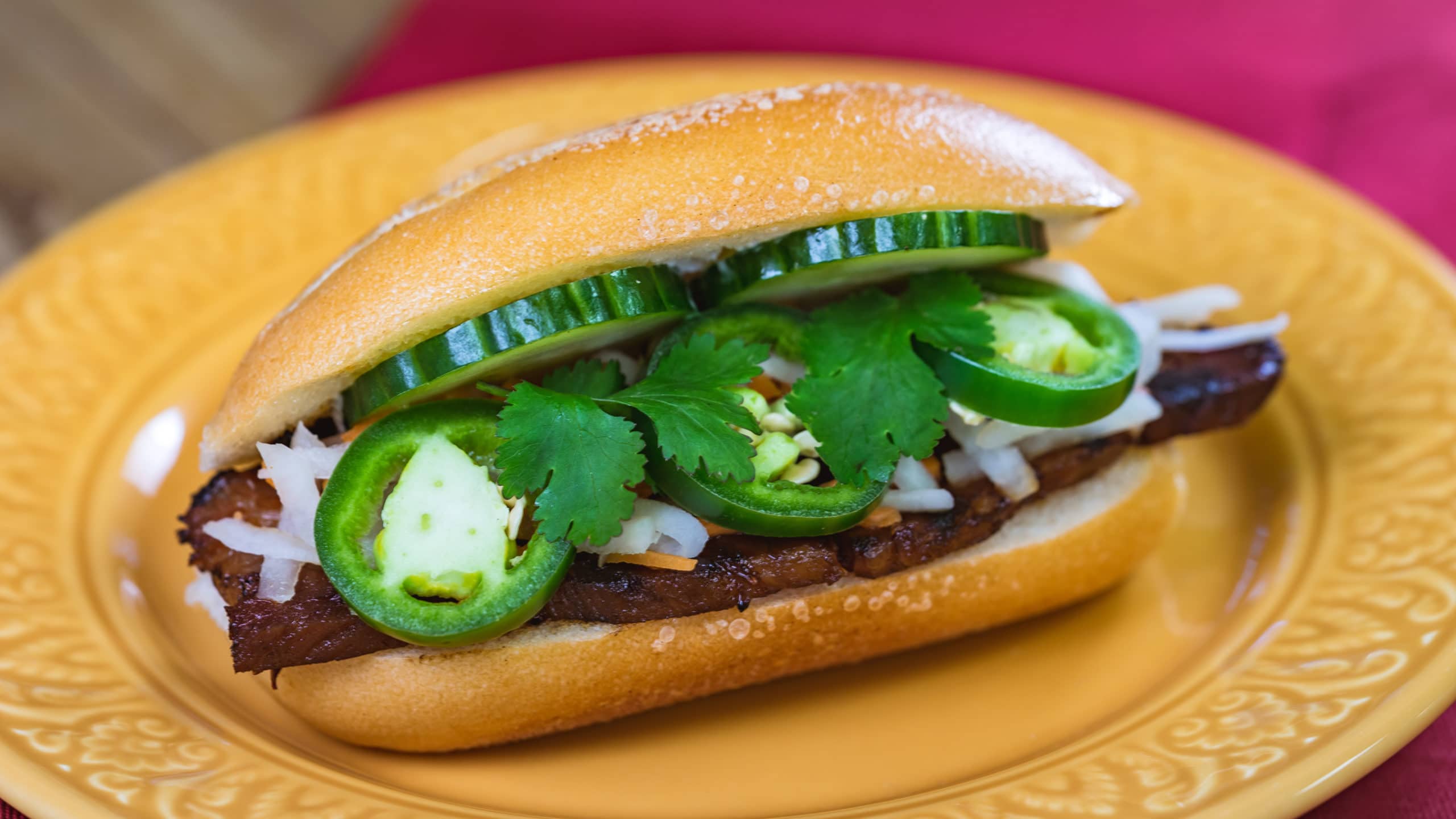 This bahn mi pork sandwich can be found at Disney California Adventure Park as Disneyland Resort celebrates the Year of the Mouse this Lunar New Year, Jan. 17 through Feb. 9, 2020. During the 24 days of this multicultural celebration, guests will enjoy exciting live entertainment and musical performances, plus inspired food and beverage items across festival marketplaces. (David/Nguyen Disneyland Resort)