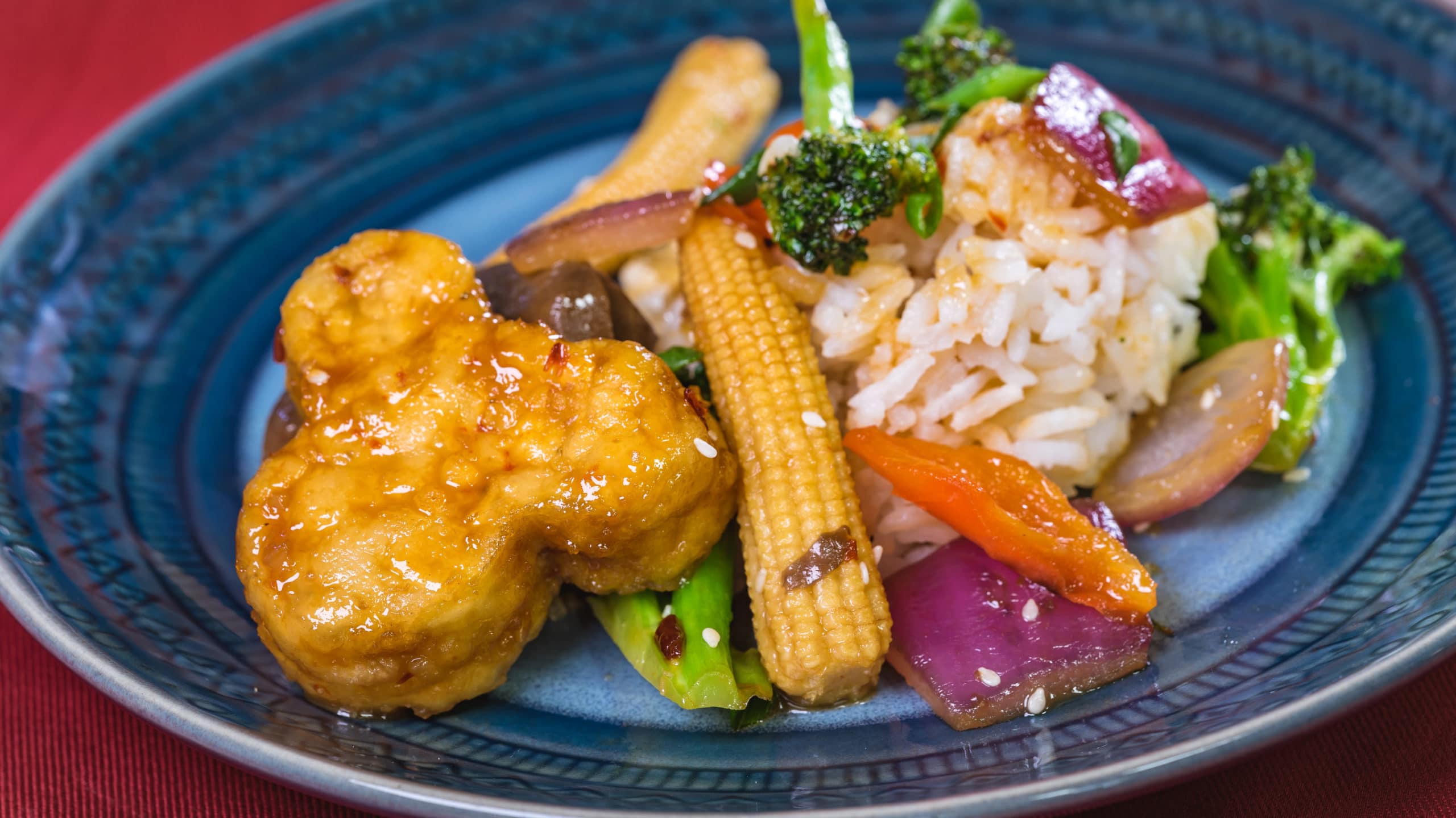 This orange tempeh dish can be found at Disney California Adventure Park as Disneyland Resort celebrates the Year of the Mouse this Lunar New Year, Jan. 17 through Feb. 9, 2020. During the 24 days of this multicultural celebration, guests will enjoy exciting live entertainment and musical performances, plus inspired food and beverage items across festival marketplaces. (David/Nguyen Disneyland Resort)