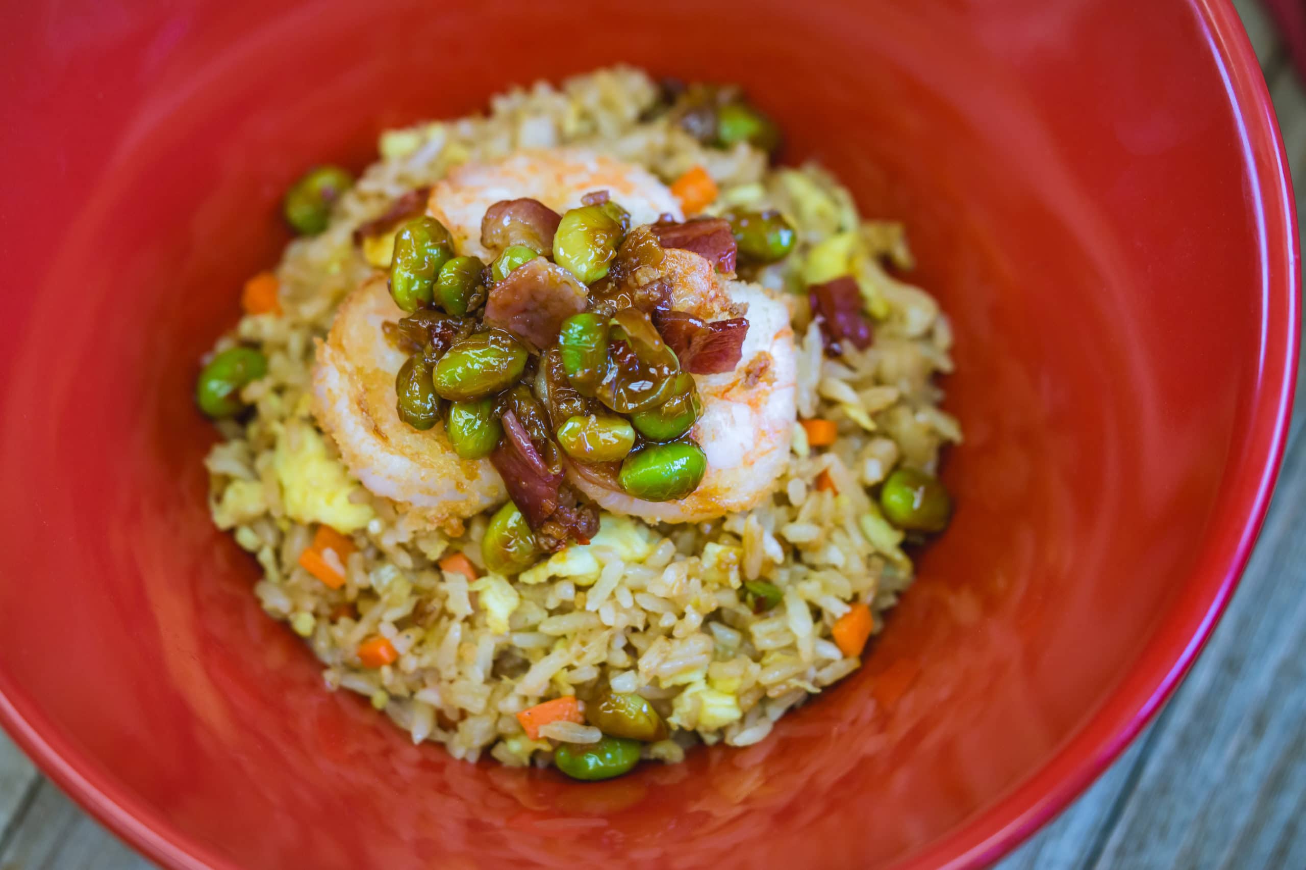This shrimp fried rice with garlic bacon edamame can be found at Disney California Adventure Park as Disneyland Resort celebrates the Year of the Mouse this Lunar New Year, Jan. 17 through Feb. 9, 2020. During the 24 days of this multicultural celebration, guests will enjoy exciting live entertainment and musical performances, plus inspired food and beverage items across festival marketplaces. (David/Nguyen Disneyland Resort)