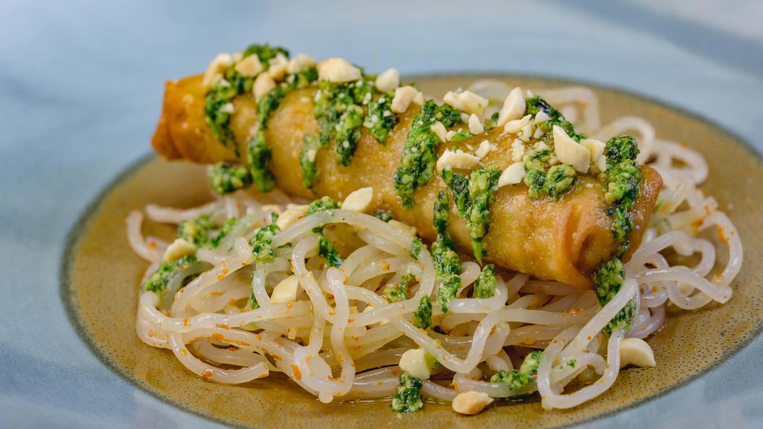 This vegetable egg roll with sesame garlic noodles, cilantro-cashew sauce and toasted potatoes can be found at Disney California Adventure Park as Disneyland Resort celebrates the Year of the Mouse this Lunar New Year, Jan. 17 through Feb. 9, 2020. During the 24 days of this multicultural celebration, guests will enjoy exciting live entertainment and musical performances, plus inspired food and beverage items across festival marketplaces. (David/Nguyen Disneyland Resort)