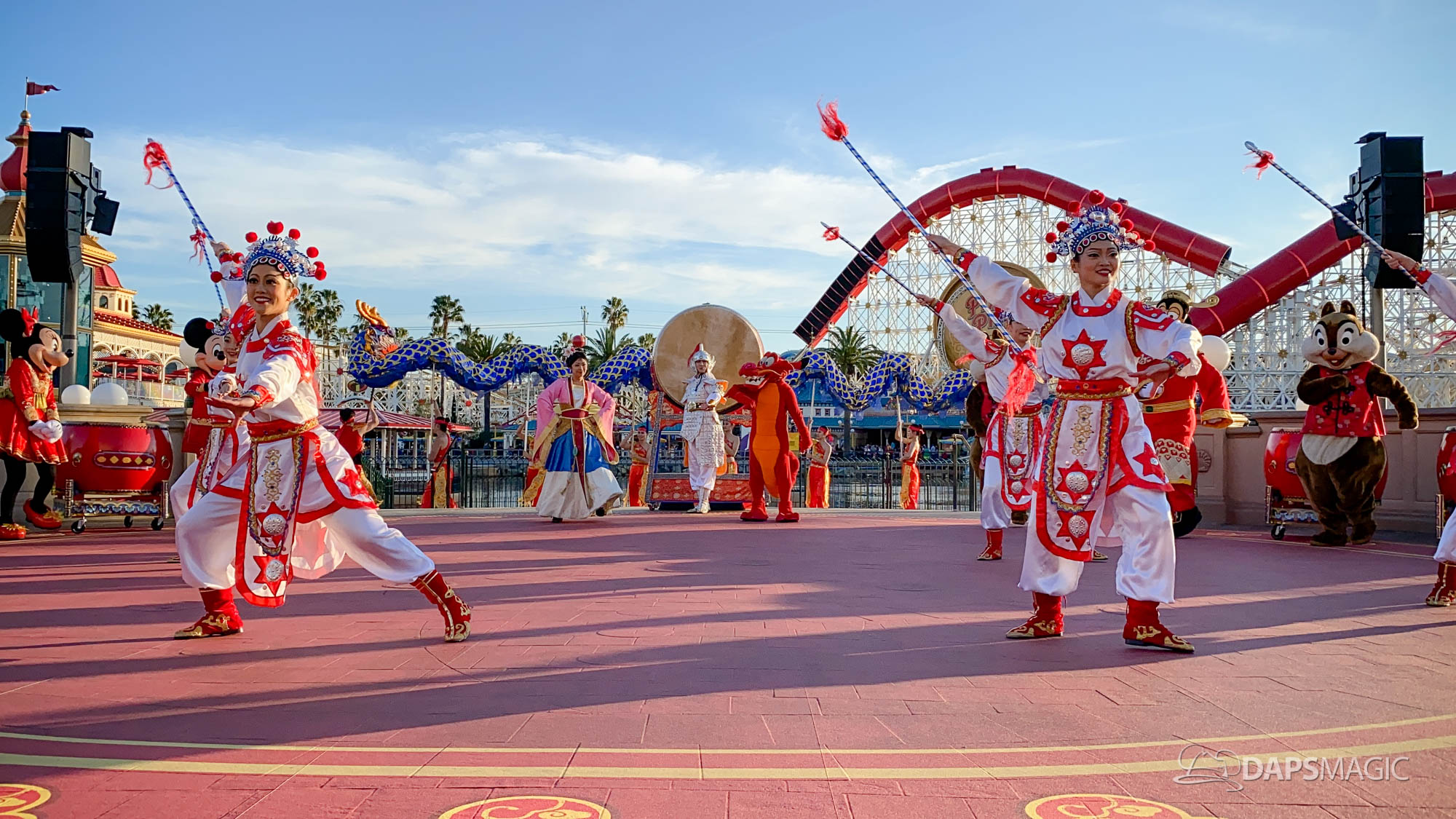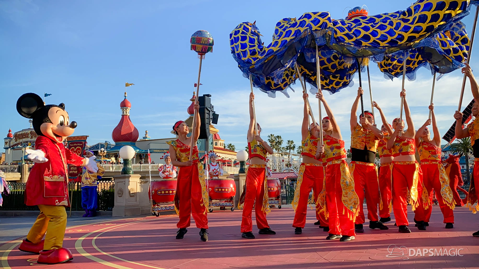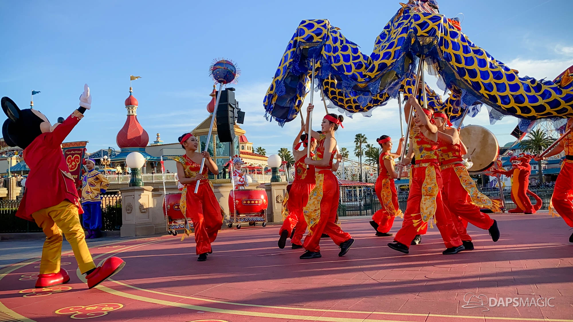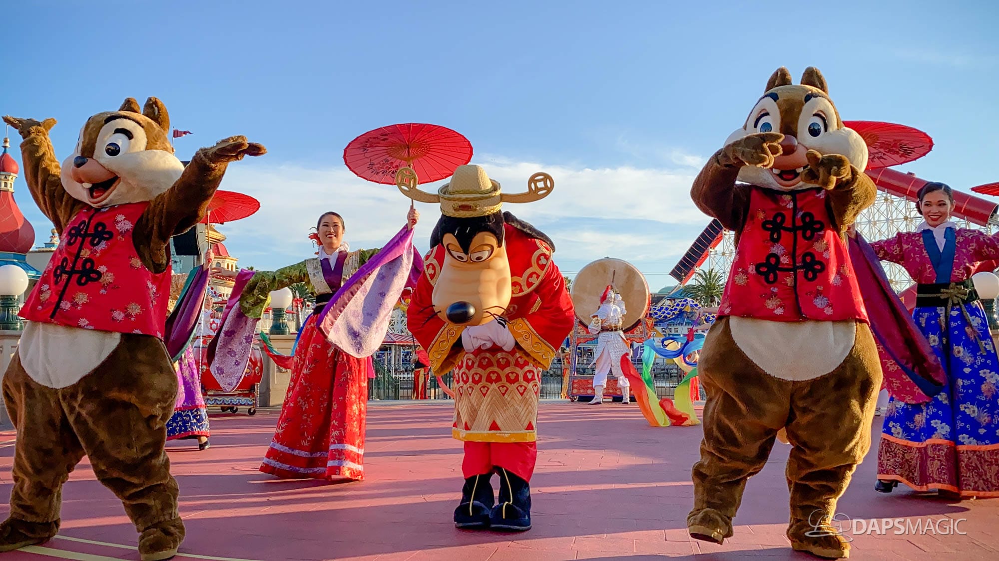Because it is the Year of the Mouse, this year Mickey Mouse and Minnie Mouse are a part of Mulan’s Lunar New Year Procession (photos below). This procession takes place daily during the Lunar New Year Celebration. Mulan and Mushu are joined by Mickey, Minnie, Goofy, Chip & Dale along with performers for this procession. The dancers showcase dancing, martial arts, and drumming throughout the course of the performance.