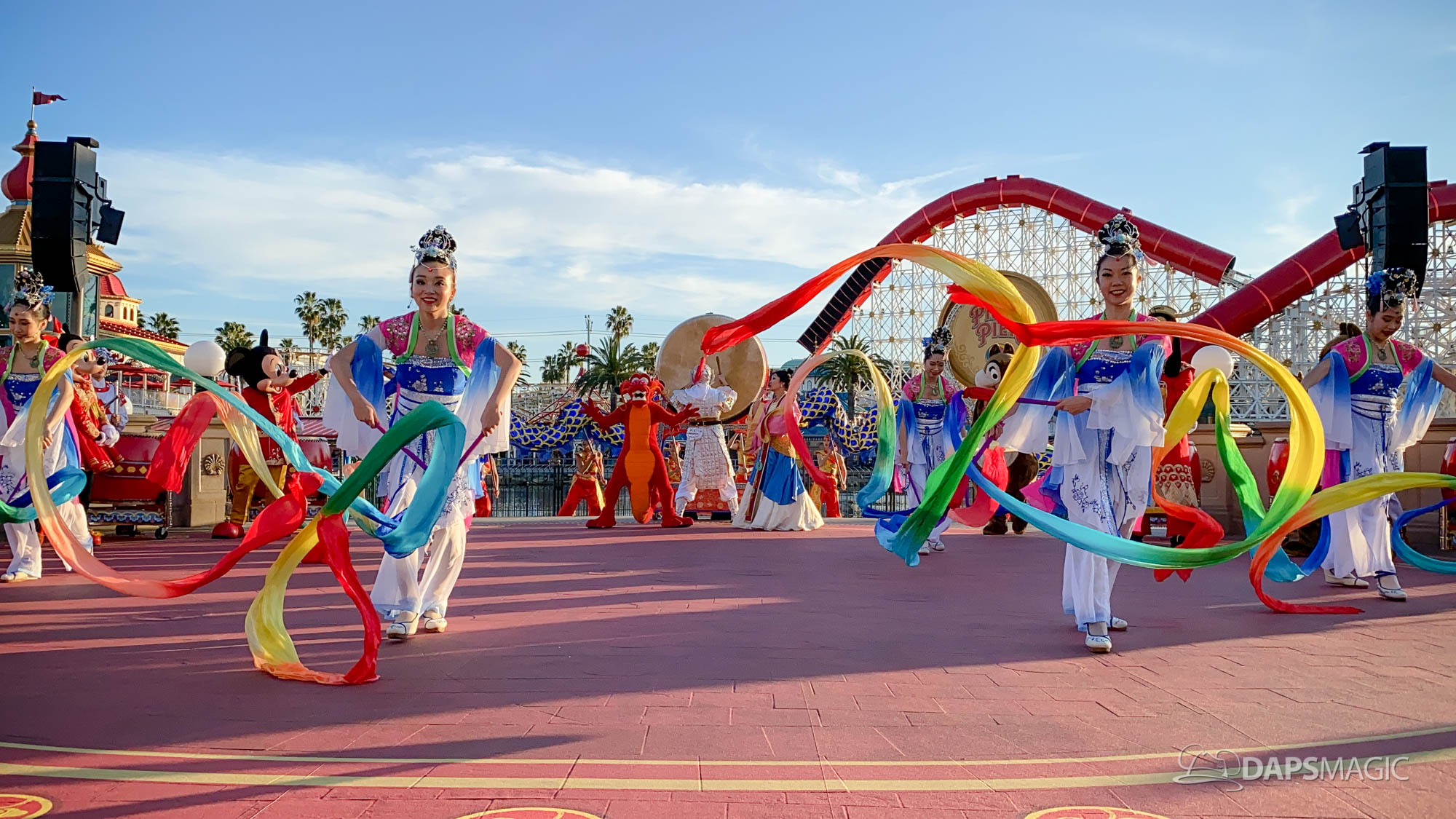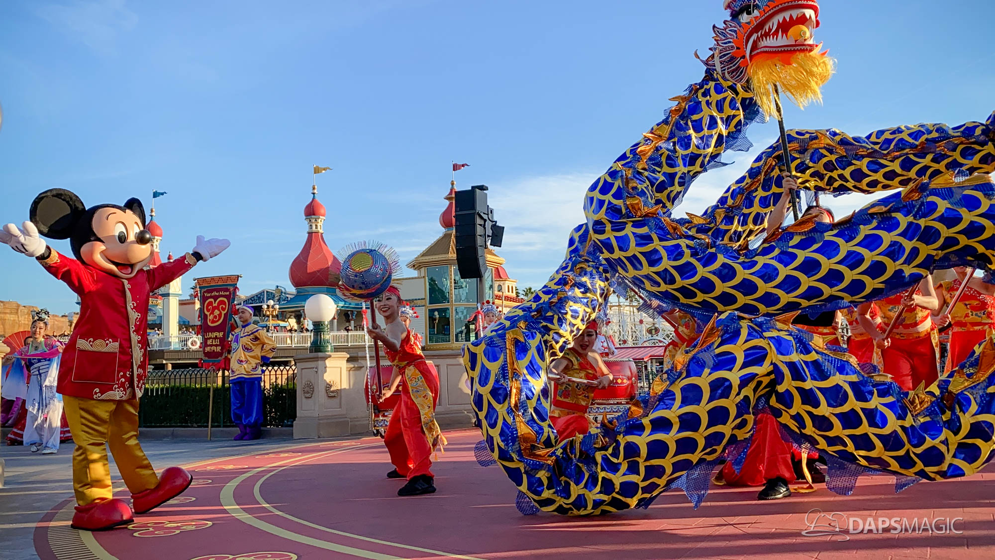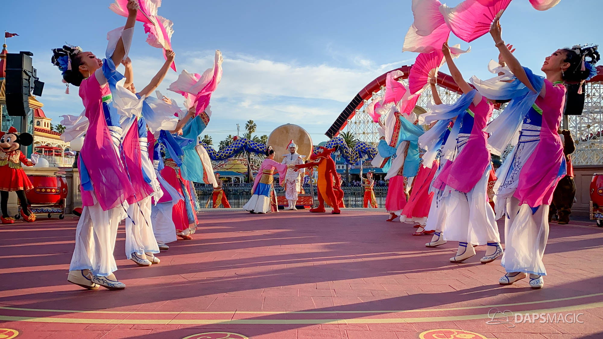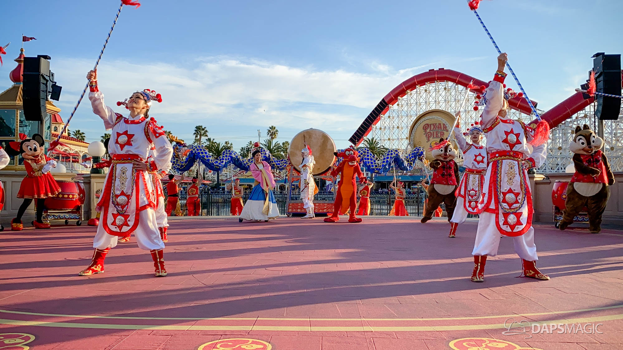 Because it is the Year of the Mouse, this year Mickey Mouse and Minnie Mouse are a part of Mulan’s Lunar New Year Procession (photos below). This procession takes place daily during the Lunar New Year Celebration. Mulan and Mushu are joined by Mickey, Minnie, Goofy, Chip & Dale along with performers for this procession. The dancers showcase dancing, martial arts, and drumming throughout the course of the performance.