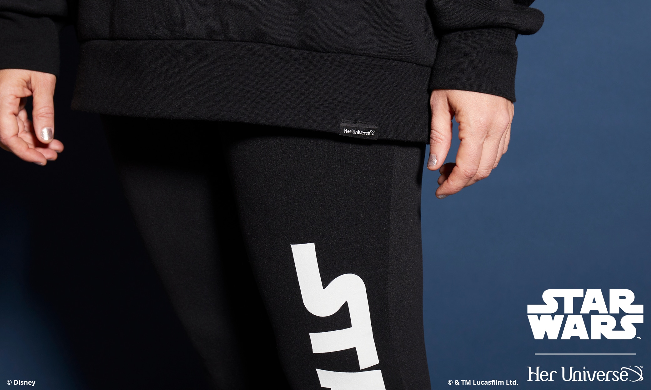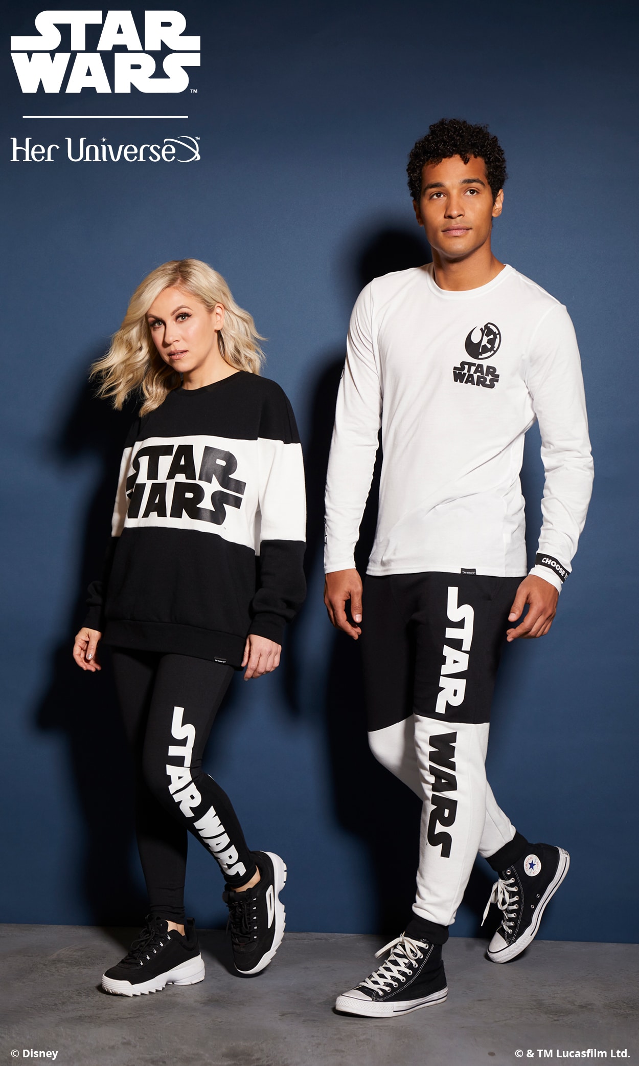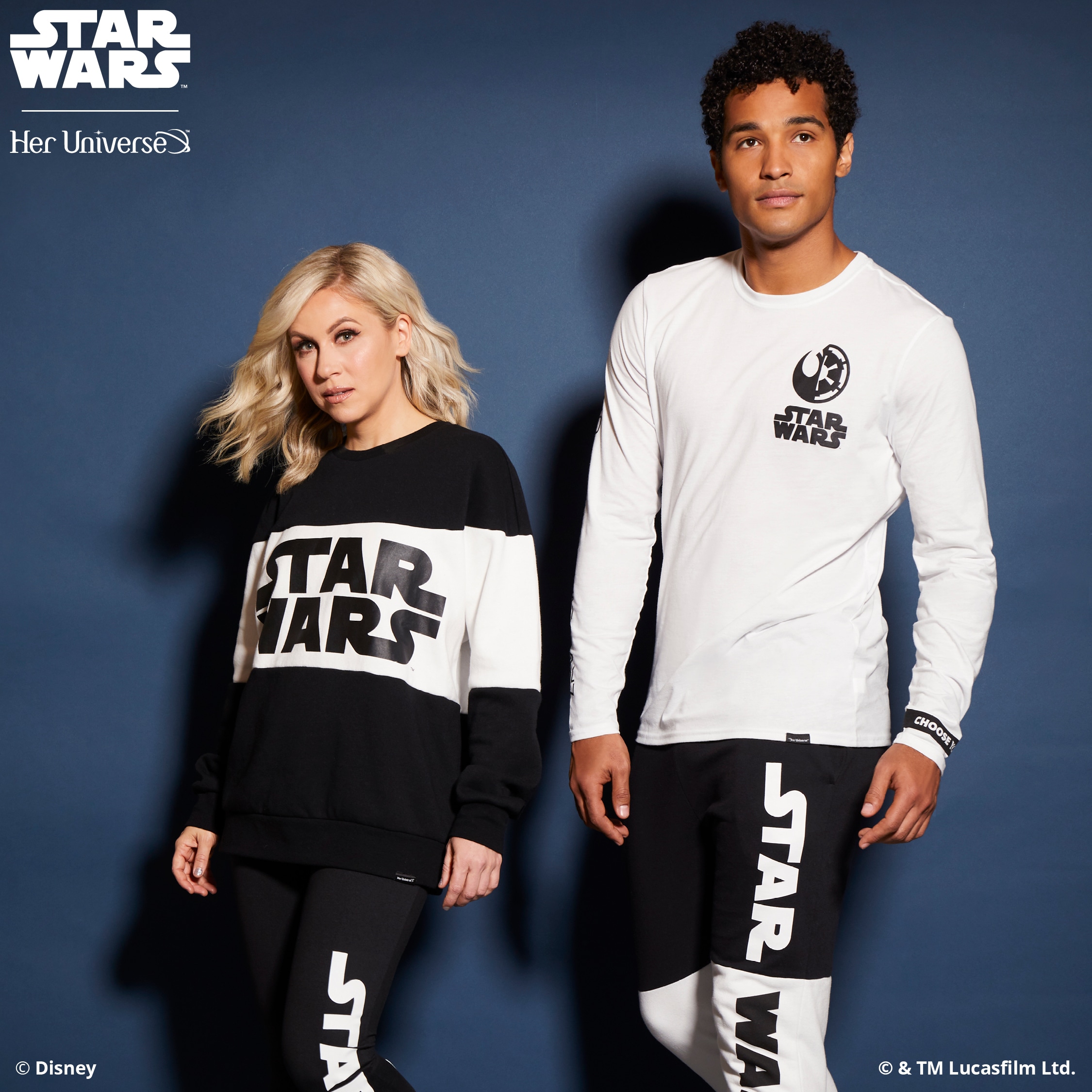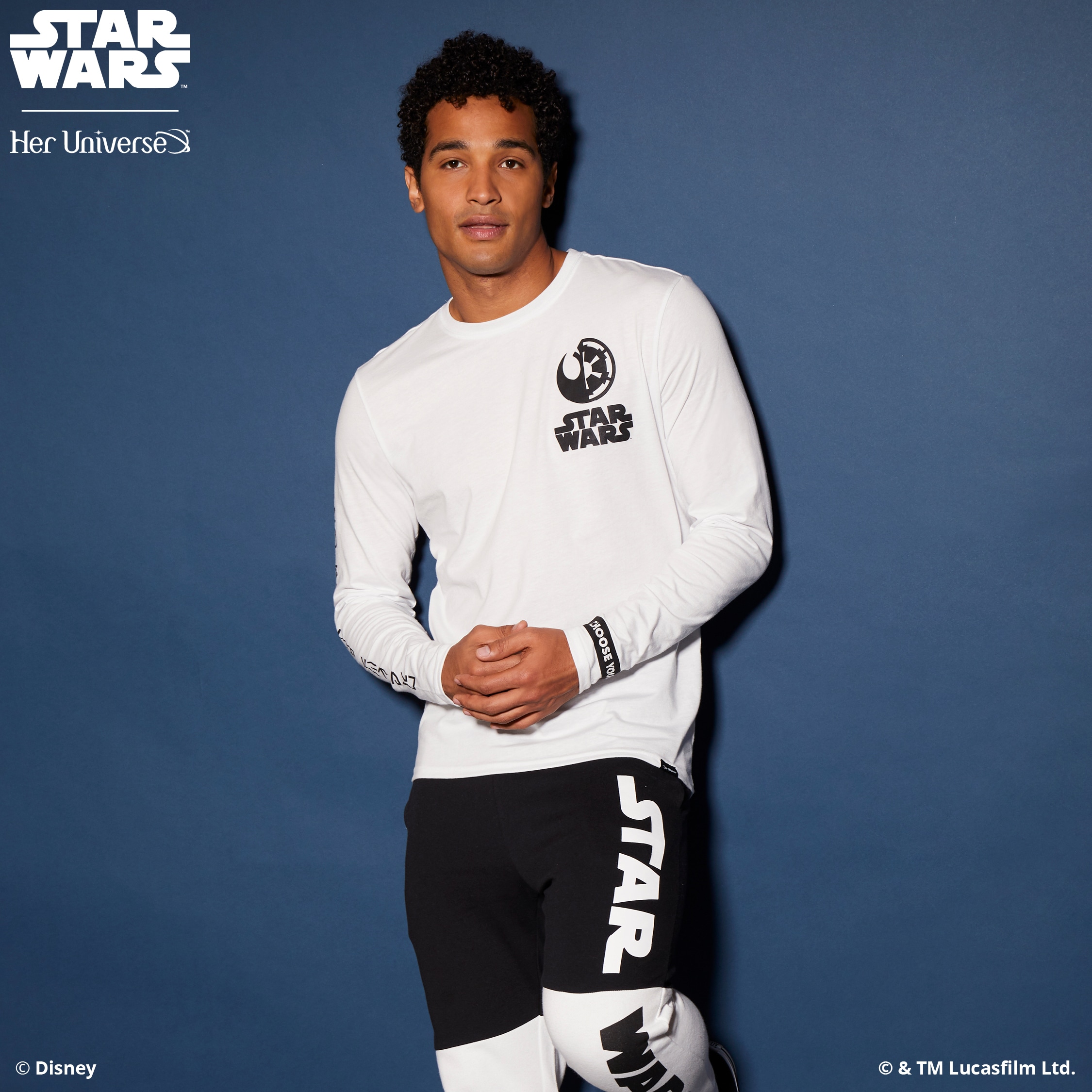 Inspired by ‘90s fashion trends and a black and white color palette, this collection is perfectly balanced and gives fans the opportunity to proudly wear their fandom in a fashion-forward way. With bold Star Wars logos, both Rebel and Imperial symbols and the classic phrase, “May the Force Be with You,” there is something for everyone with this simple and sleek collection. Several pieces even feature a hidden, inside trim with the reminder to “Choose Your Destiny.”