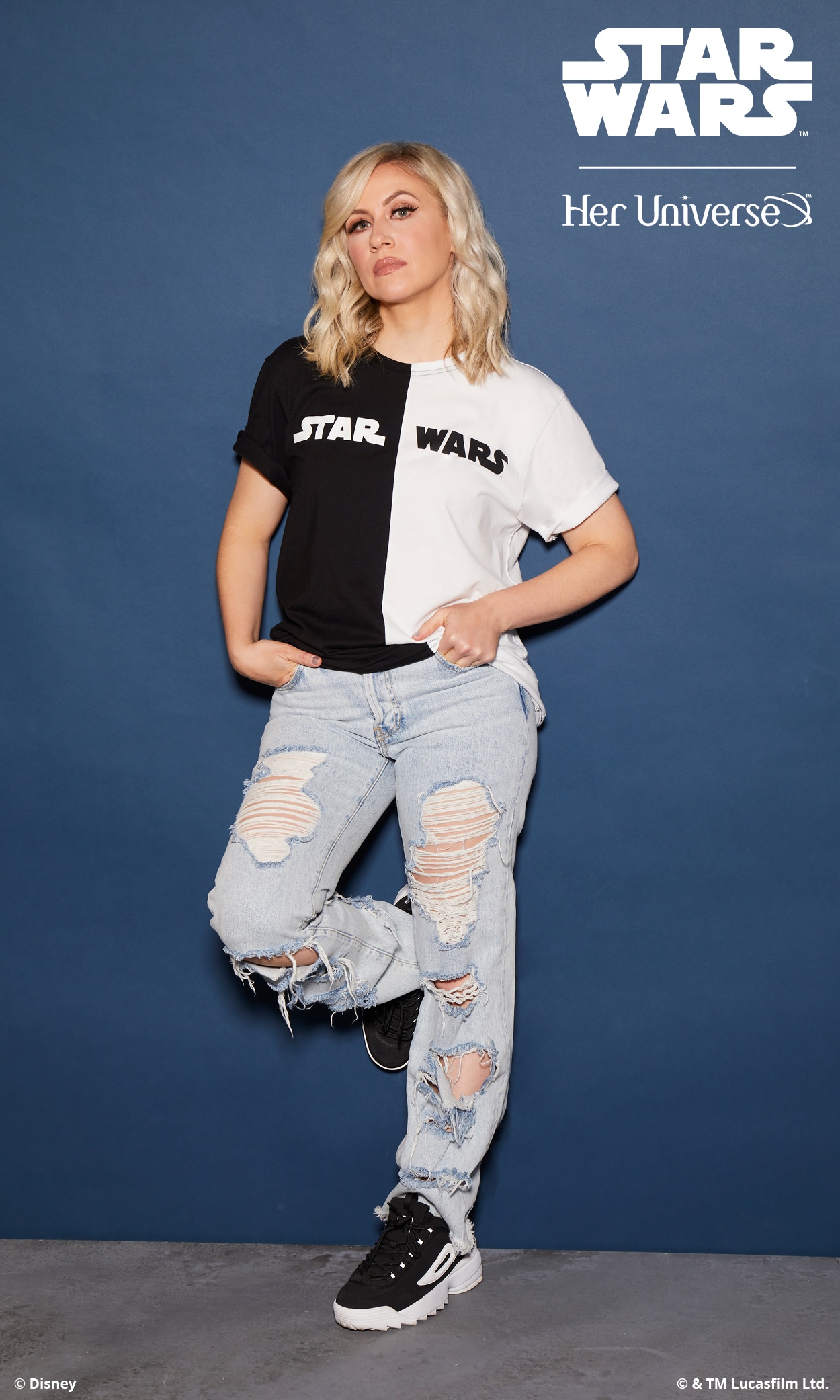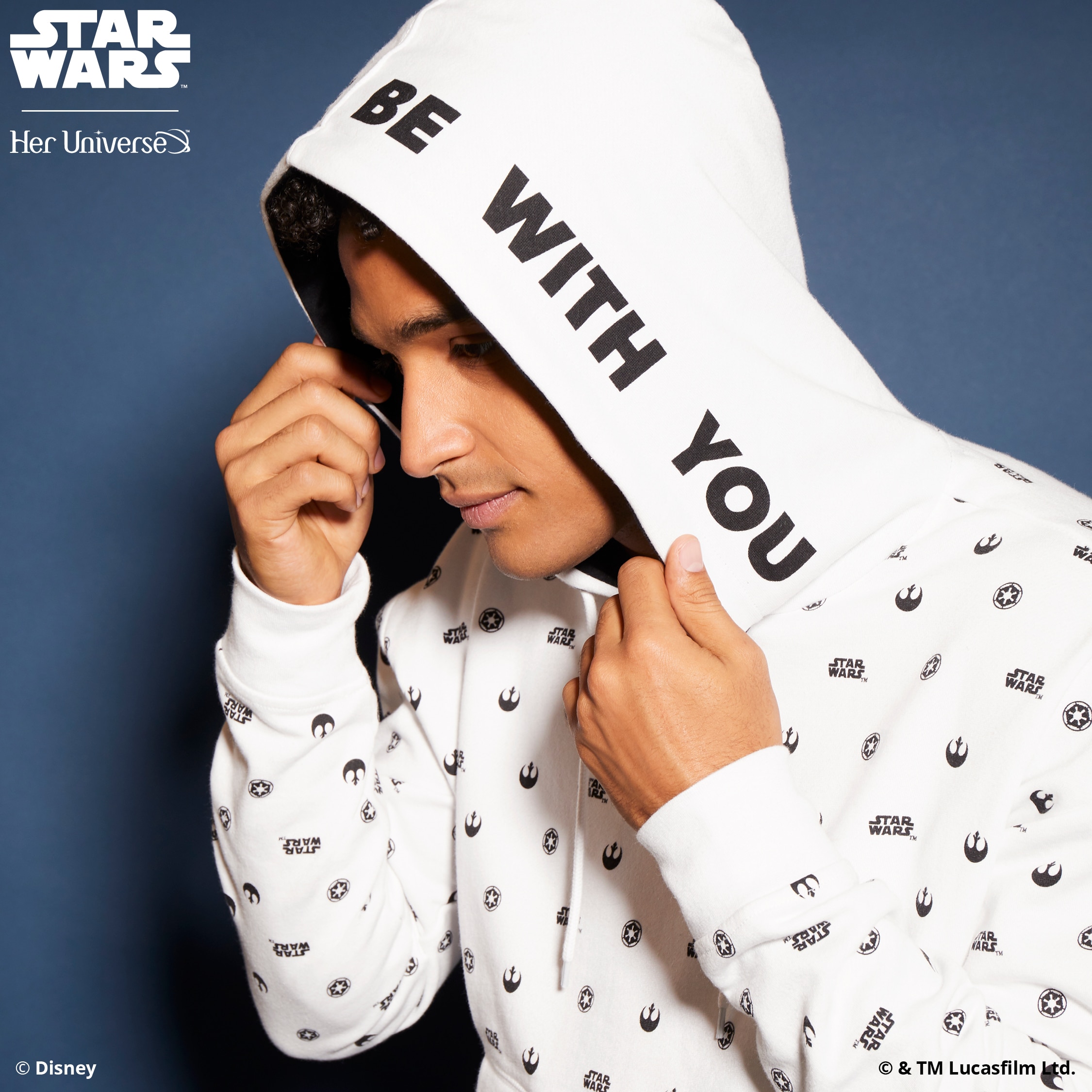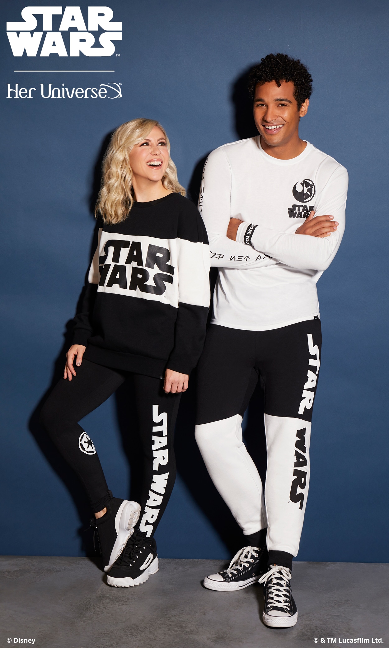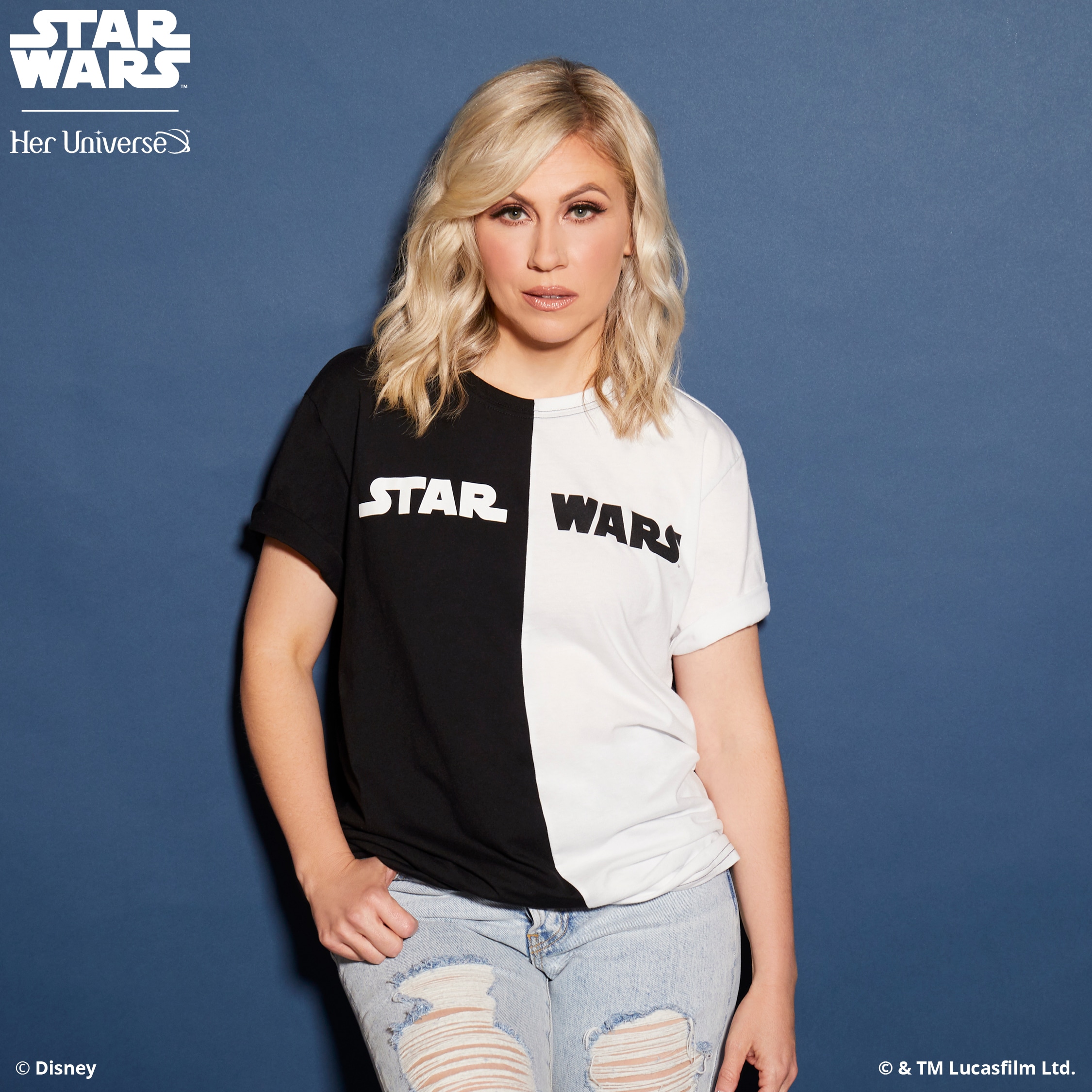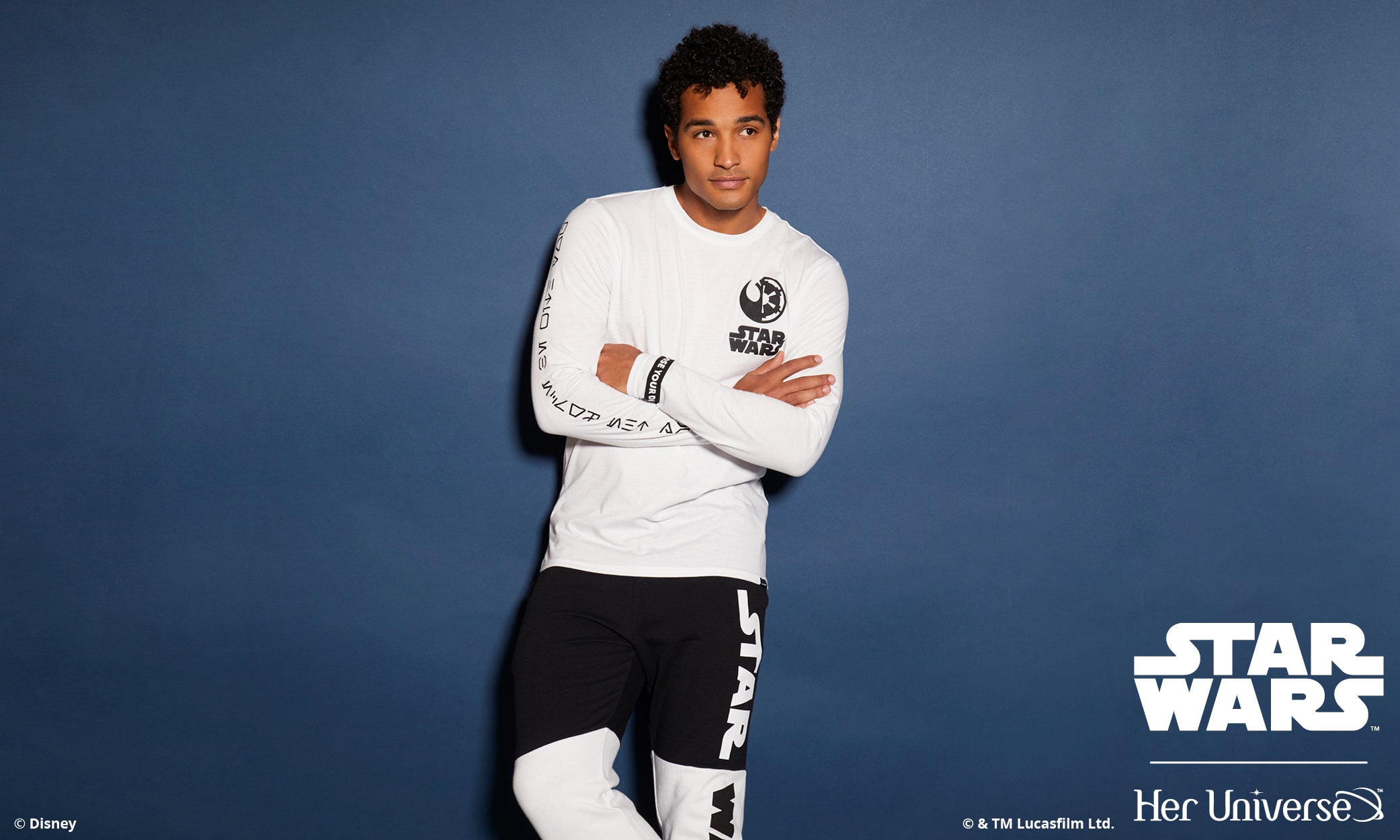 Inspired by ‘90s fashion trends and a black and white color palette, this collection is perfectly balanced and gives fans the opportunity to proudly wear their fandom in a fashion-forward way. With bold Star Wars logos, both Rebel and Imperial symbols and the classic phrase, “May the Force Be with You,” there is something for everyone with this simple and sleek collection. Several pieces even feature a hidden, inside trim with the reminder to “Choose Your Destiny.”