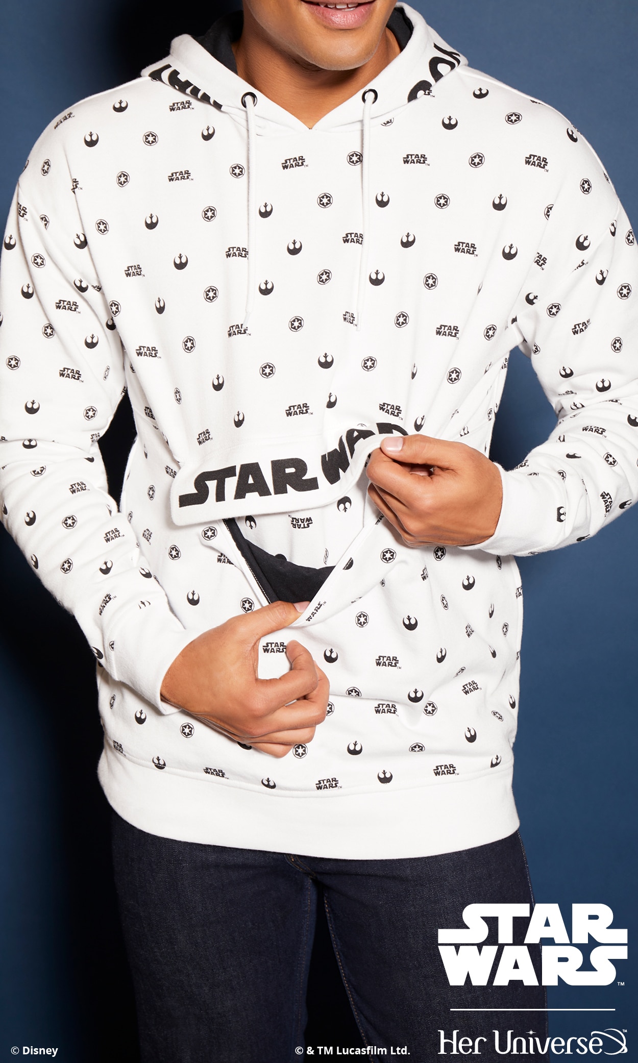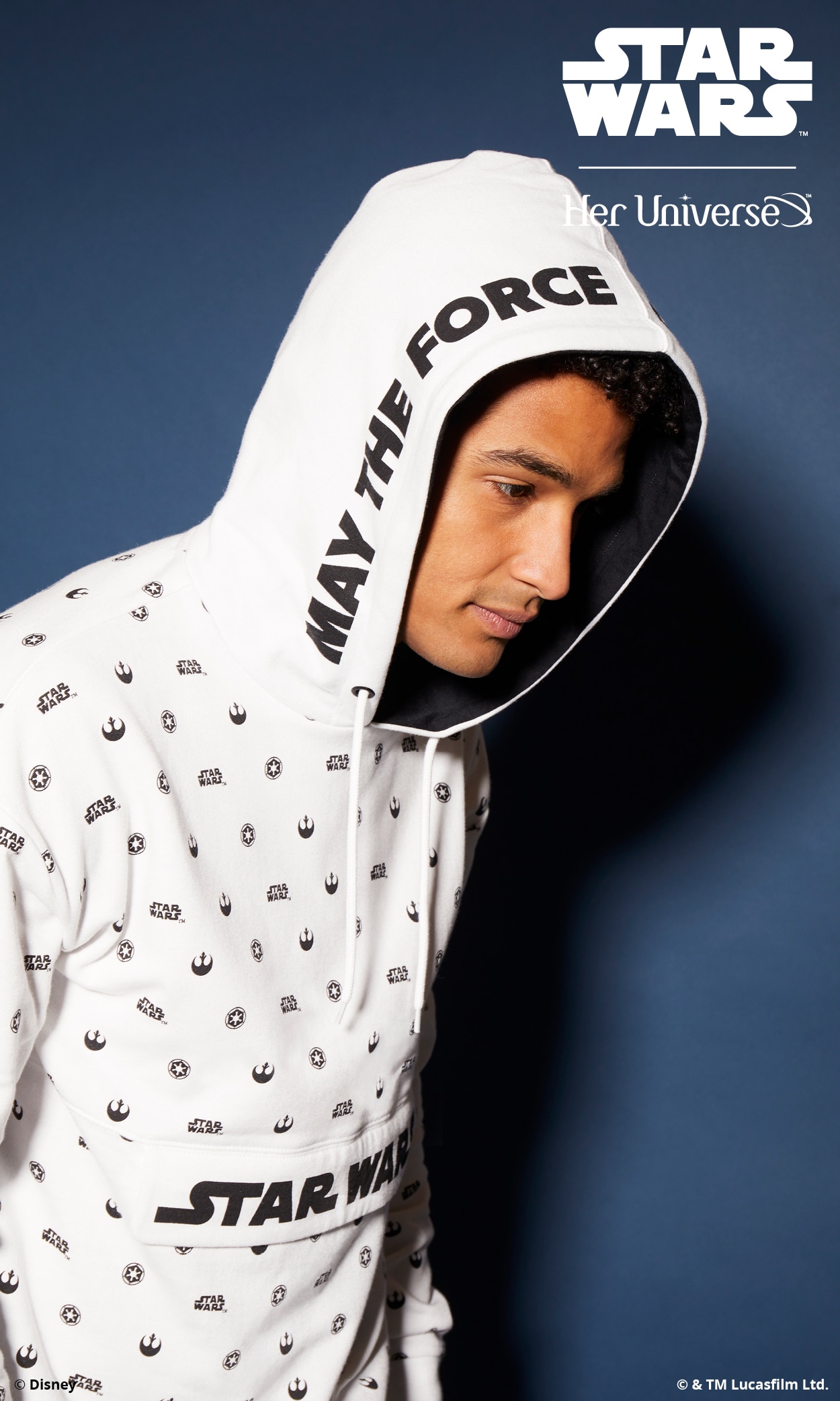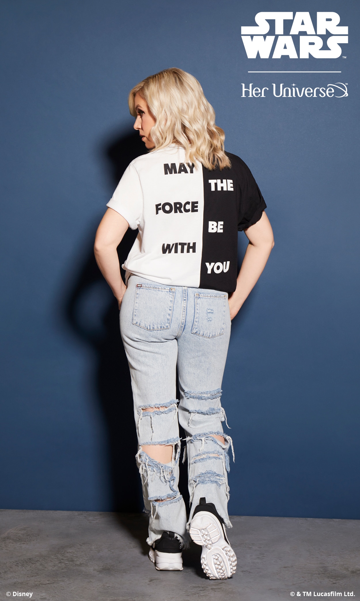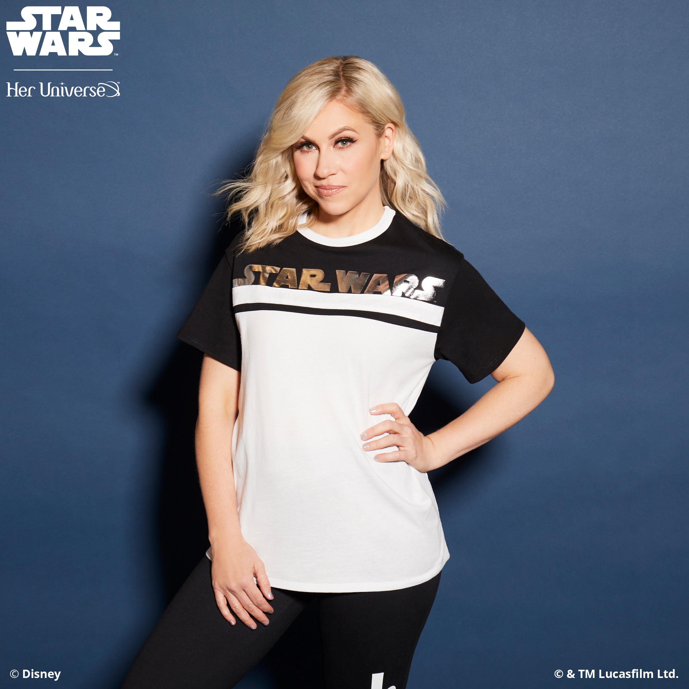 Inspired by ‘90s fashion trends and a black and white color palette, this collection is perfectly balanced and gives fans the opportunity to proudly wear their fandom in a fashion-forward way. With bold Star Wars logos, both Rebel and Imperial symbols and the classic phrase, “May the Force Be with You,” there is something for everyone with this simple and sleek collection. Several pieces even feature a hidden, inside trim with the reminder to “Choose Your Destiny.”