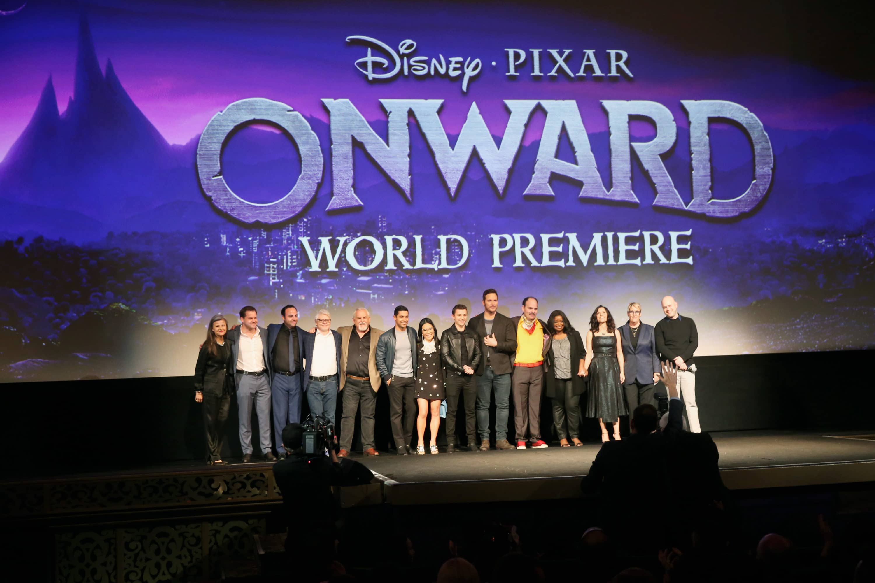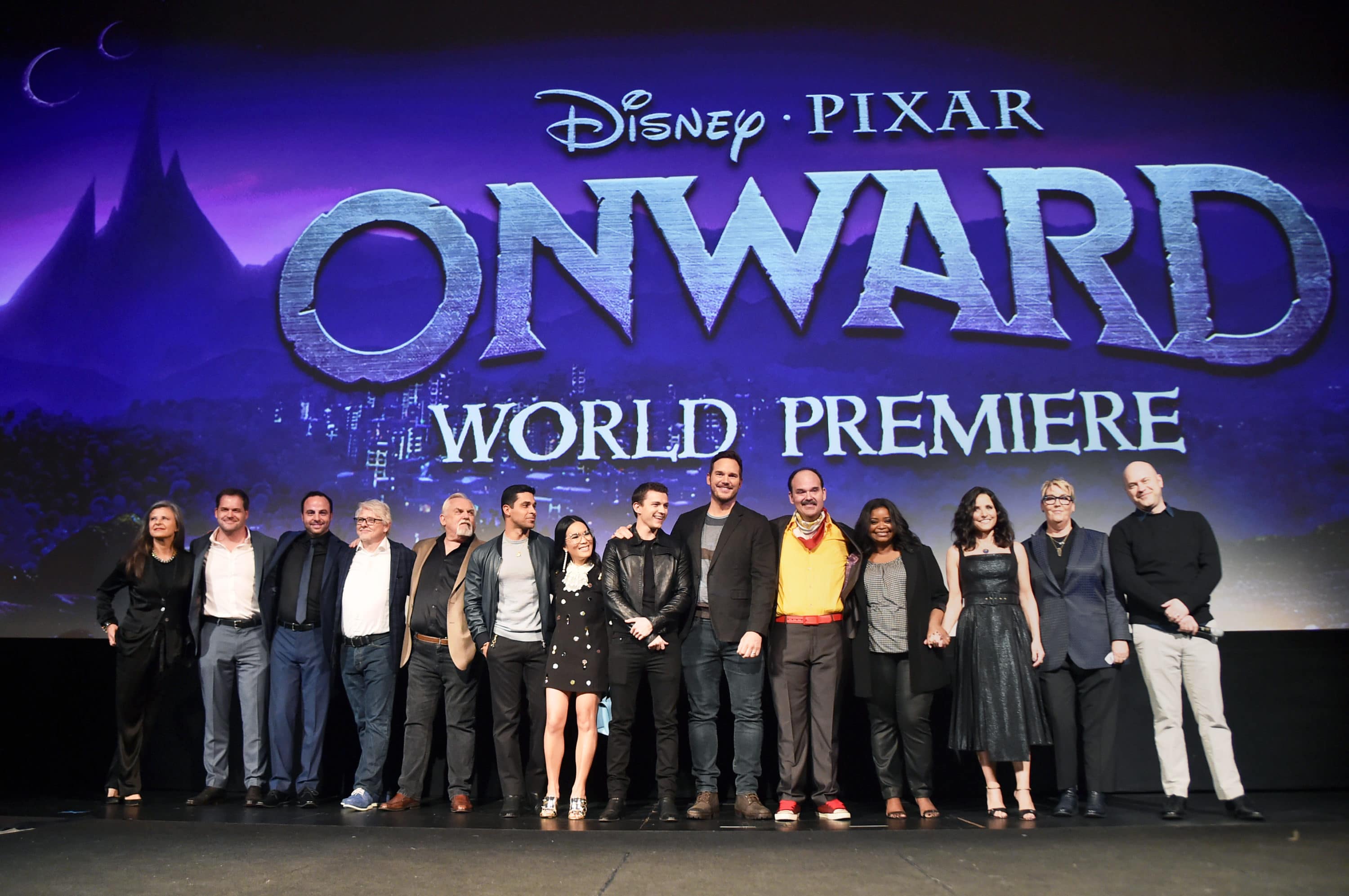 HOLLYWOOD, CALIFORNIA – FEBRUARY 18: (L-R) Tracey Ullman, Kyle Bornheimer, George Psarras, Dave Foley, John Ratzenberger, Wilmer Valderrama, Ali Wong, Tom Holland, Chris Pratt, Mel Rodriguez, Octavia Spencer, Julia Louis-Dreyfus, Producer Kori Rae, and Director/screenwriter Dan Scanlon speak onstage at the world premiere of Disney and Pixar’s ONWARD at the El Capitan Theatre on February 18, 2020 in Hollywood, California. (Photo by Alberto E. Rodriguez/Getty Images for Disney)