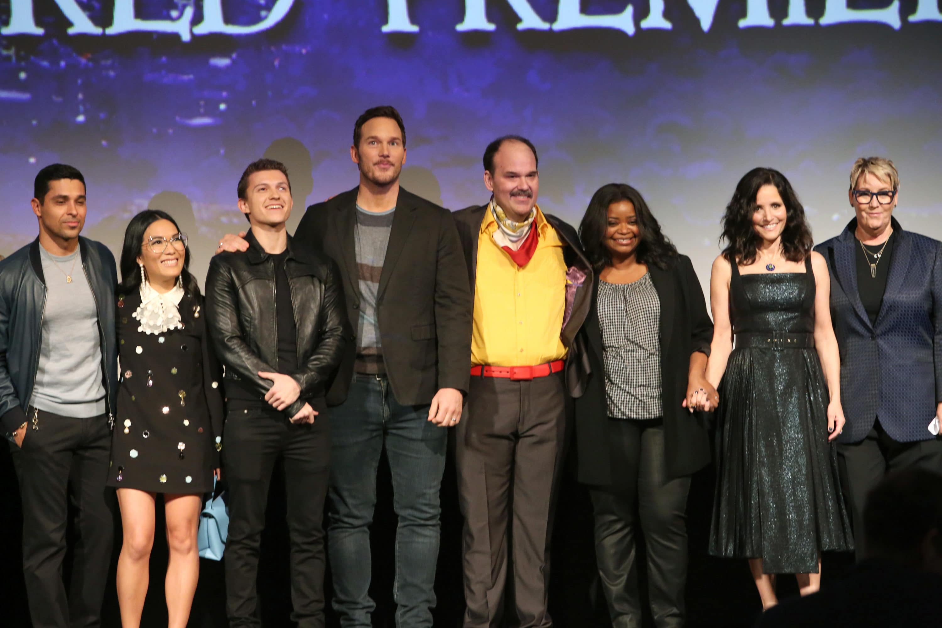 HOLLYWOOD, CALIFORNIA – FEBRUARY 18: (L-R) Wilmer Valderrama, Ali Wong, Tom Holland, Chris Pratt, Mel Rodriguez, Octavia Spencer, Julia Louis-Dreyfus, and Producer Kori Rae speak onstage at the world premiere of Disney and Pixar’s ONWARD at the El Capitan Theatre on February 18, 2020 in Hollywood, California. (Photo by Jesse Grant/Getty Images for Disney)