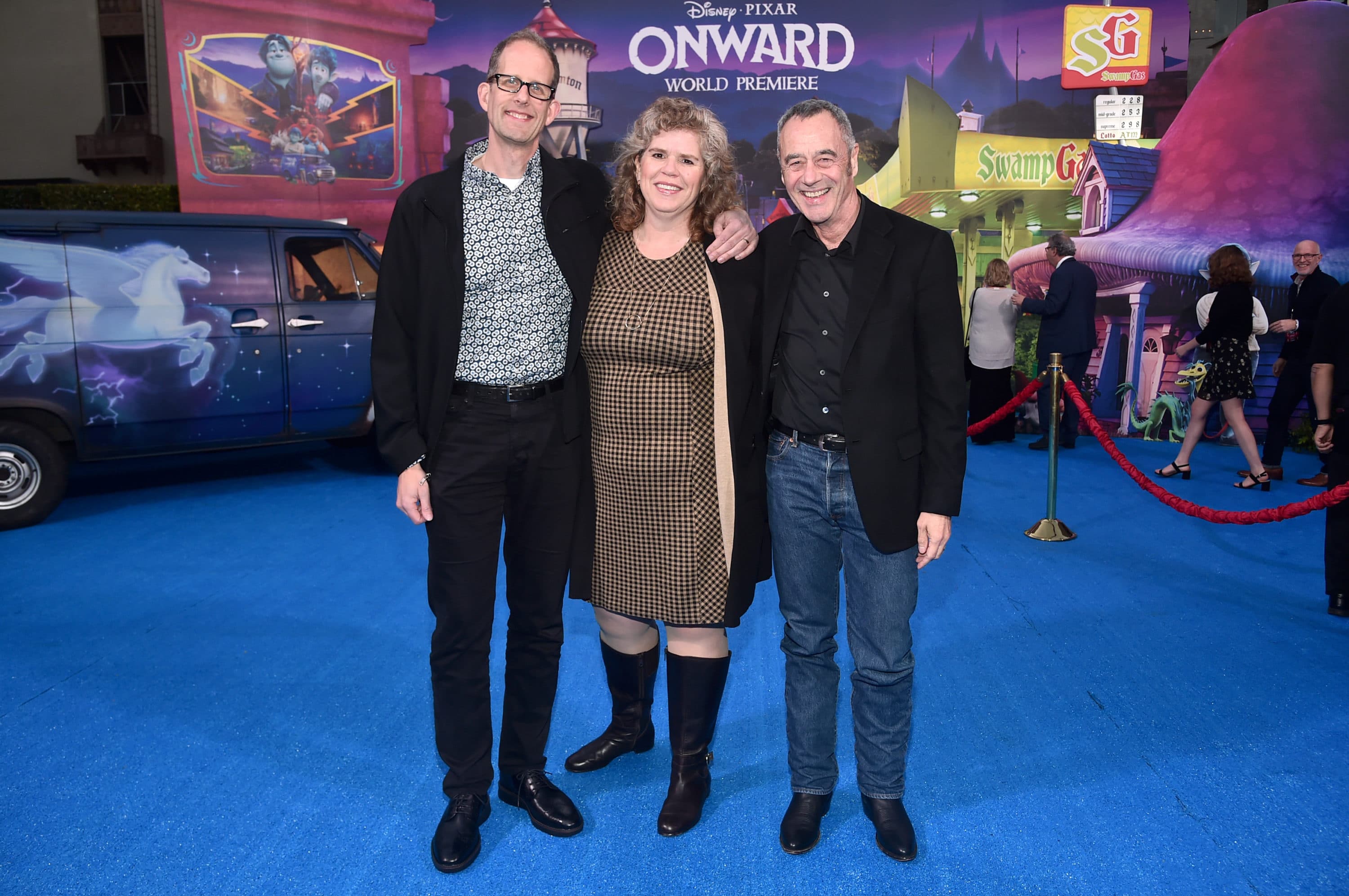 HOLLYWOOD, CALIFORNIA – FEBRUARY 18: (L-R) Executive producer Pete Docter, Amanda Docter, and President of Pixar Animation Studios Jim Morris attend the world premiere of Disney and Pixar’s ONWARD at the El Capitan Theatre on February 18, 2020 in Hollywood, California. (Photo by Alberto E. Rodriguez/Getty Images for Disney)