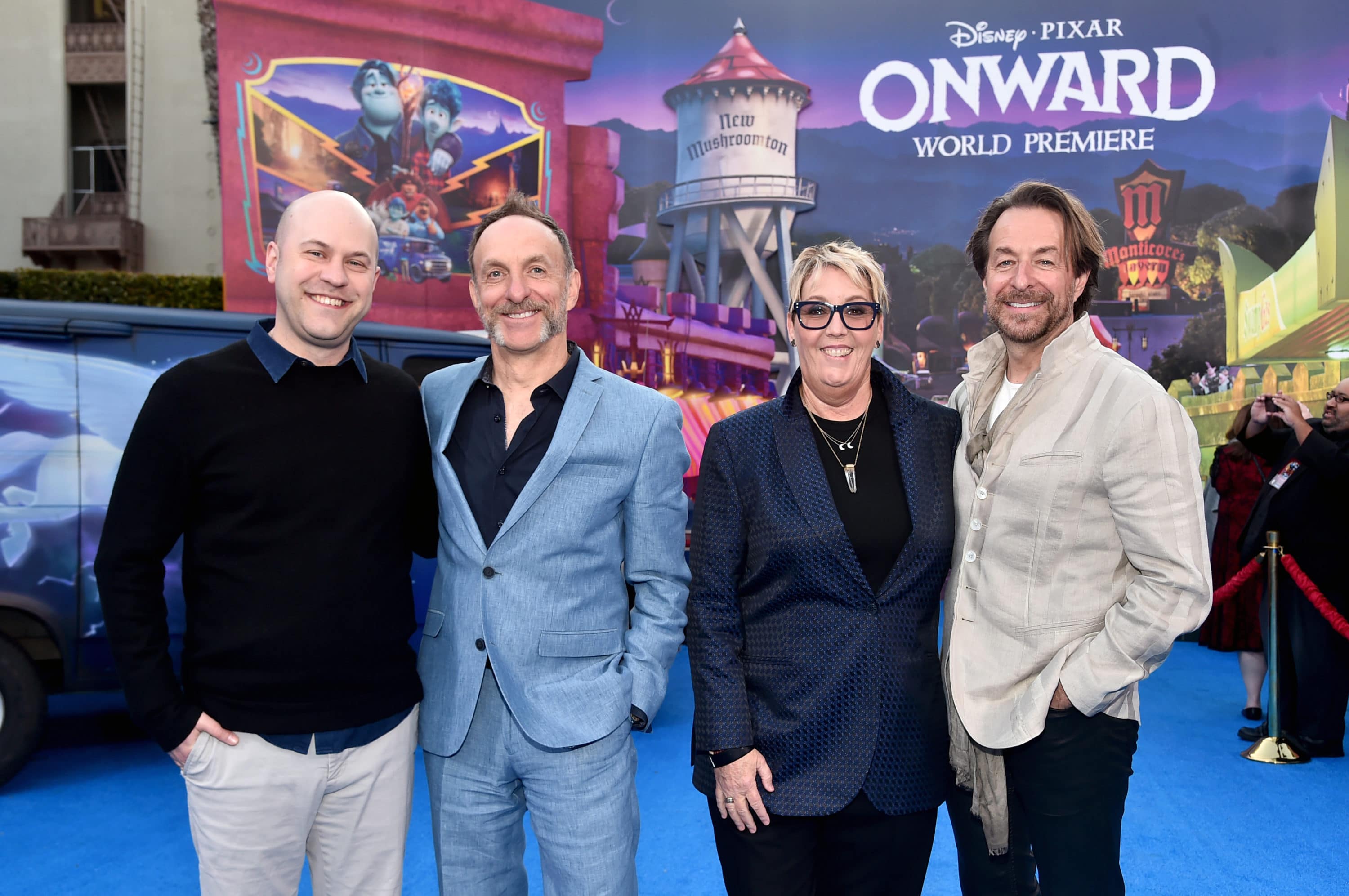 HOLLYWOOD, CALIFORNIA – FEBRUARY 18: (L-R) Dave Foley, George Psarras, Director/screenwriter Dan Scanlon, and Producer Kori Rae attend the world premiere of Disney and Pixar’s ONWARD at the El Capitan Theatre on February 18, 2020 in Hollywood, California. (Photo by Alberto E. Rodriguez/Getty Images for Disney)