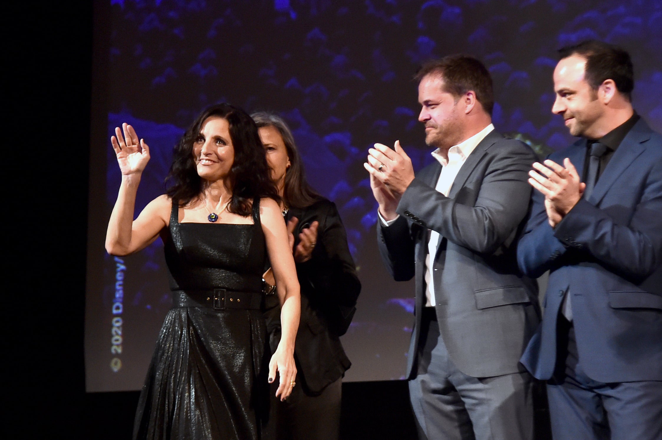 HOLLYWOOD, CALIFORNIA – FEBRUARY 18: (L-R) Julia Louis-Dreyfus, Kyle Bornheimer, and George Psarras speak onstage at the world premiere of Disney and Pixar’s ONWARD at the El Capitan Theatre on February 18, 2020 in Hollywood, California. (Photo by Alberto E. Rodriguez/Getty Images for Disney)
